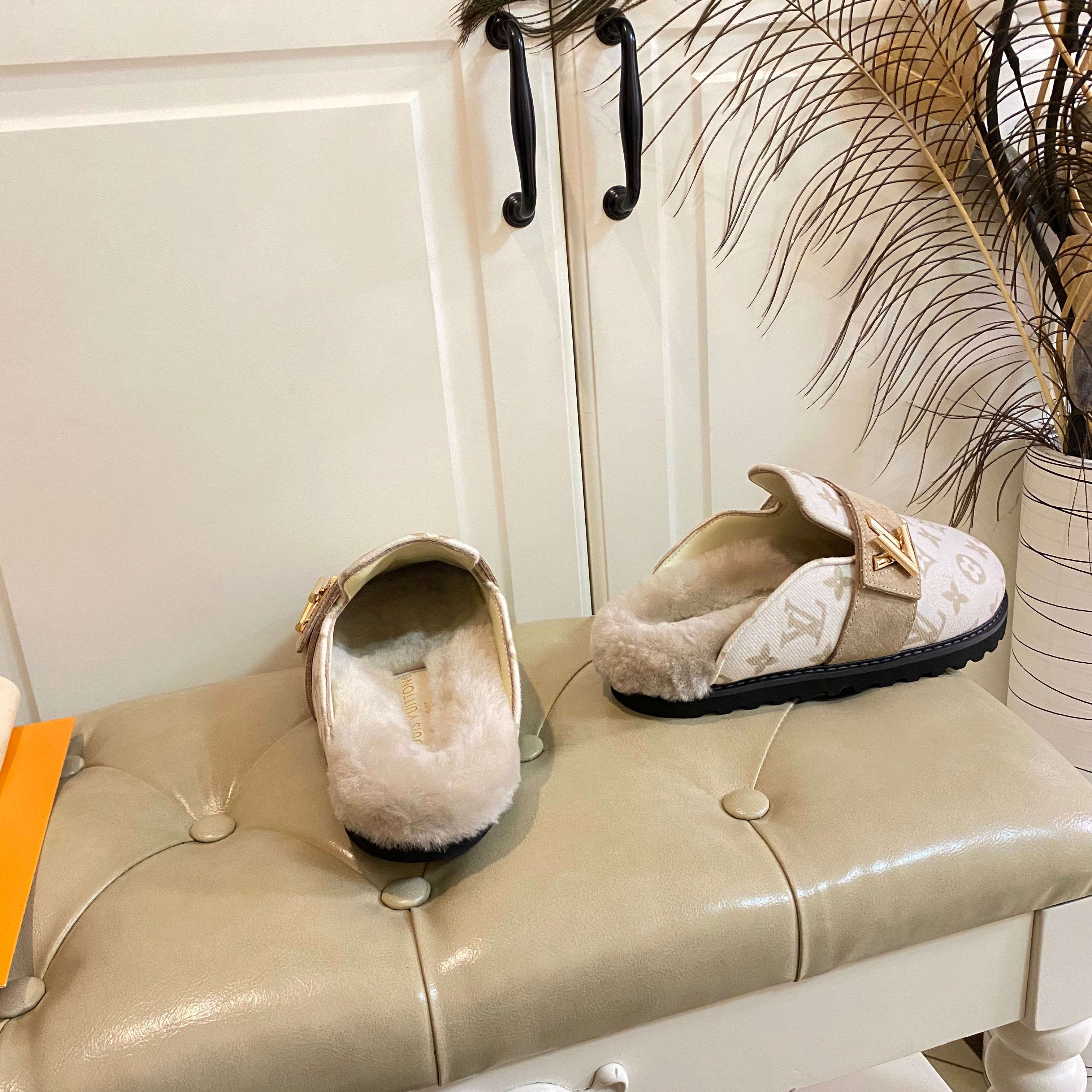 COSY FLAT COMFORT CLOG IN BEIGE MONOGRAM FABRIC AND SUEDE