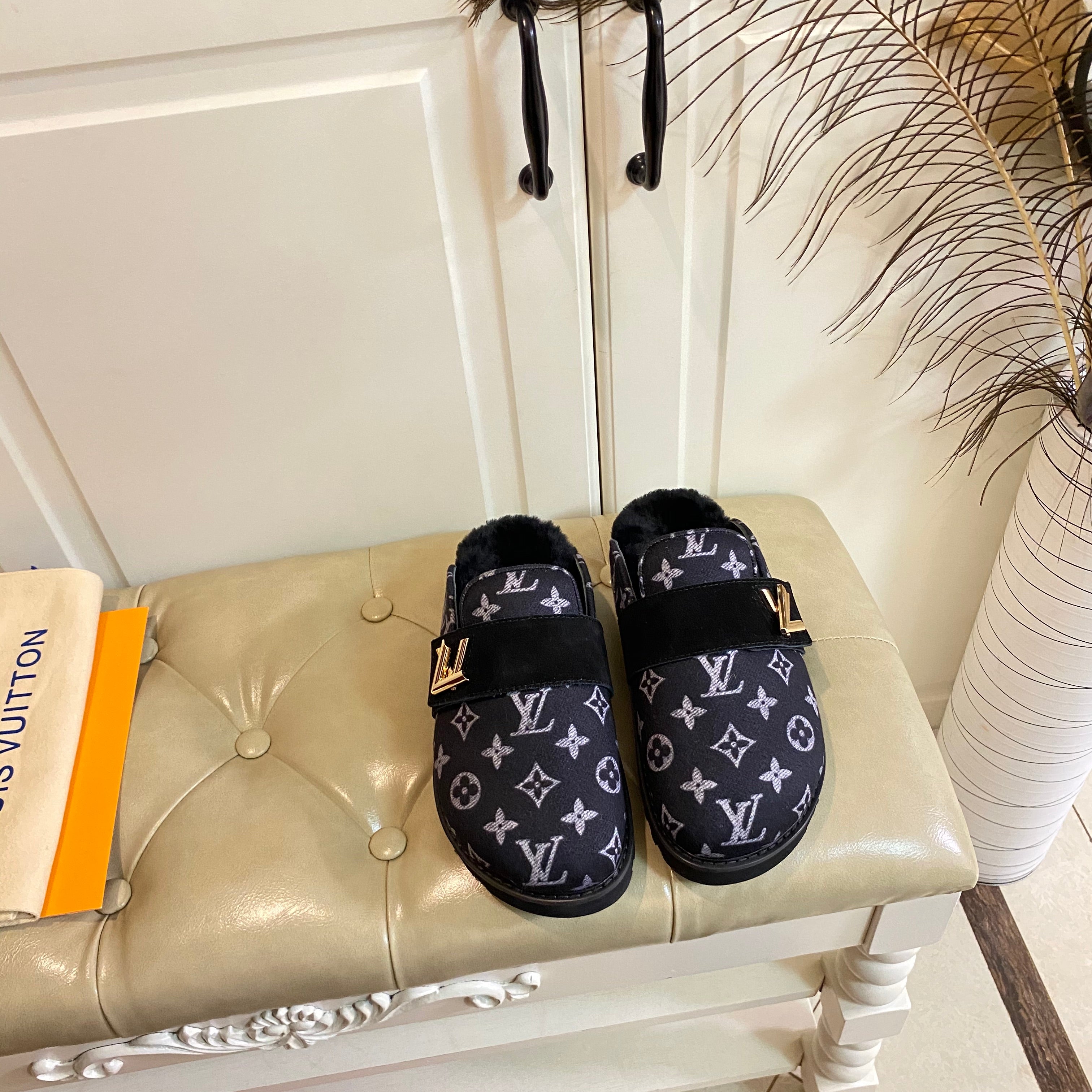 COSY FLAT COMFORT CLOG IN BLACK MONOGRAM FABRIC AND SUEDE