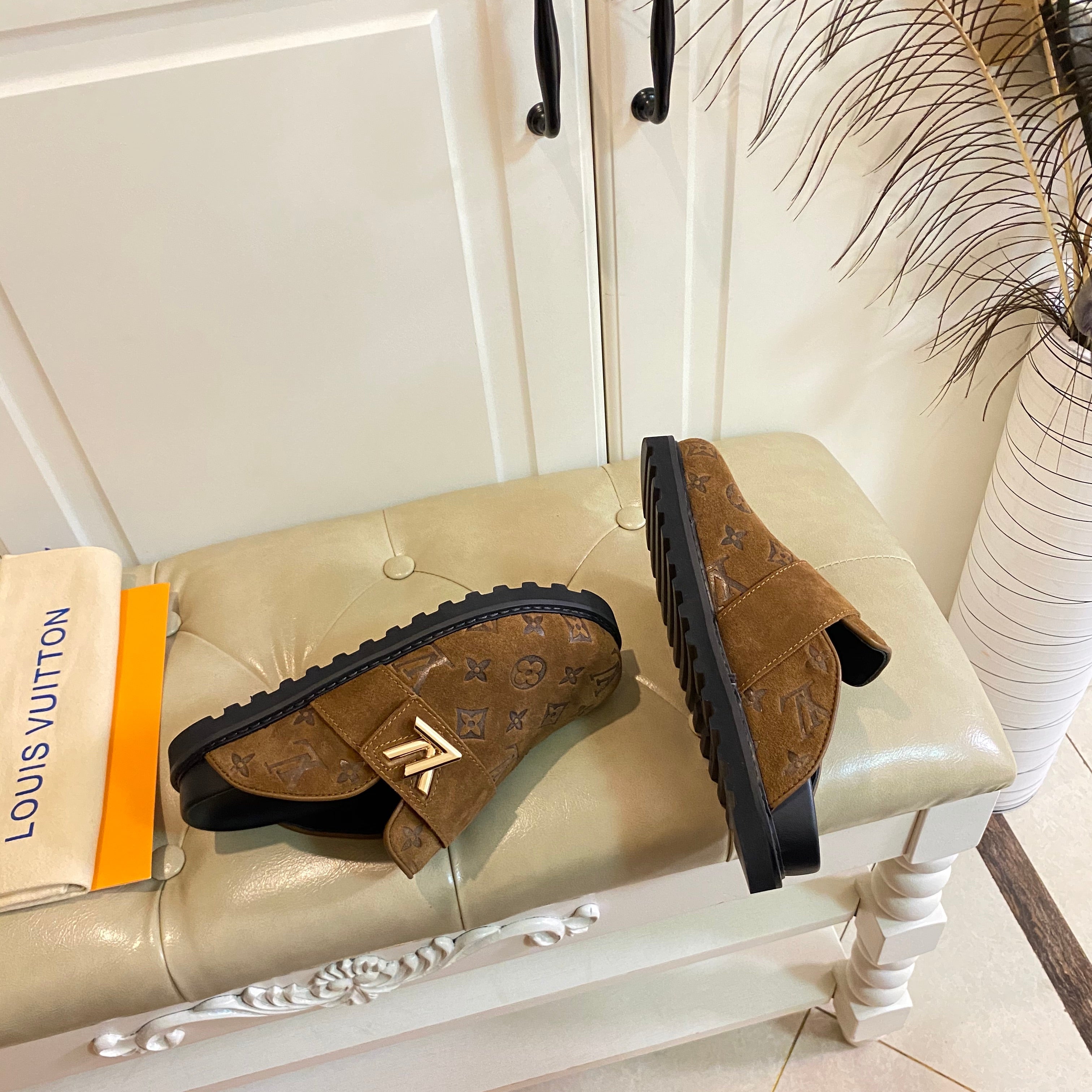 COSY FLAT COMFORT CLOG IN CHOCOLATE BROWN EMBOSSED SUEDE