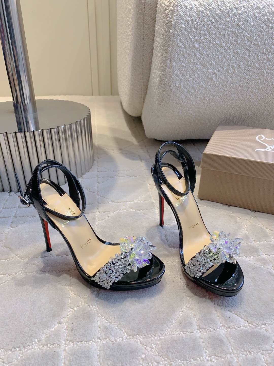 CRYSTAL QUEEN SANDAL 100MM IN BLACK CALFSKIN EMBELLISHED CRYTAL