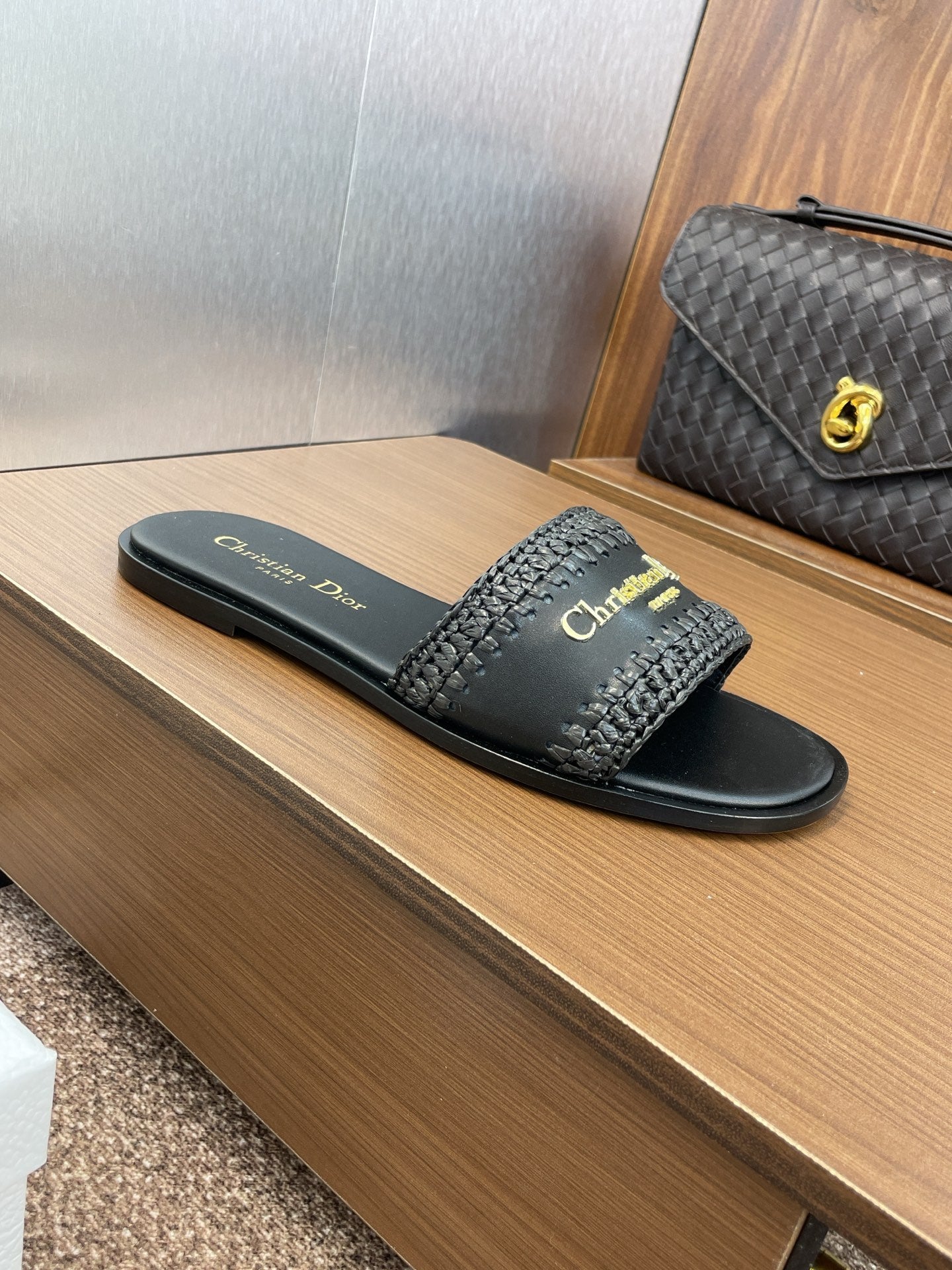 DIOR 25S D-LANE SLIDE BLACK CALFSKIN AND BLACK BRAIDED RAFFIA