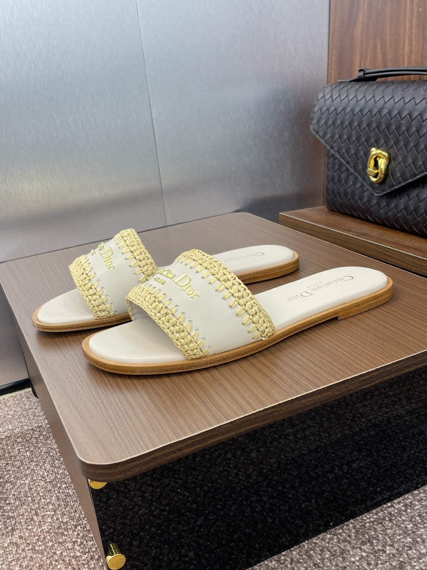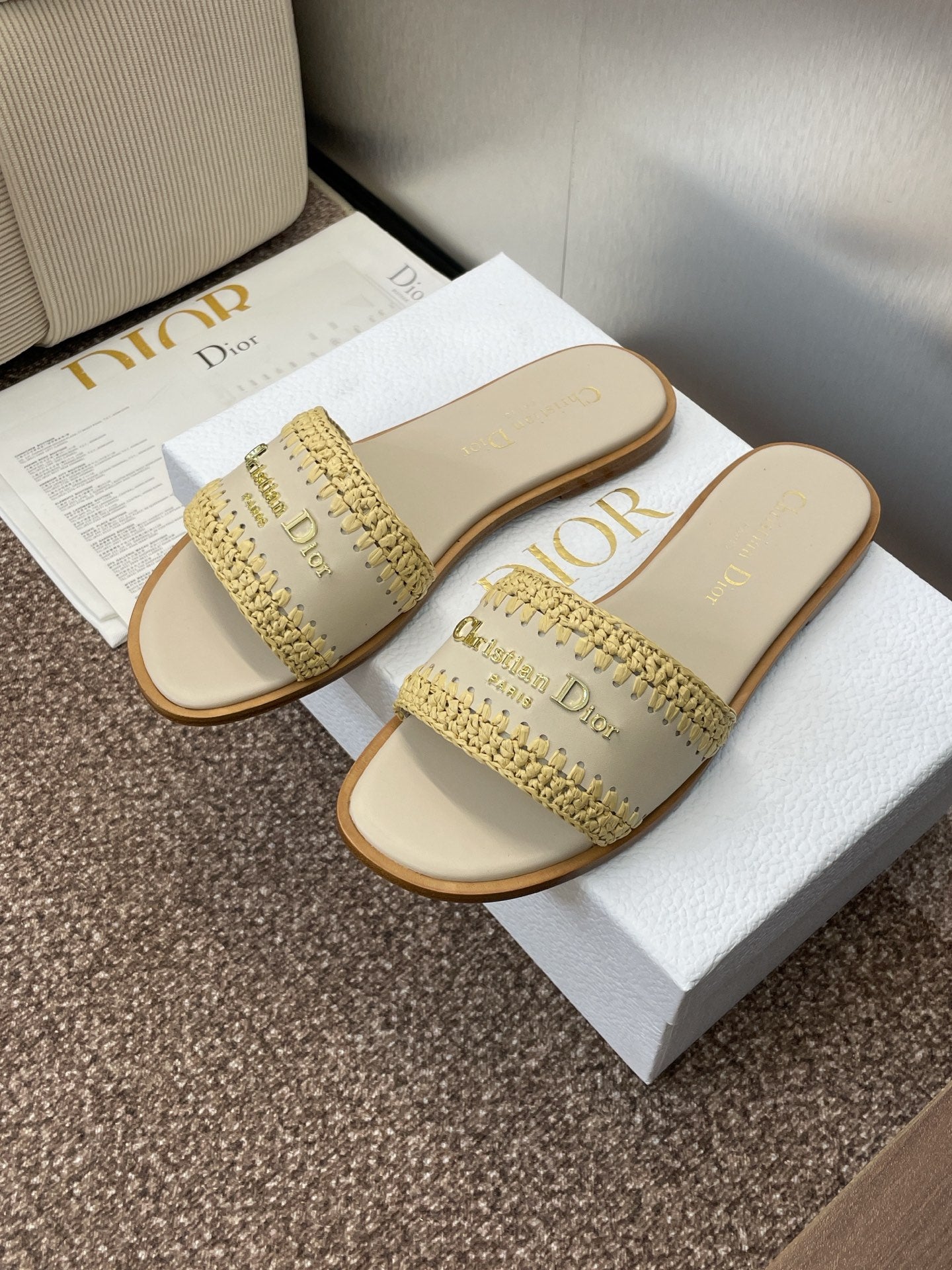 DIOR 25S D-LANE SLIDE LIGHT BEIGE CALFSKIN AND YELLOW BRAIDED RAFFIA
