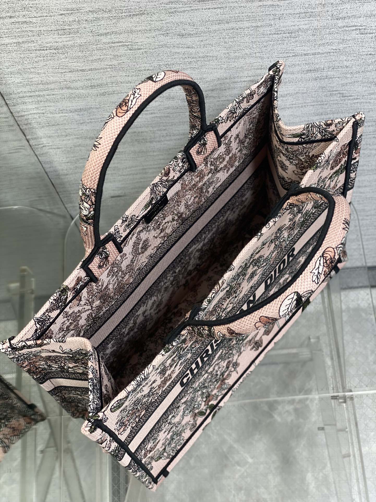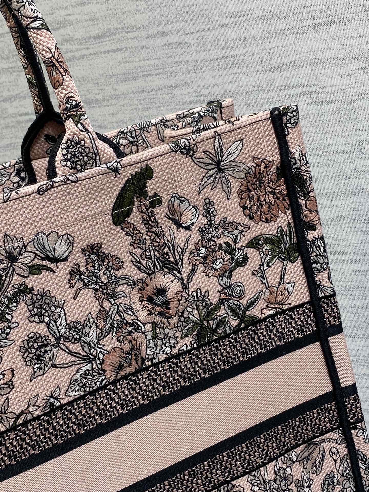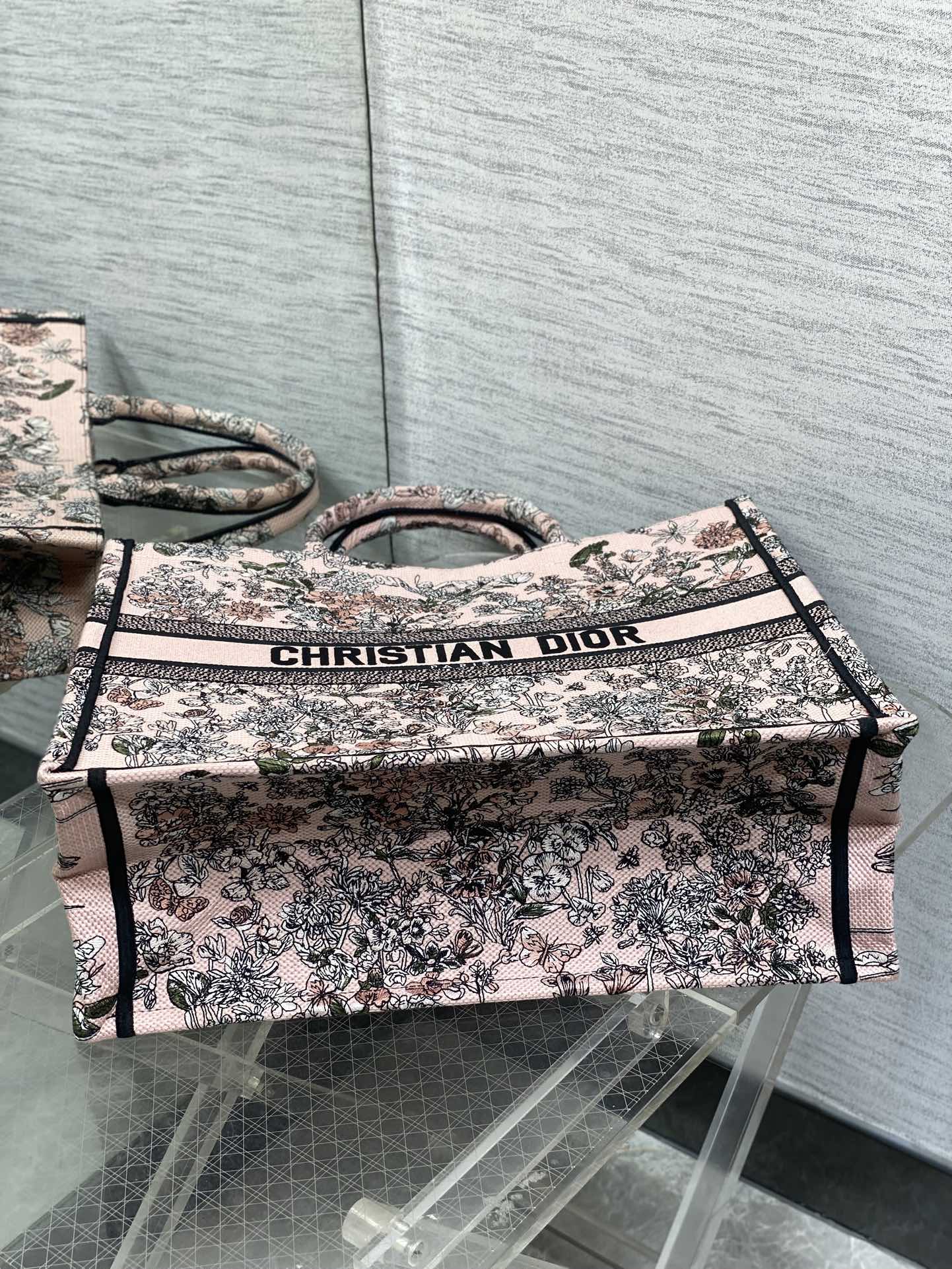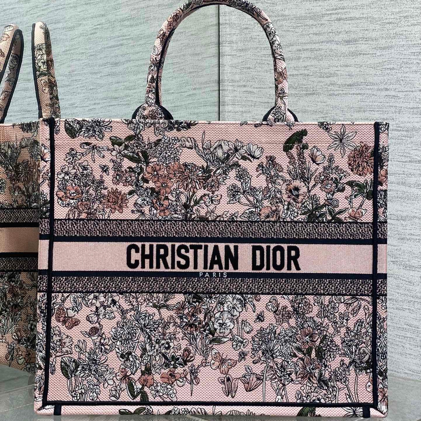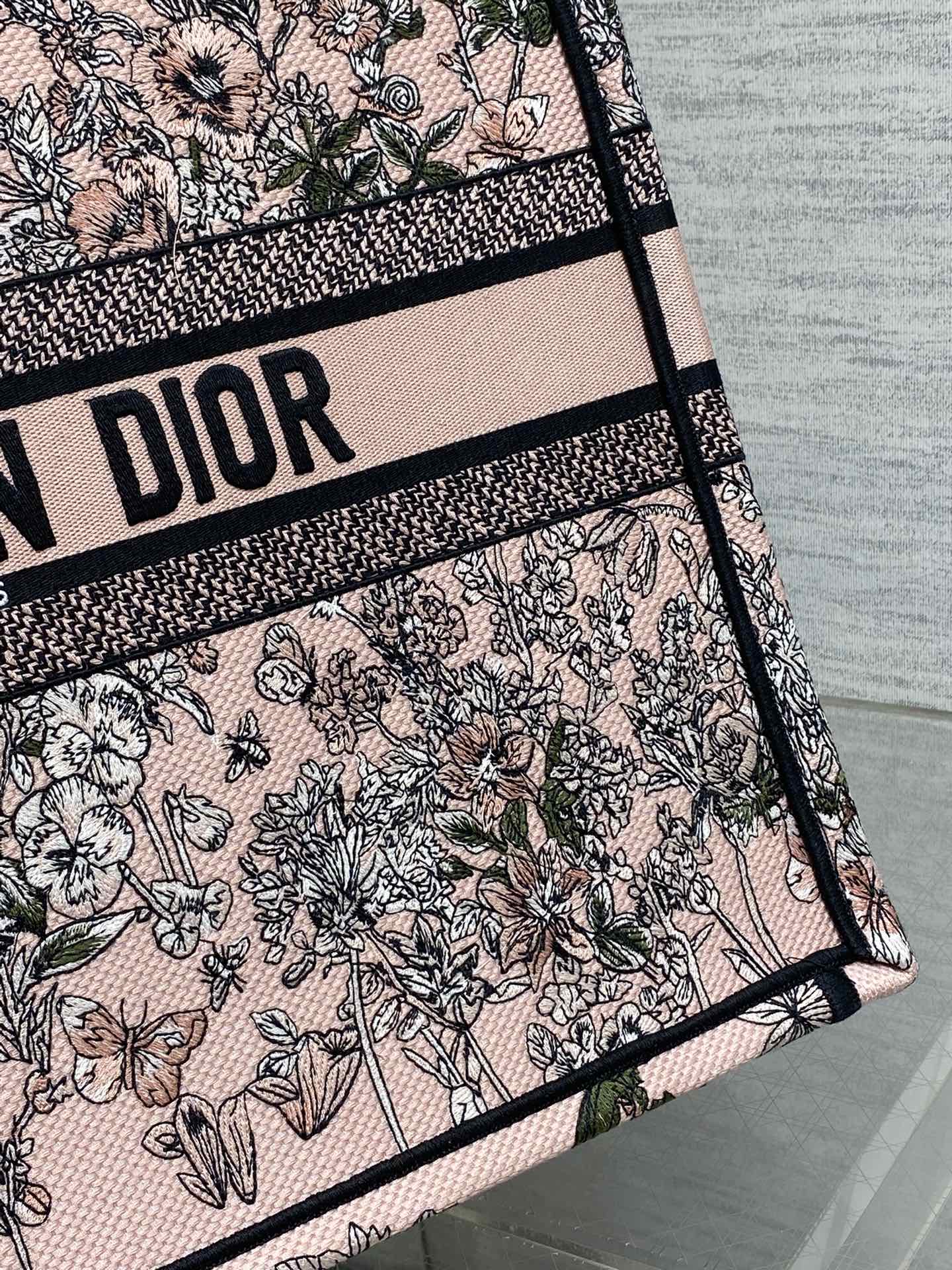 DIOR 25S LUCKY LARGE DIOR BOOK TOTE 42 IN PINK MULTICOLOR DIOR FLOWERS CALENDAR ALLOVER EMBROIDERY