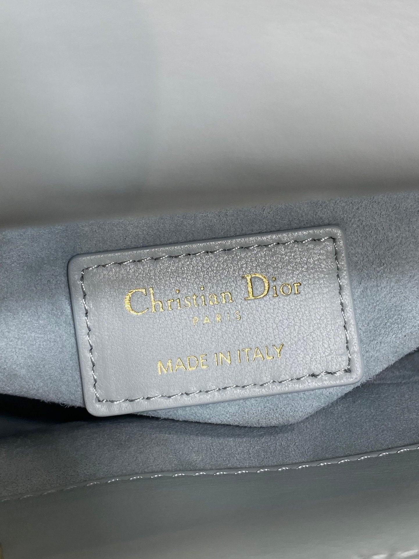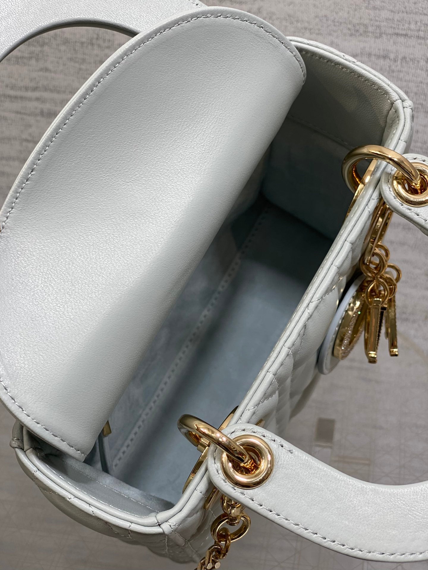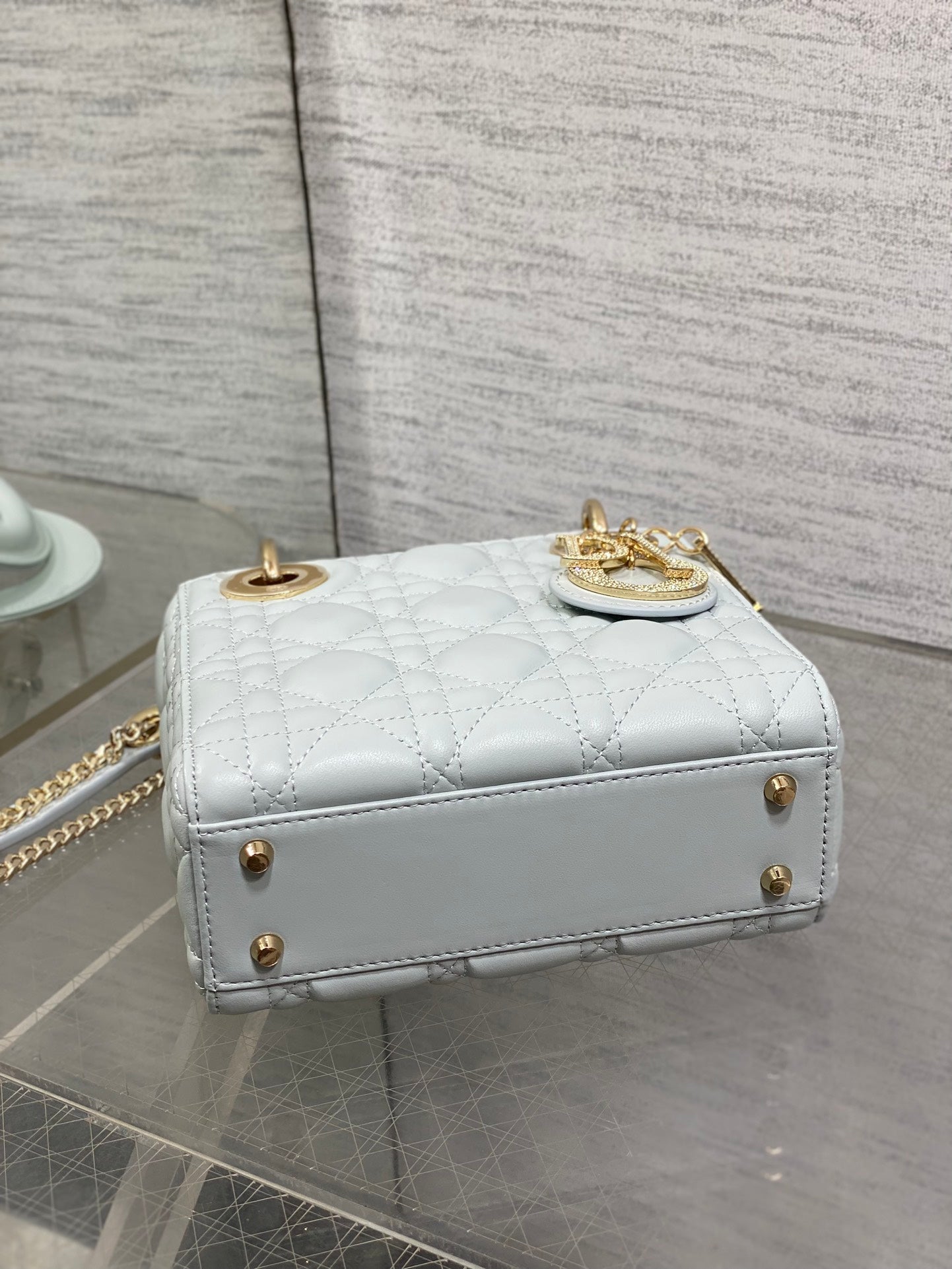 DIOR 25S MINI LADY DIOR BAG 17 IN LIGHT BLUE CALFSKIN CHARM CRYSTAL EMBELLISHMENTS