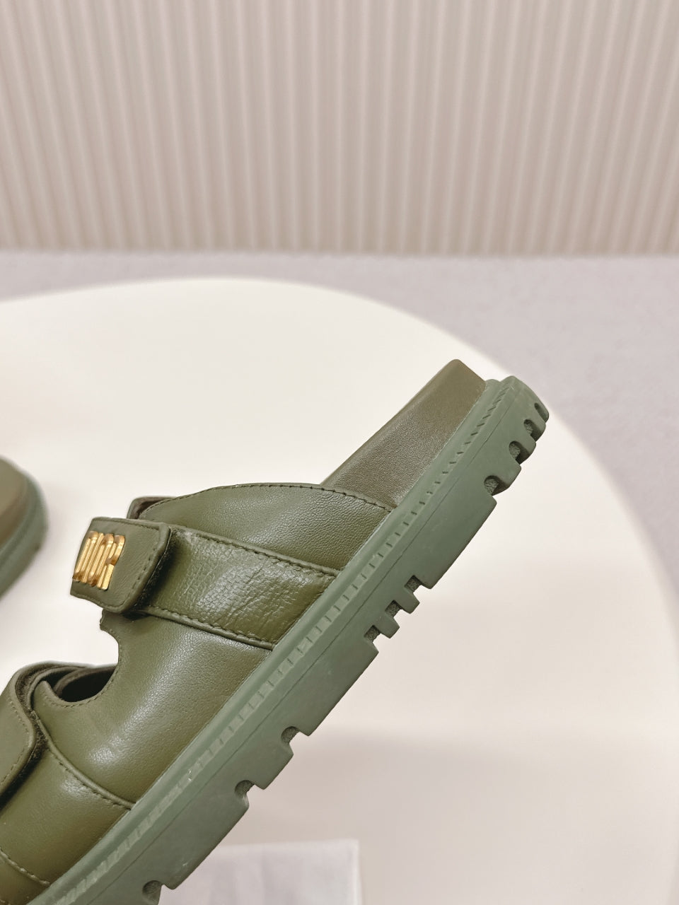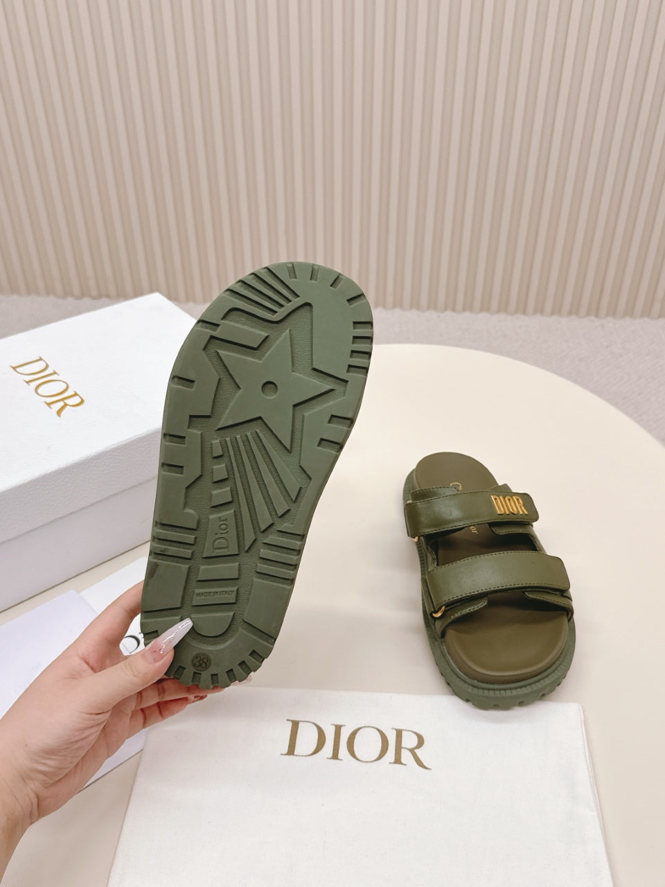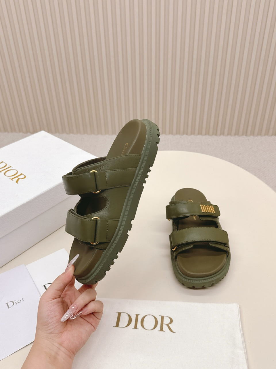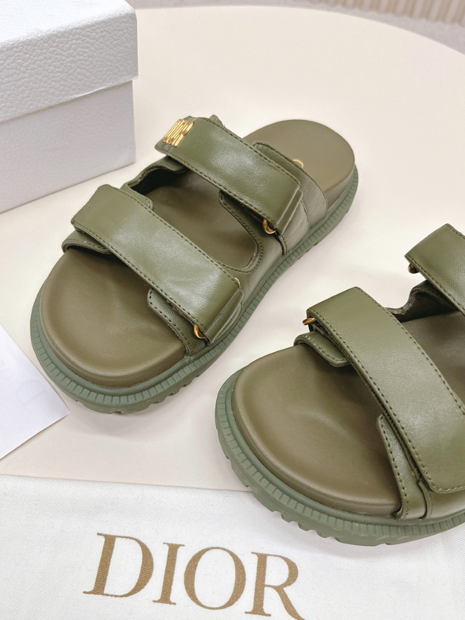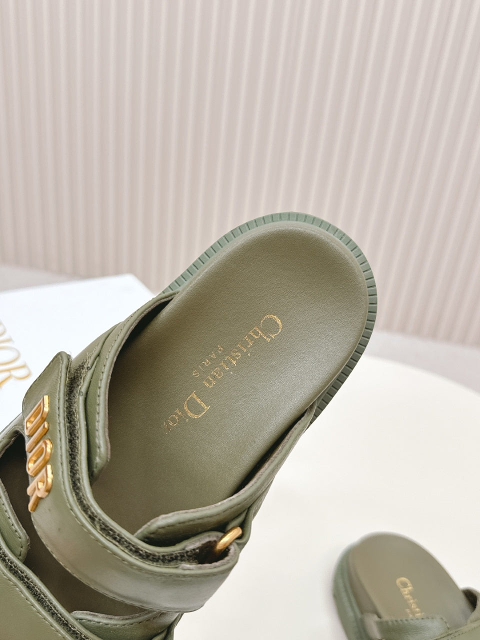 DIOR CLASSIC DOUBLE-STRAP SLIDES 25S IN MOSS GREEN CALFSKIN