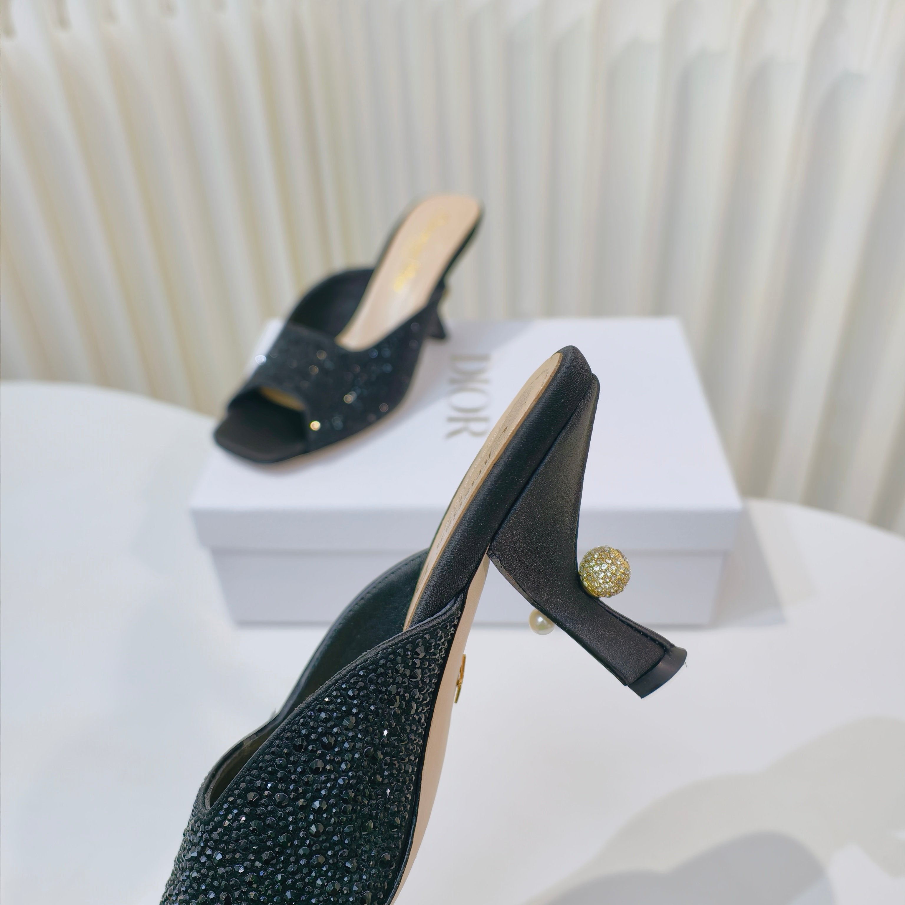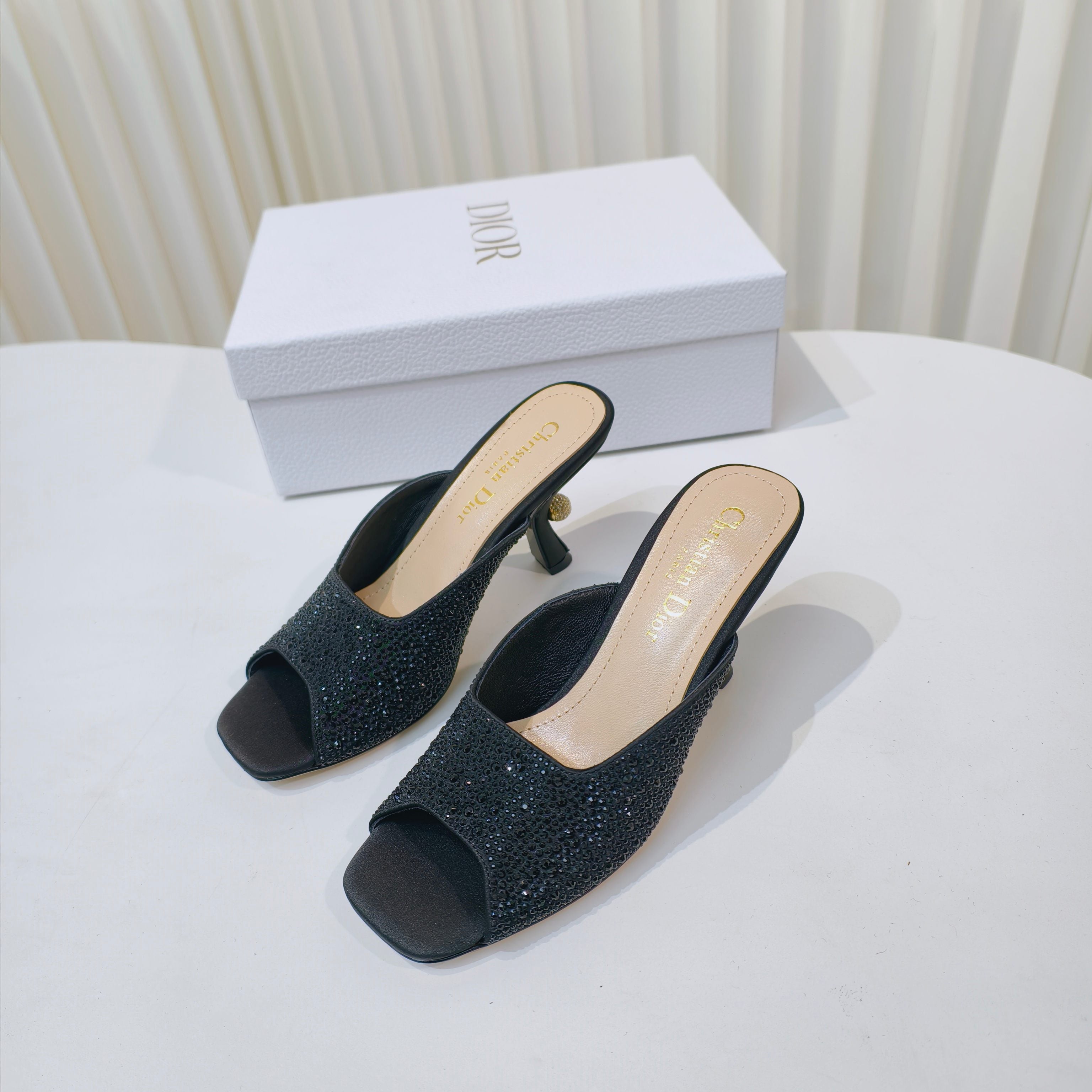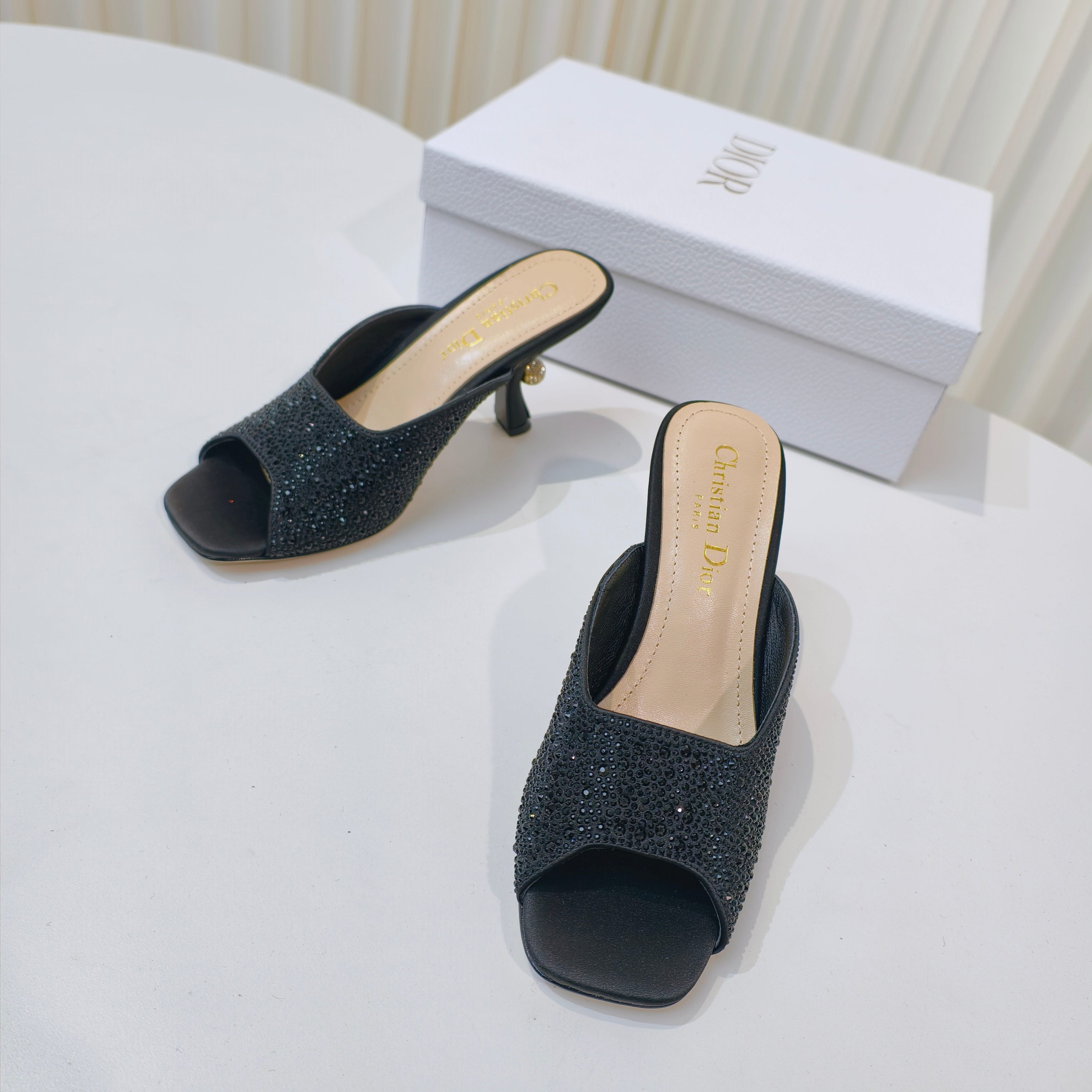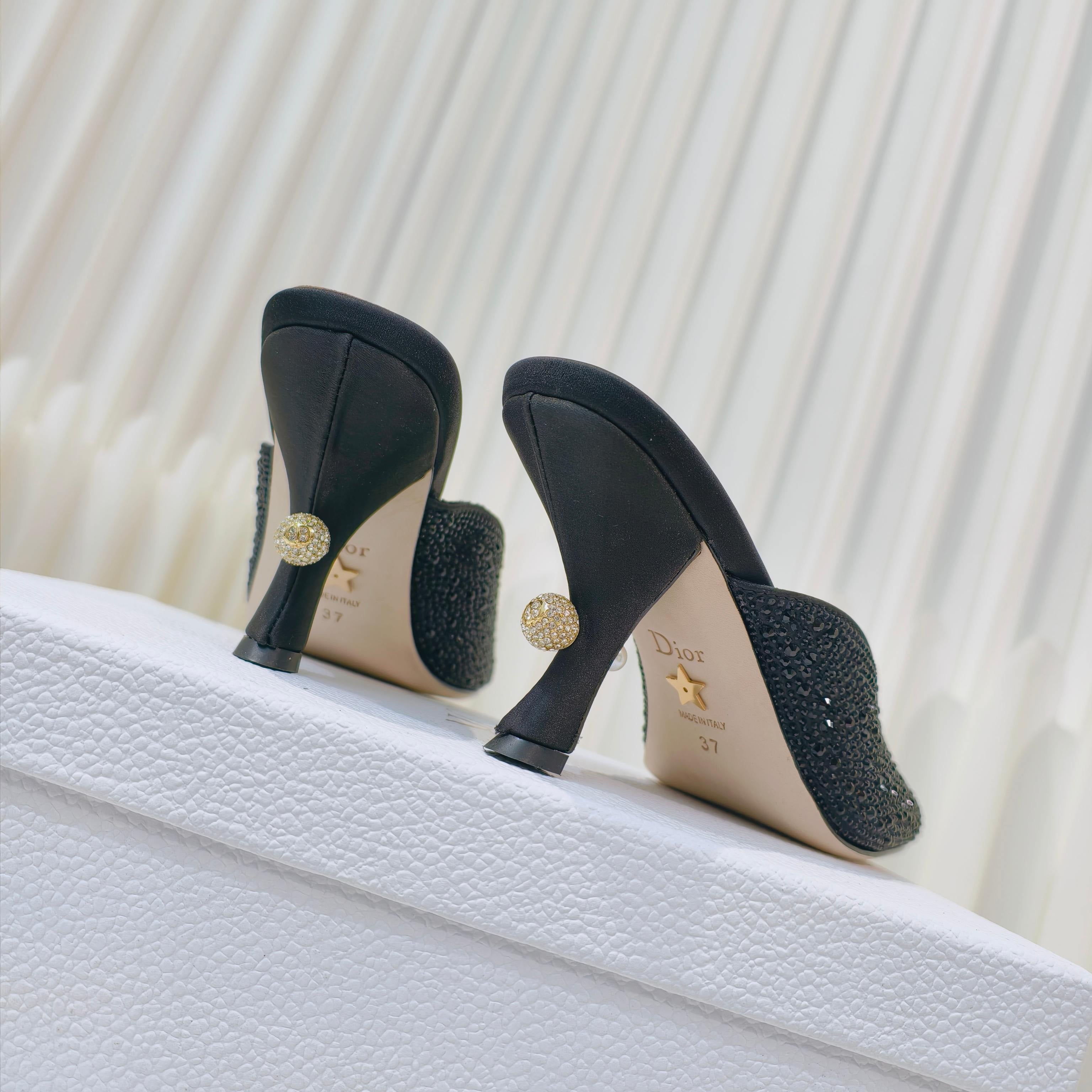 DIOR EMBELLISHED HIGH HEEL SLIDES 25S IN BLACK SATIN AND CALFSKIN