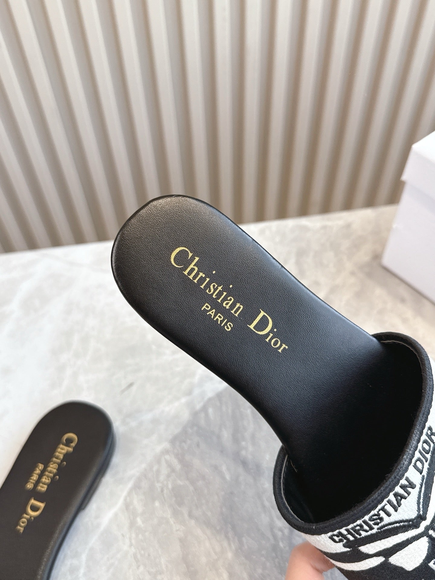 DIOR FLAT SLIDES 25S IN BLACK CALFSKIN AND FABRIC BRAND NAME EMBROIDERY