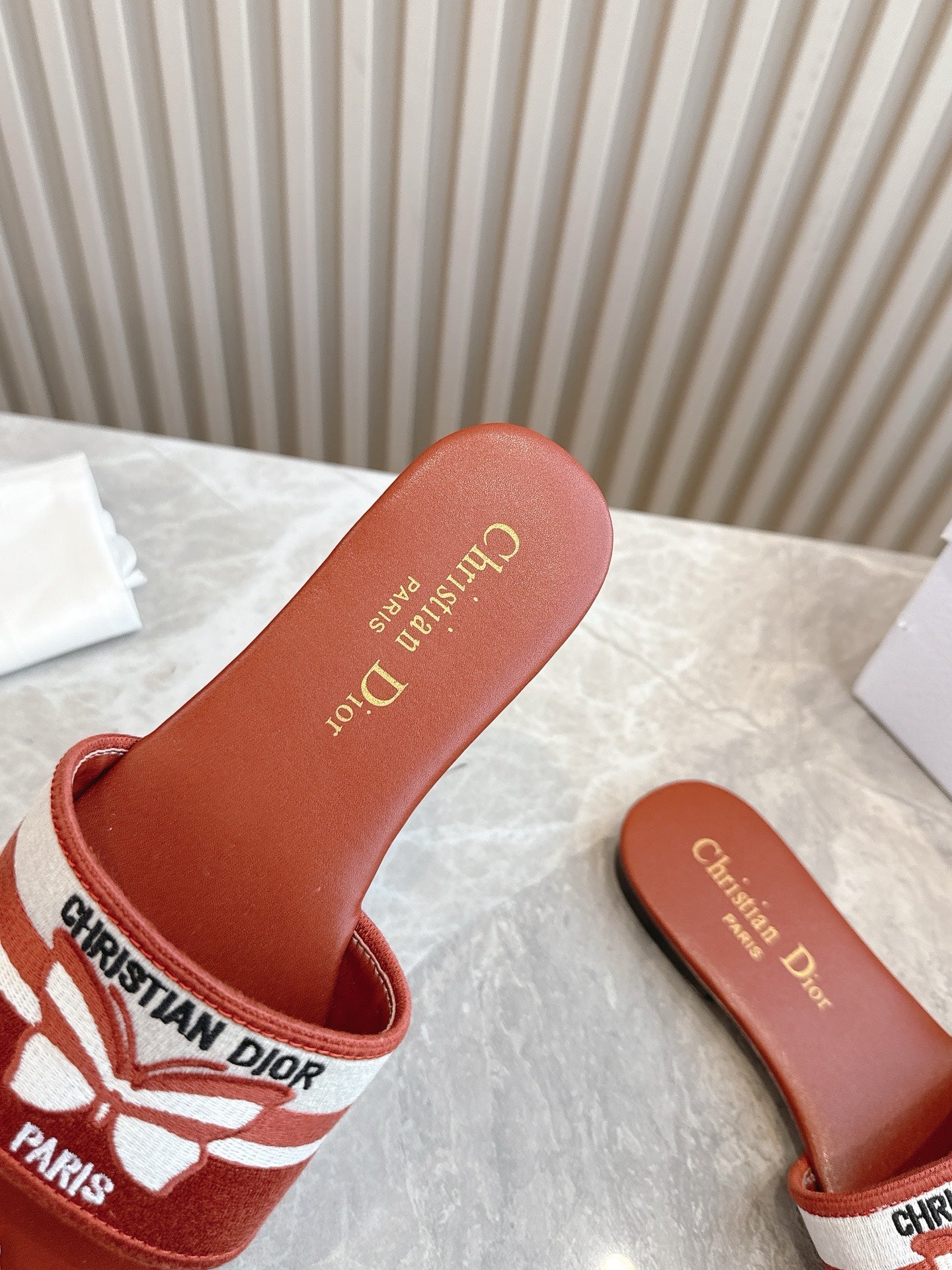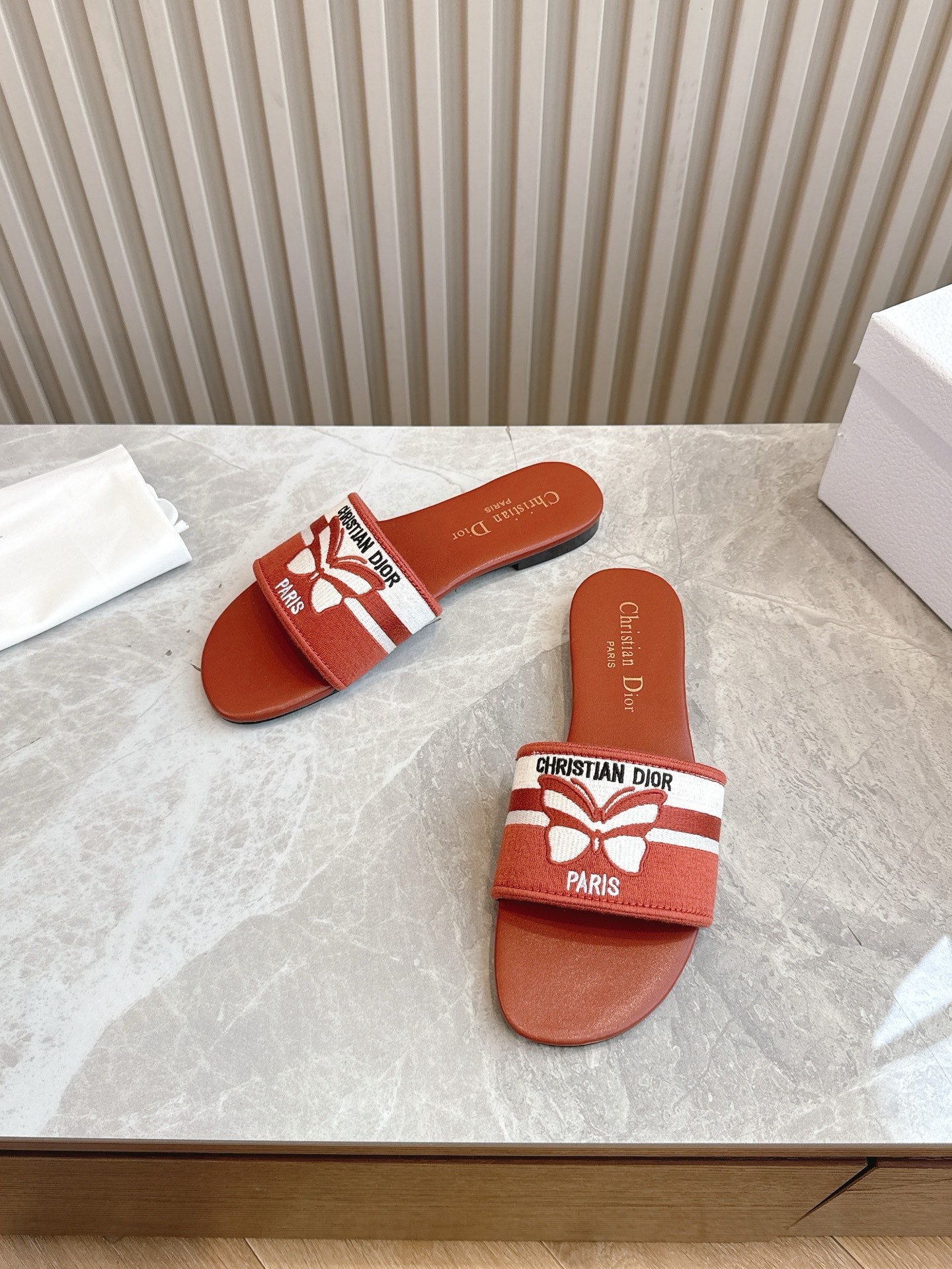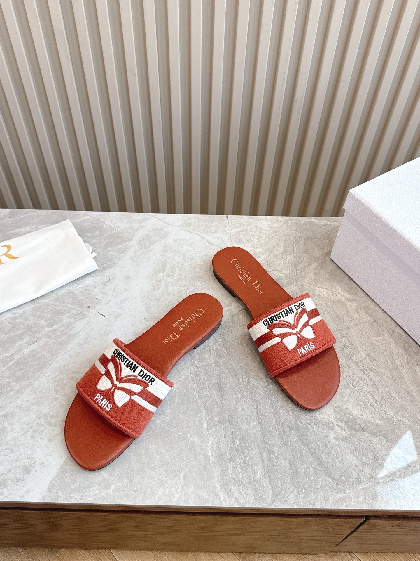 DIOR FLAT SLIDES 25S IN DARK ORANGE CALFSKIN AND FABRIC BRAND NAME EMBROIDERY