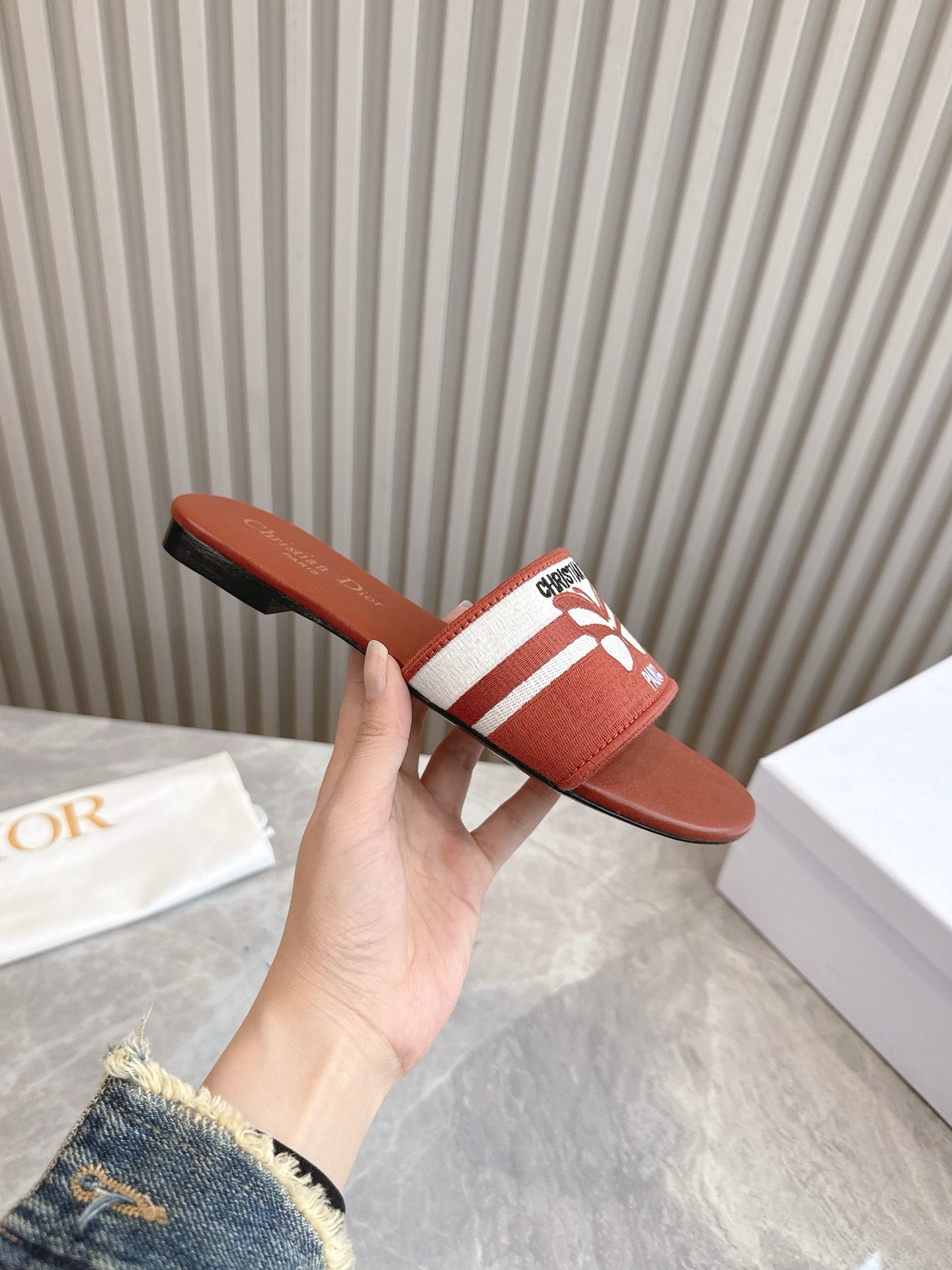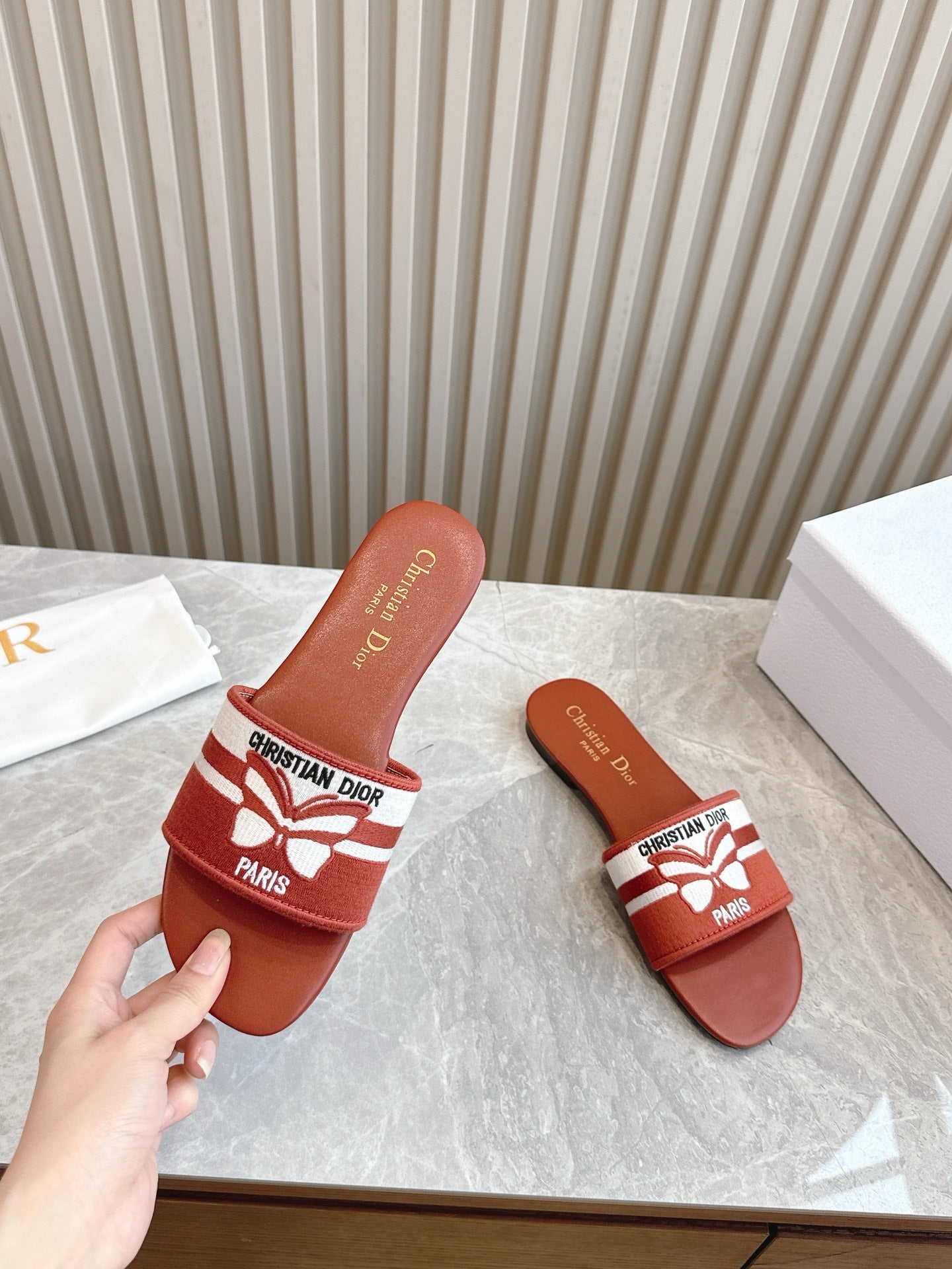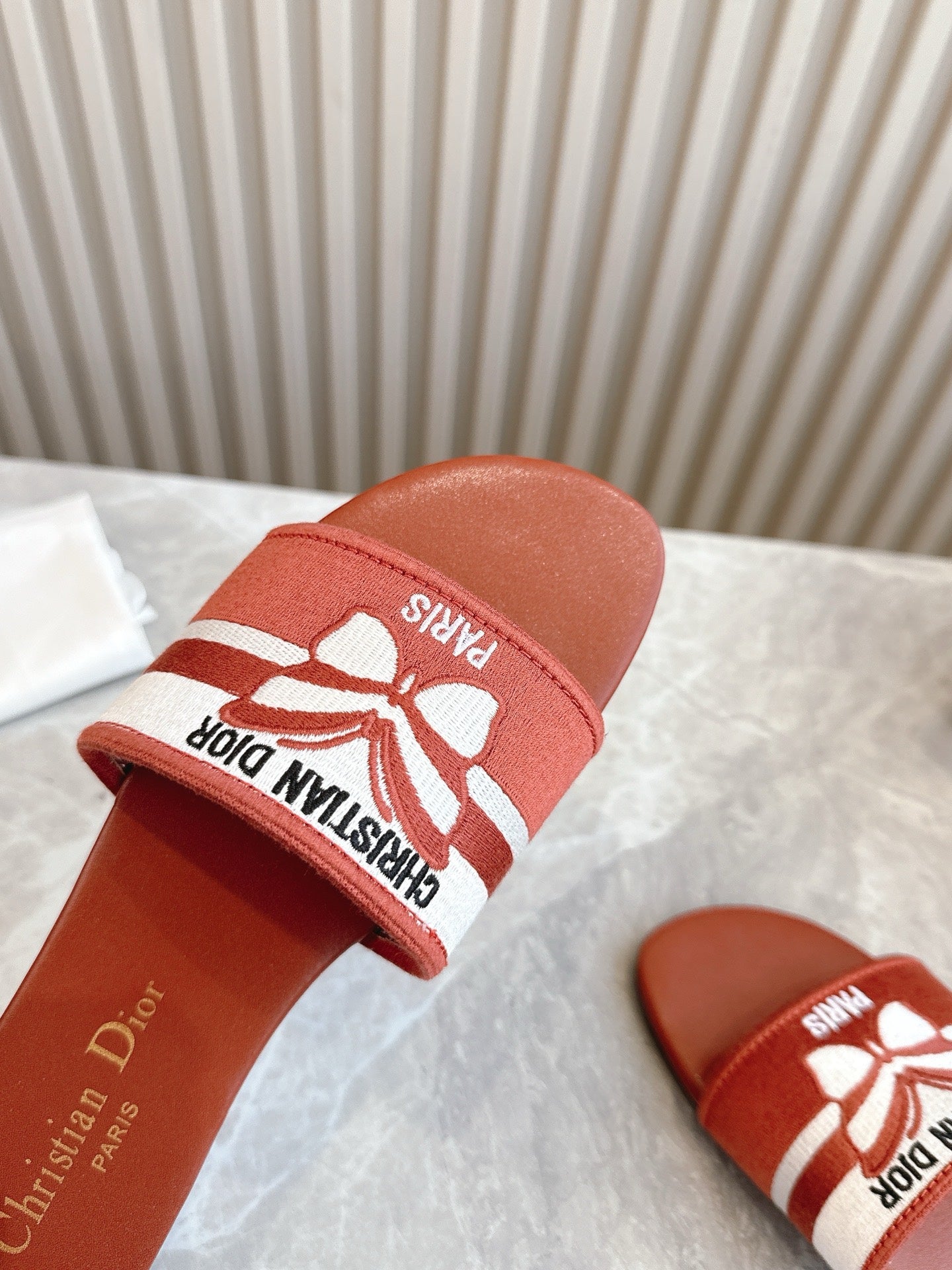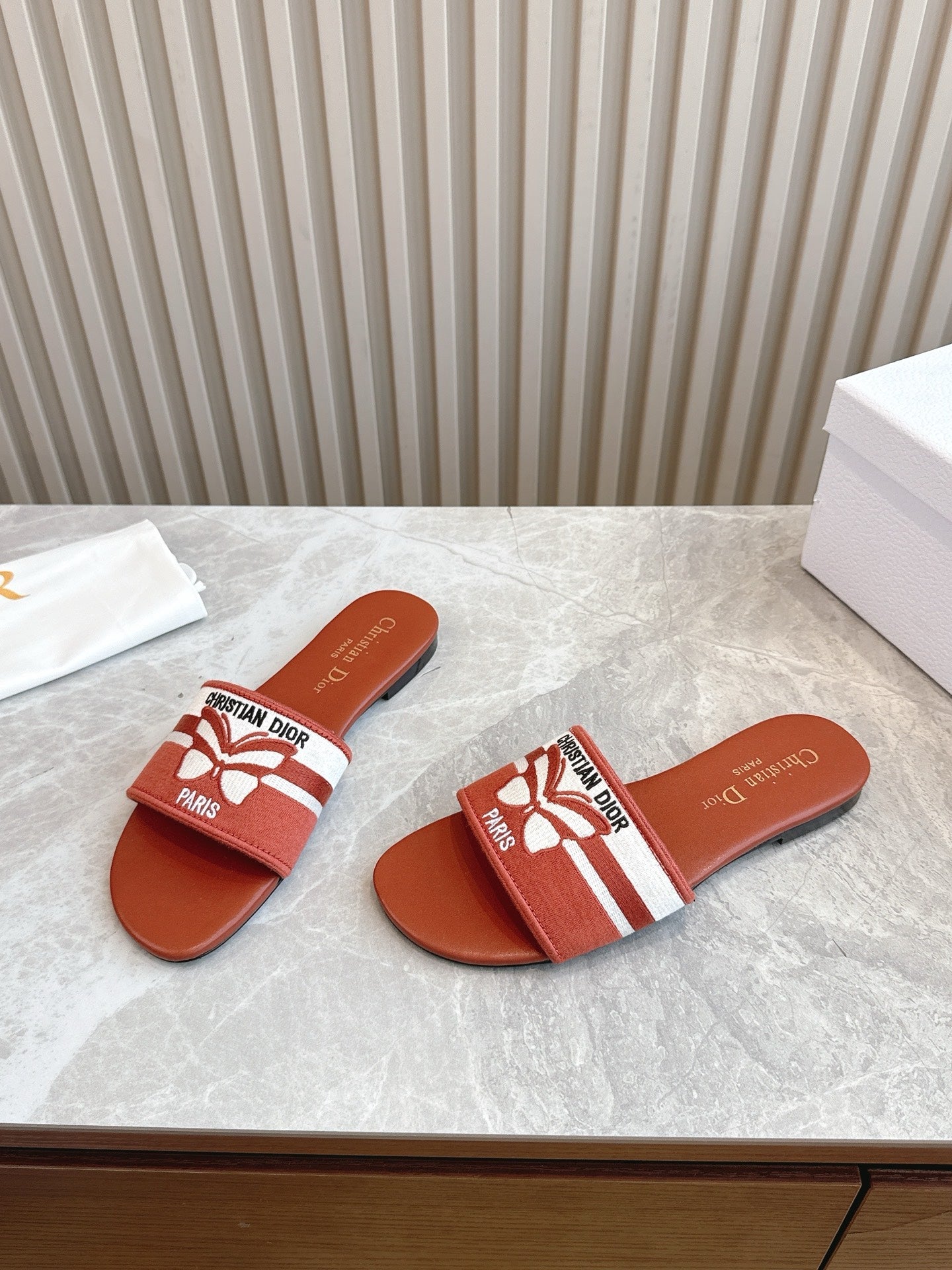 DIOR FLAT SLIDES 25S IN DARK ORANGE CALFSKIN AND FABRIC BRAND NAME EMBROIDERY