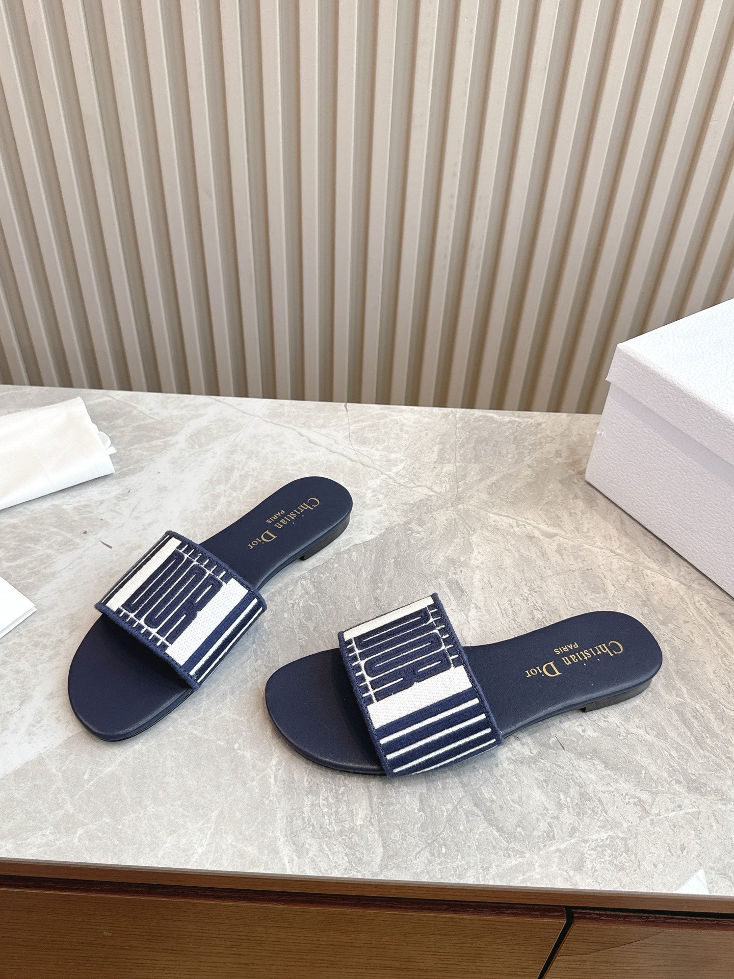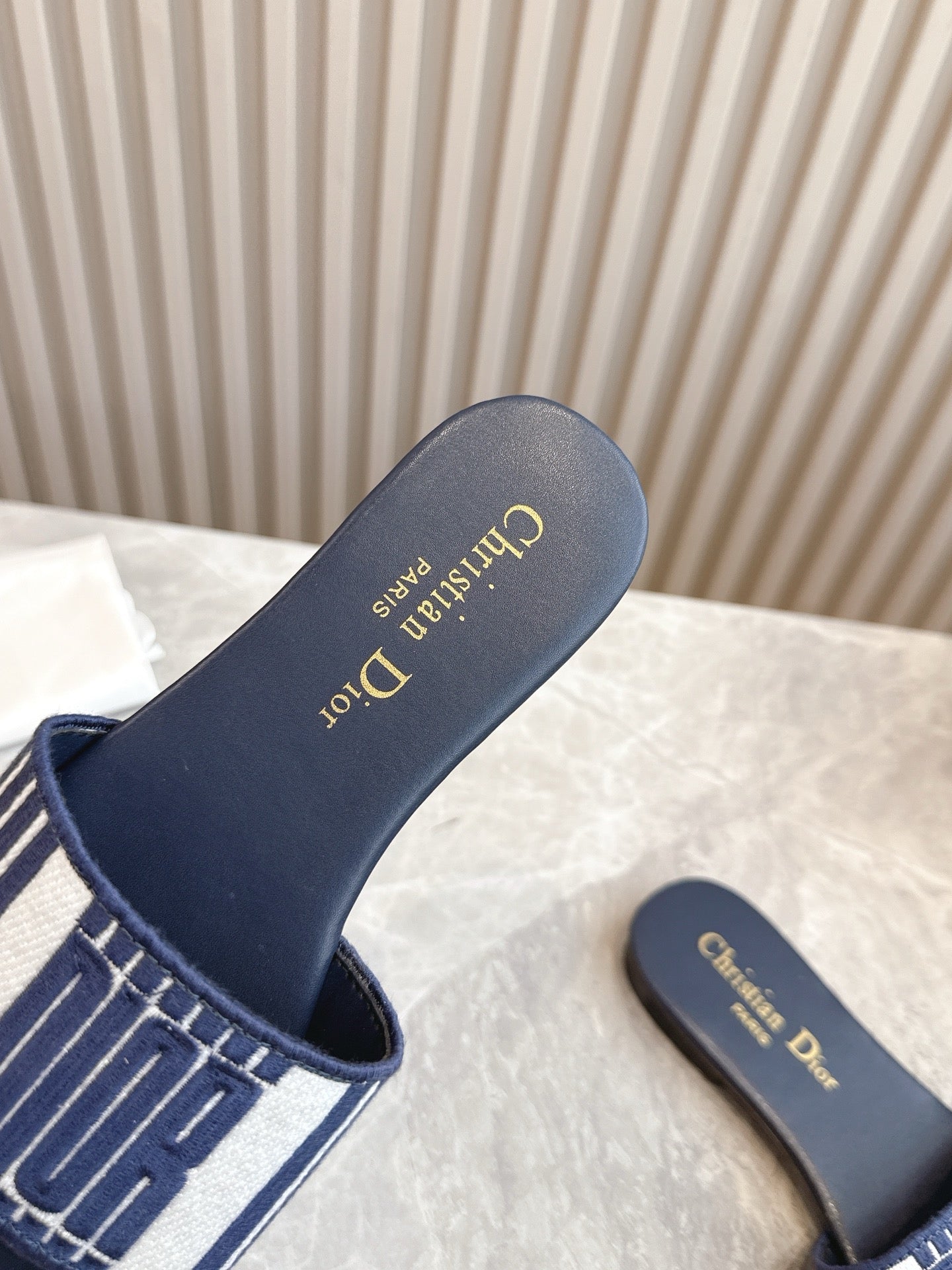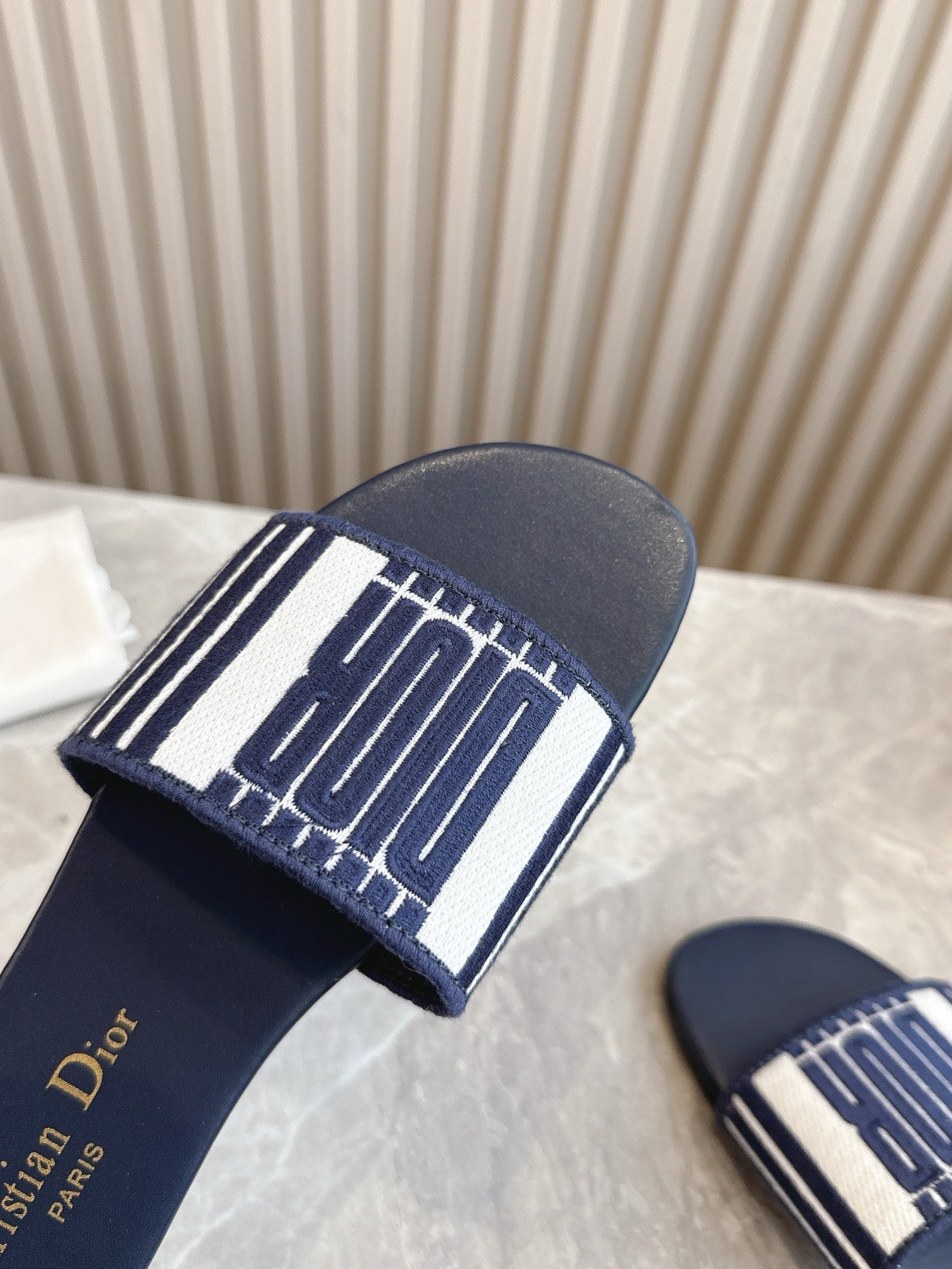 DIOR FLAT SLIDES 25S IN MIDNIGHT BLUE CALFSKIN AND FABRIC BRAND NAME EMBROIDERY
