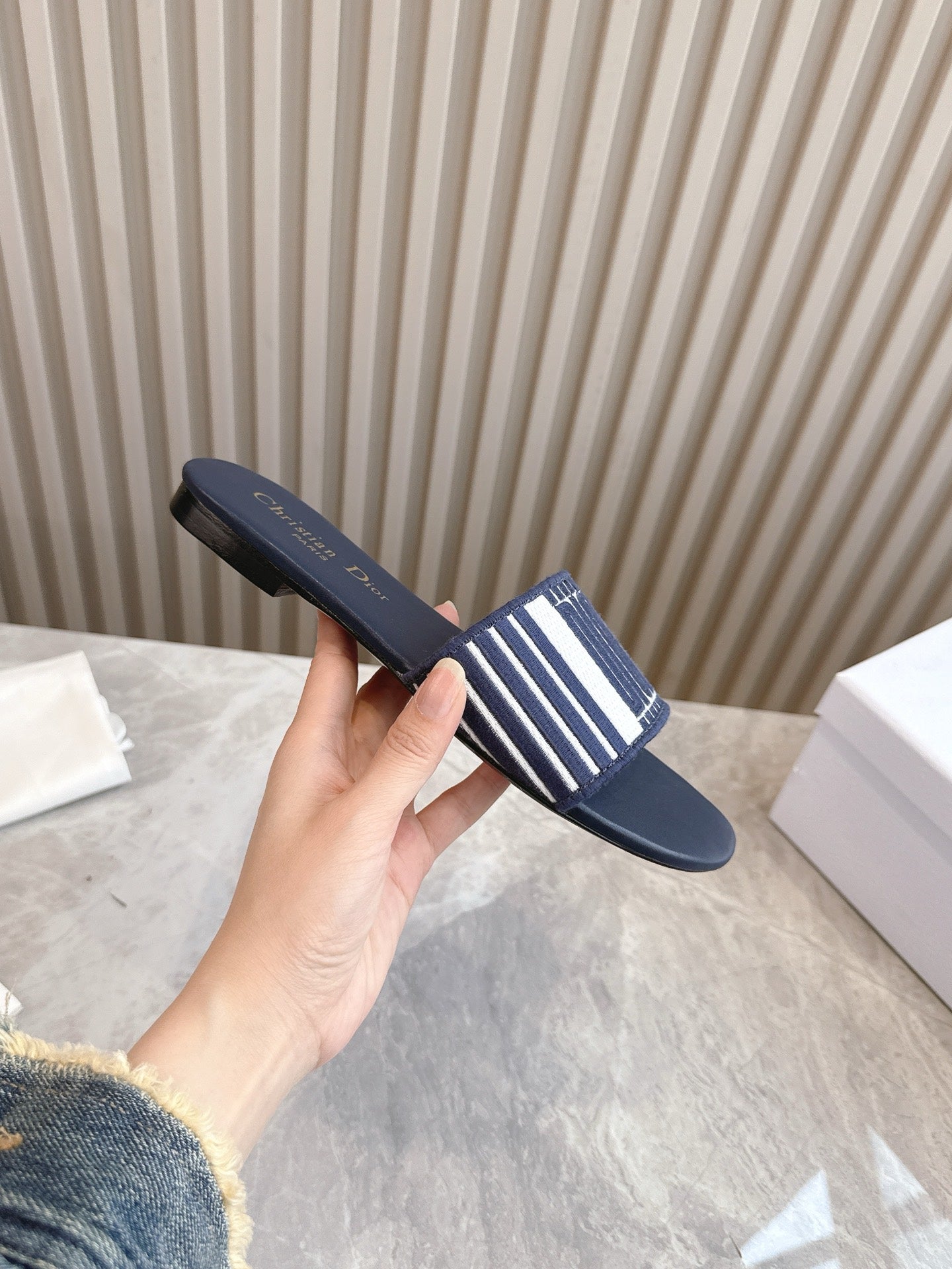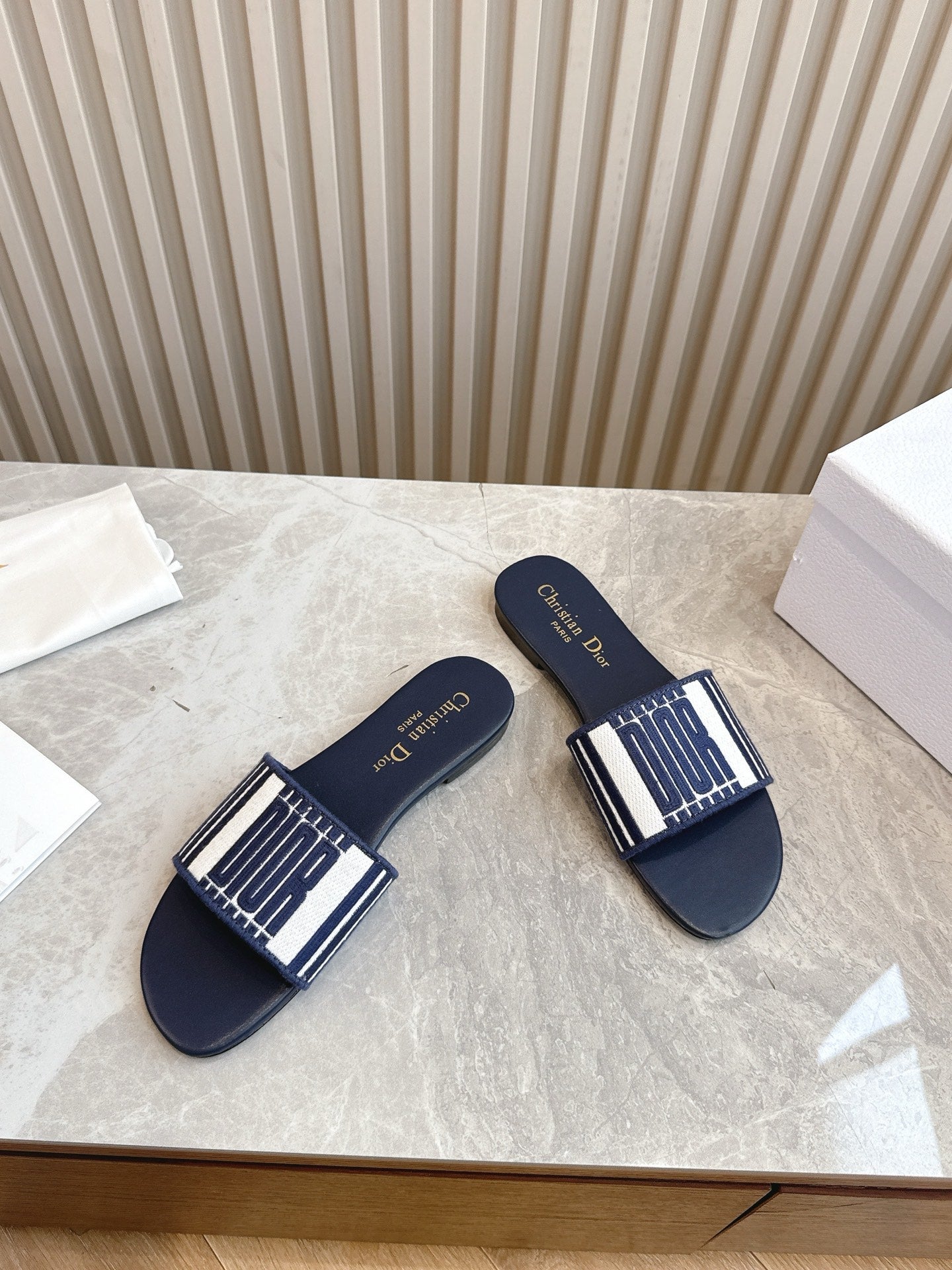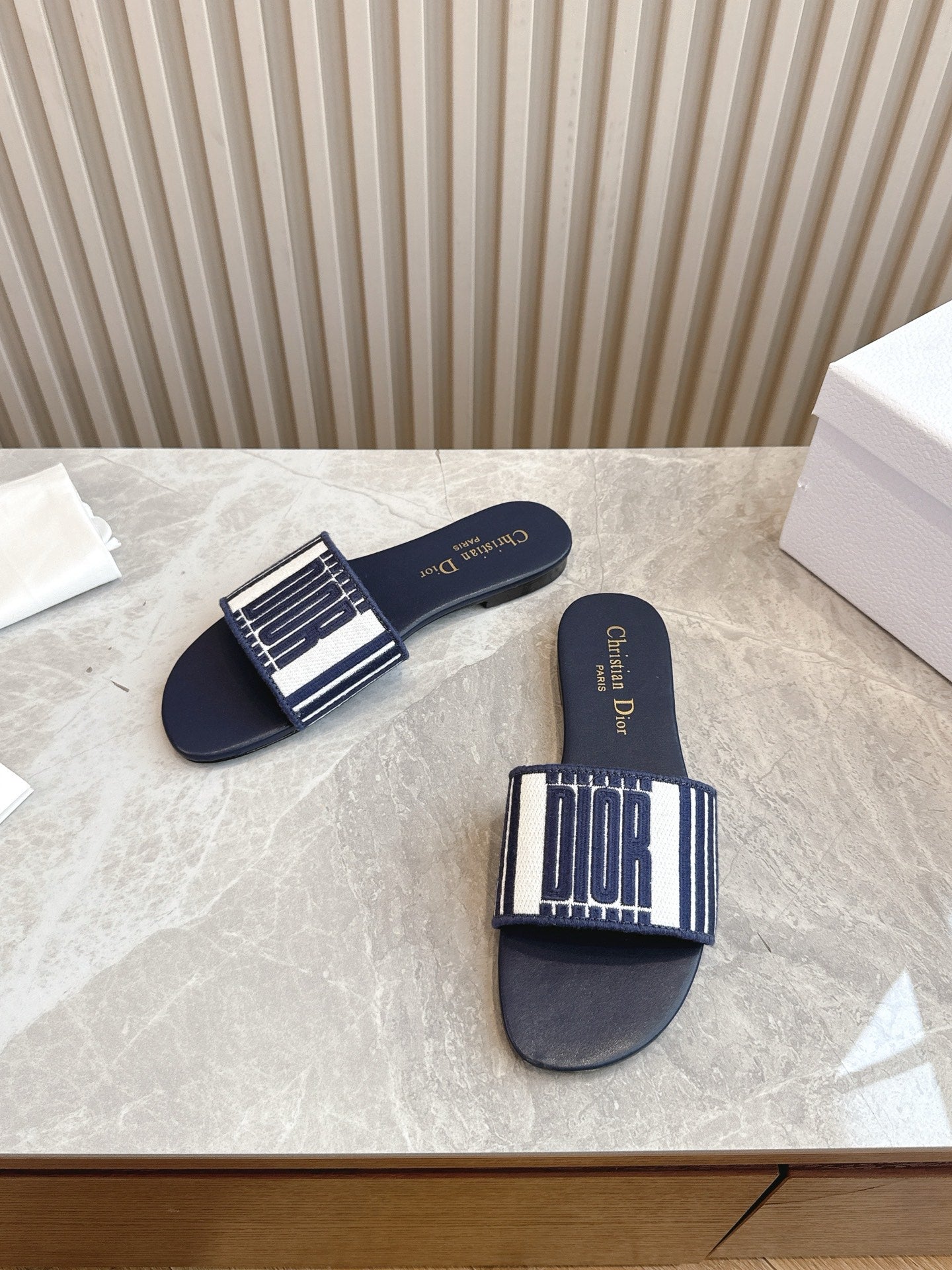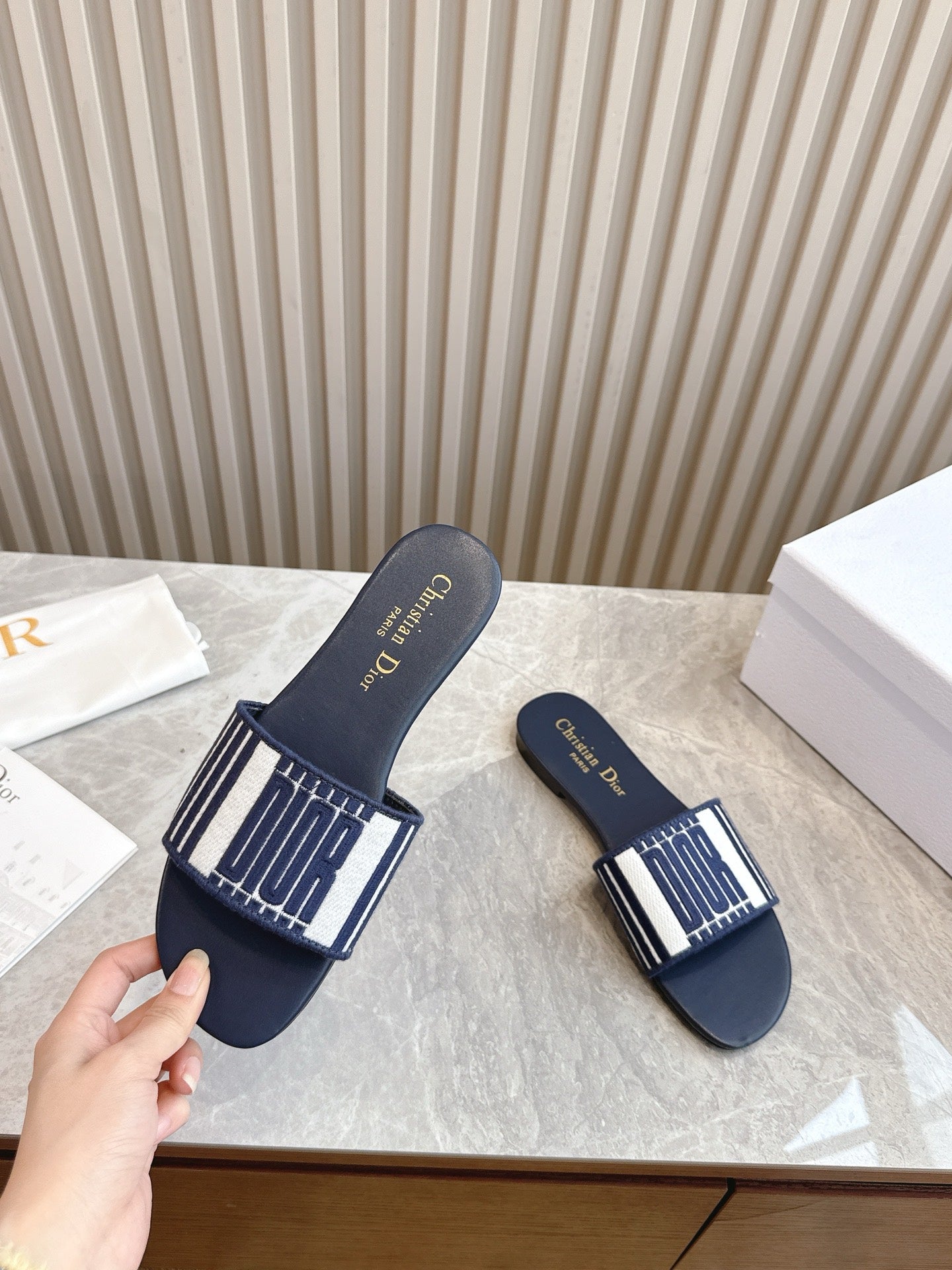 DIOR FLAT SLIDES 25S IN MIDNIGHT BLUE CALFSKIN AND FABRIC BRAND NAME EMBROIDERY