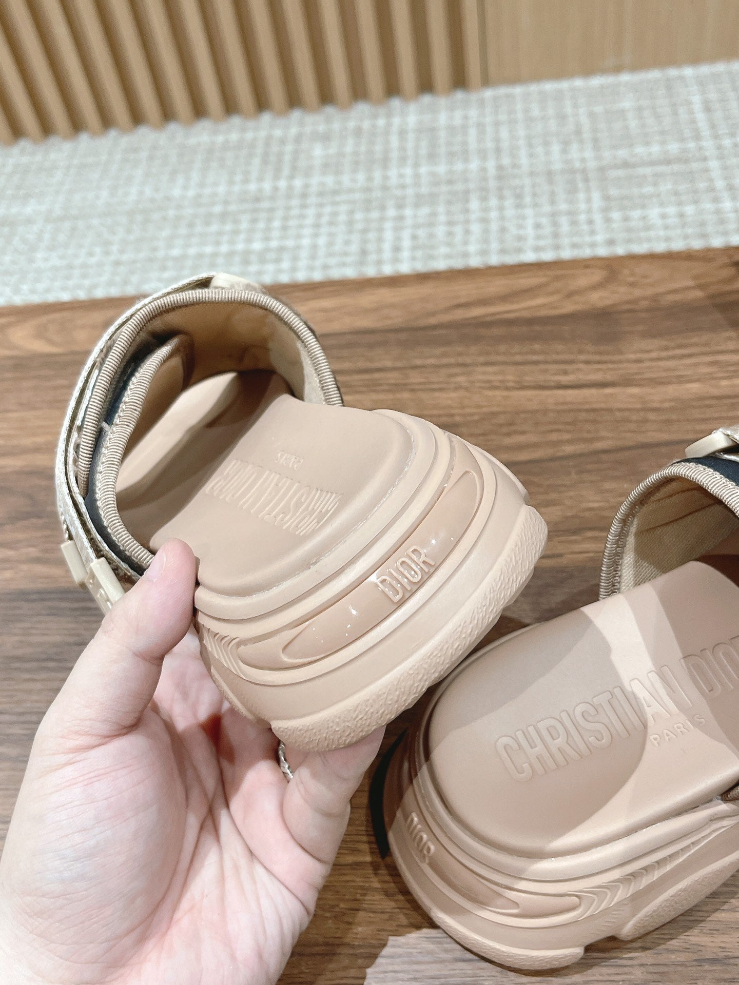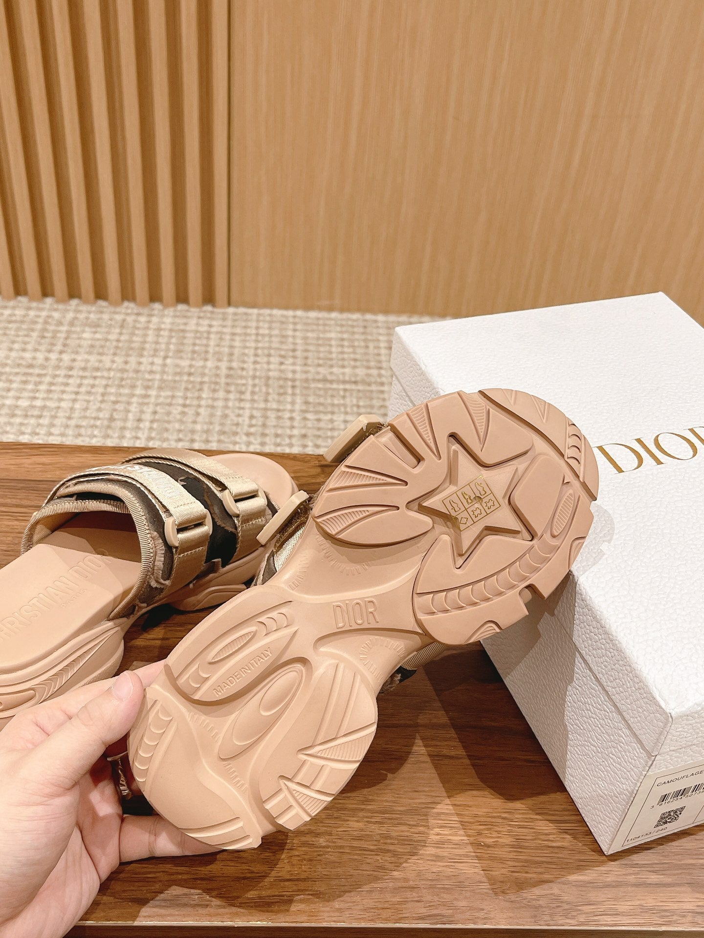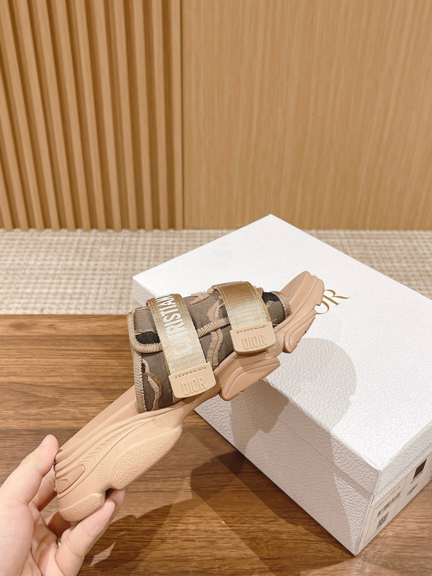 DIOR PLATFORM SLIDES 25S 30 MM IN MOSS GREEN FABRIC AND NUDE CALFSKIN