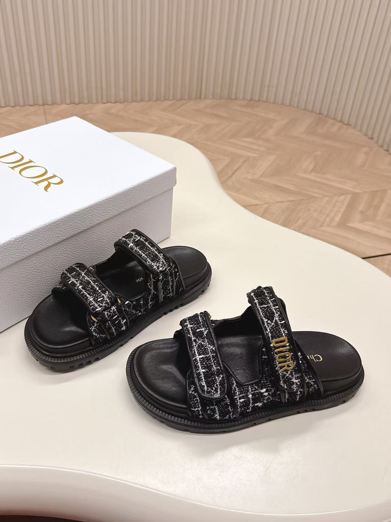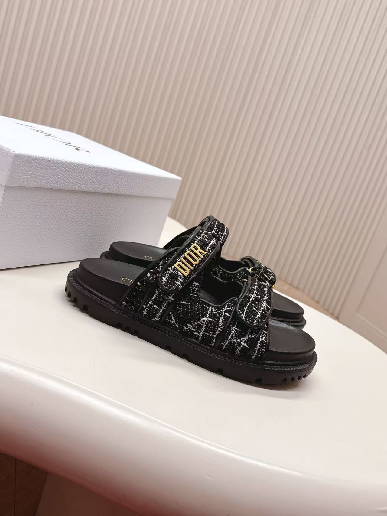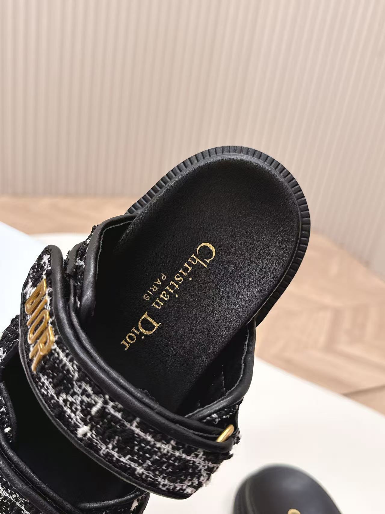 DIORACT SANDALS IN BLACK TWEED WITH GOLD LOGO BUCKLE