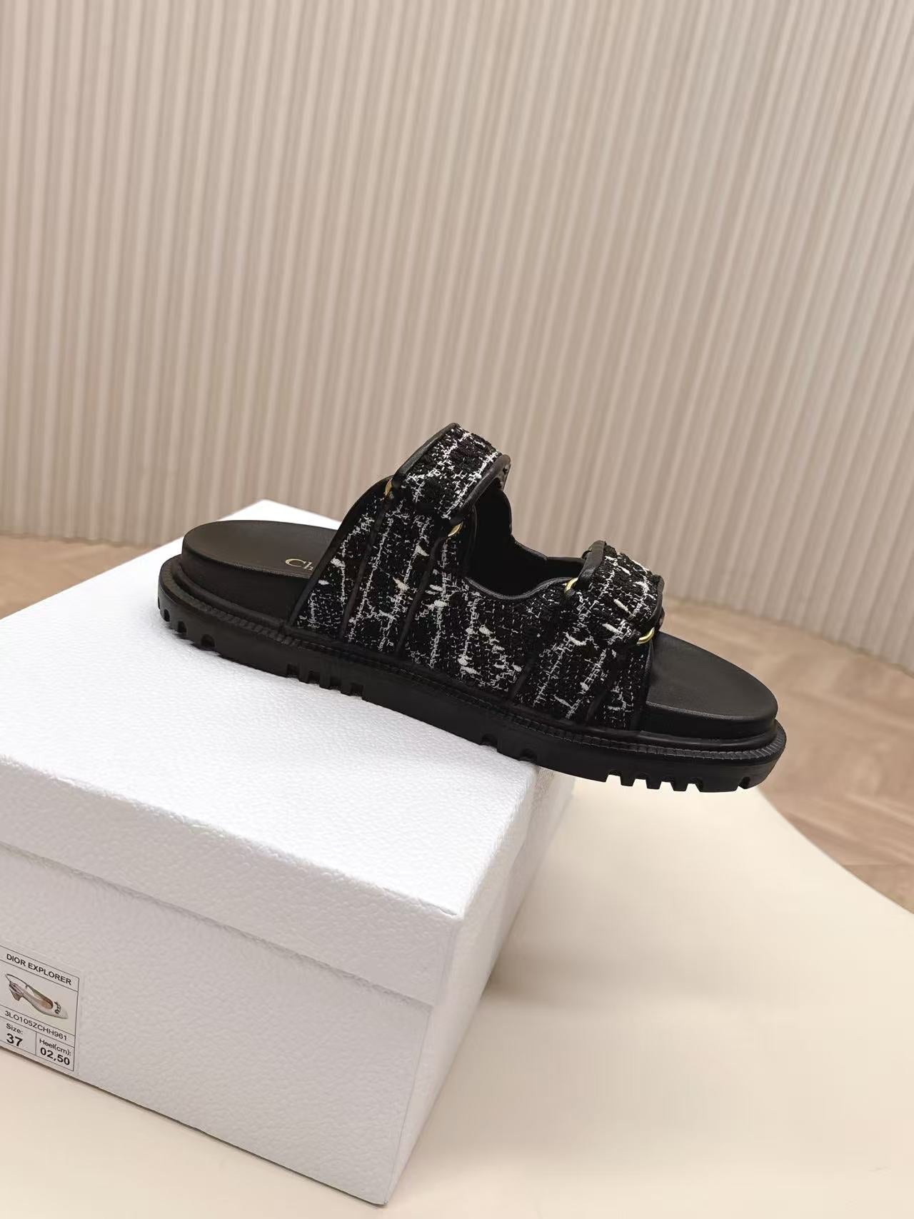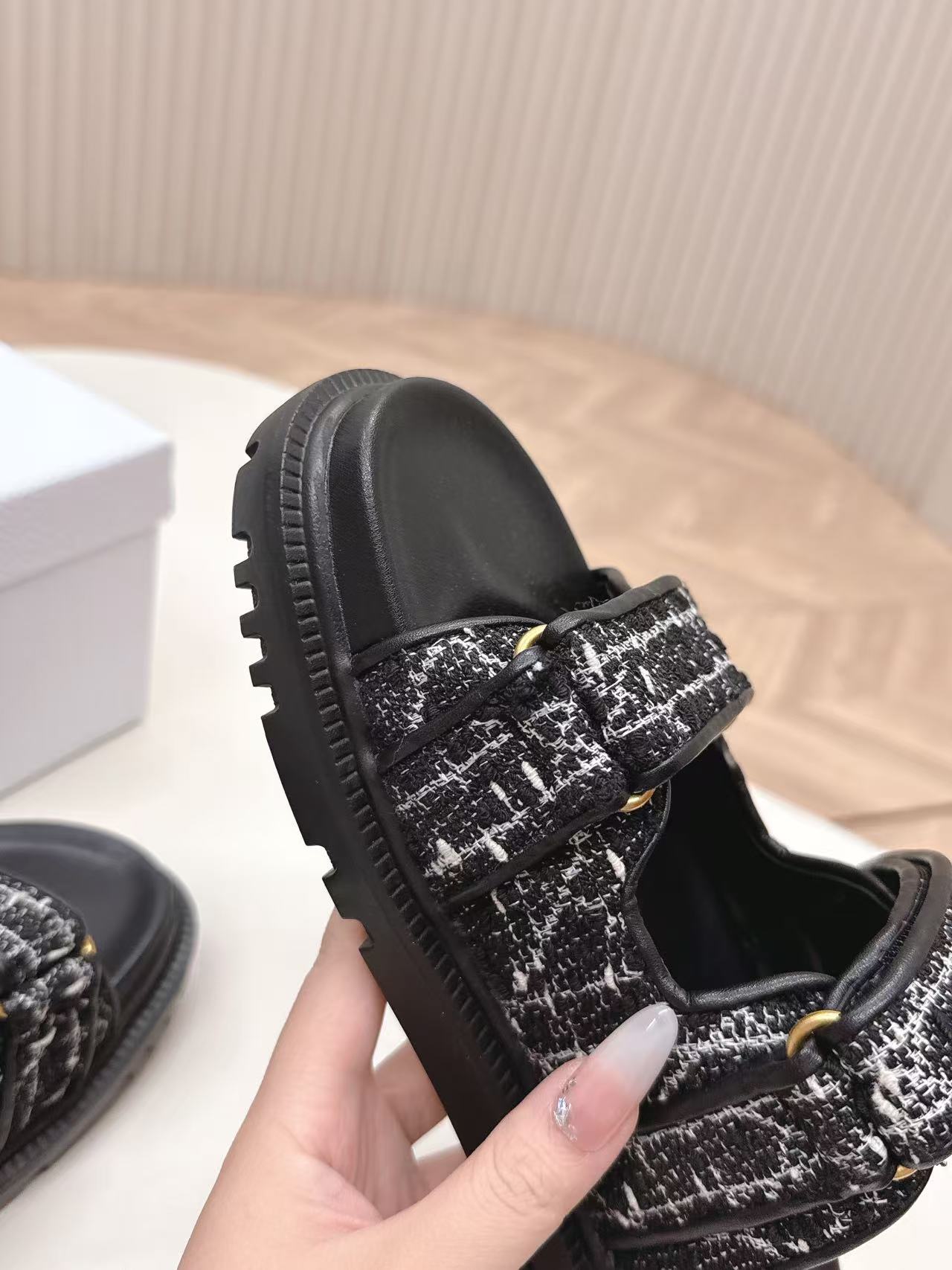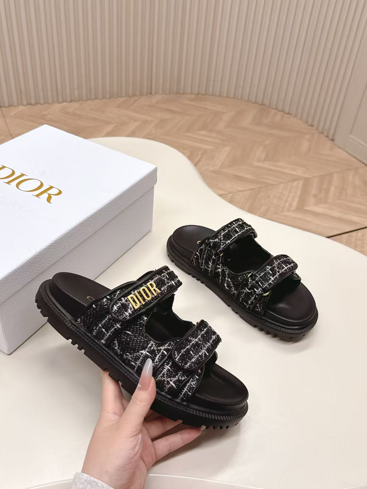 DIORACT SANDALS IN BLACK TWEED WITH GOLD LOGO BUCKLE
