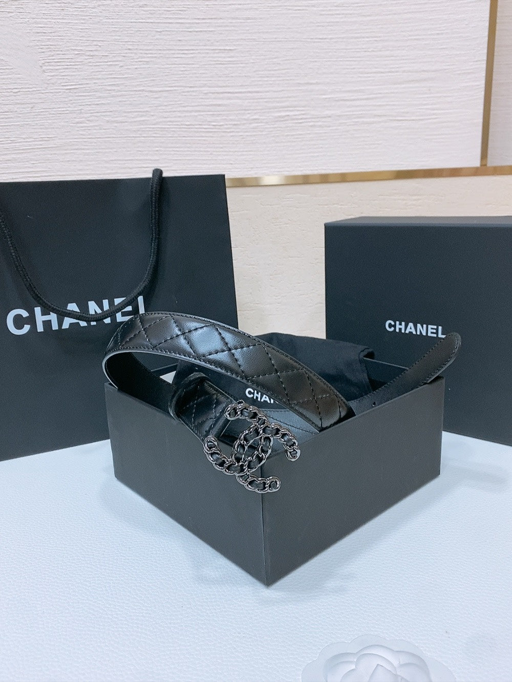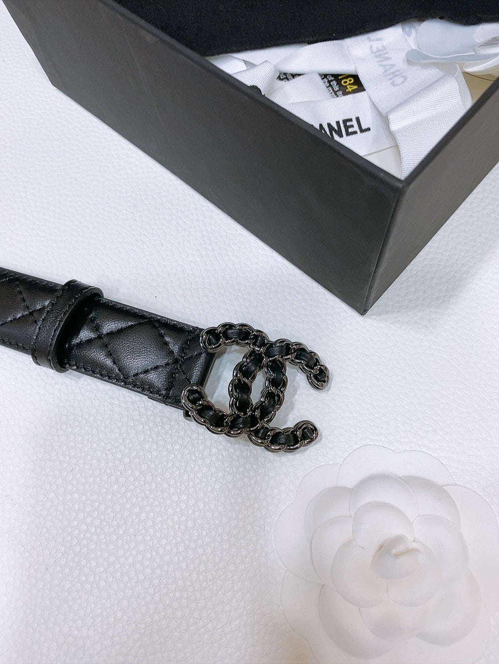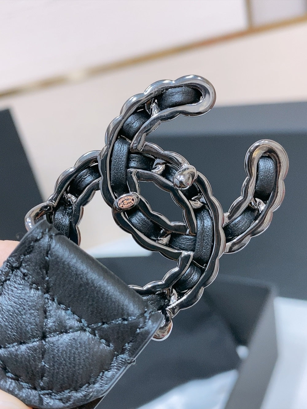 DOUBLE C 30MM IN BLACK QUILTED CALFSKIN INTERWOVEN BLACK CHAIN BUCKLE