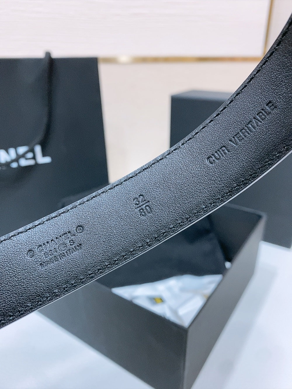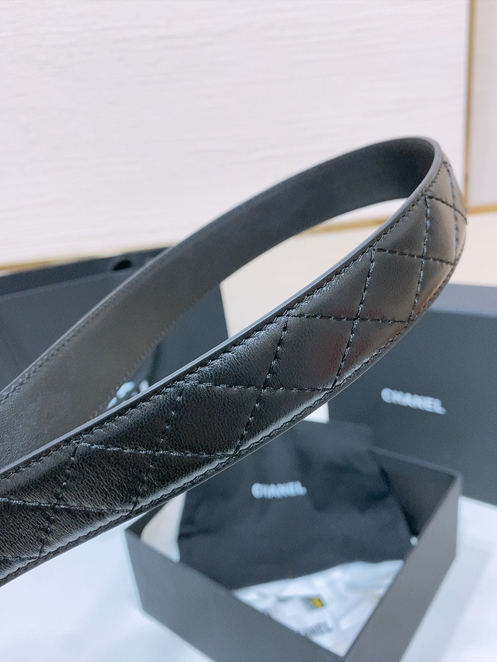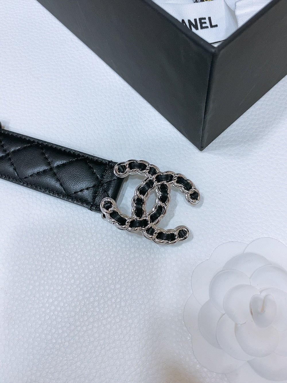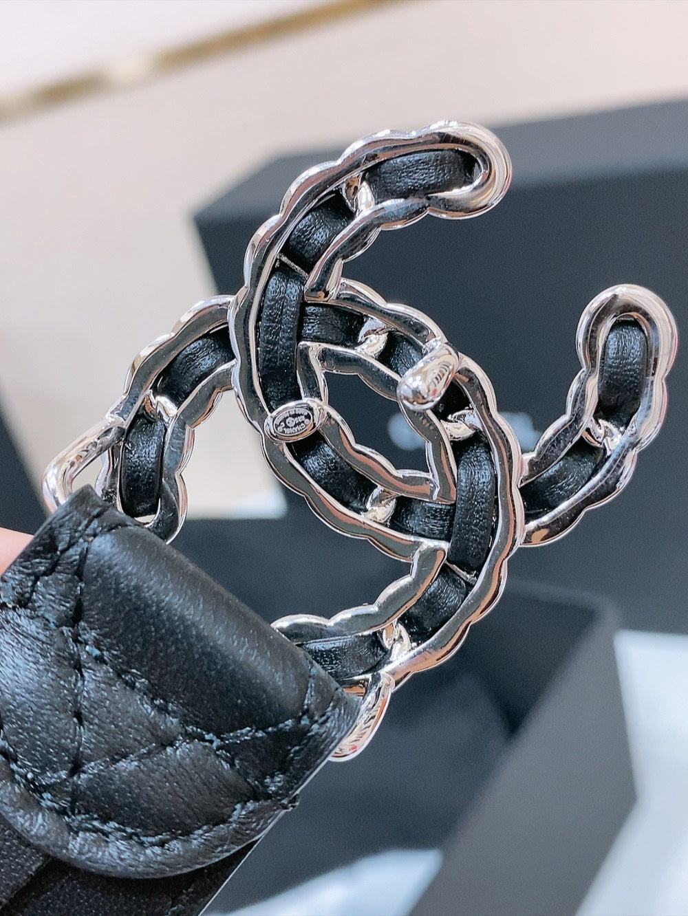 DOUBLE C 30MM IN BLACK QUILTED CALFSKIN INTERWOVEN SILVER CHAIN BUCKLE