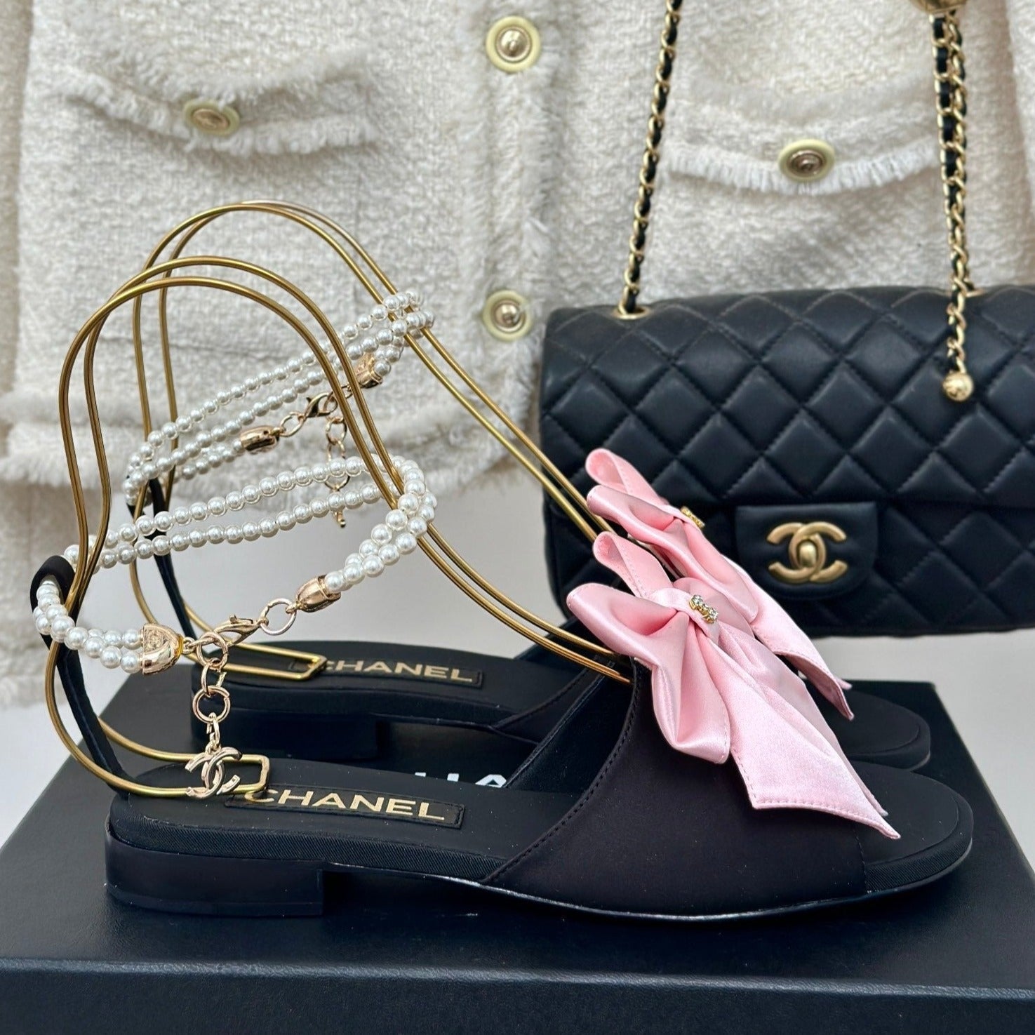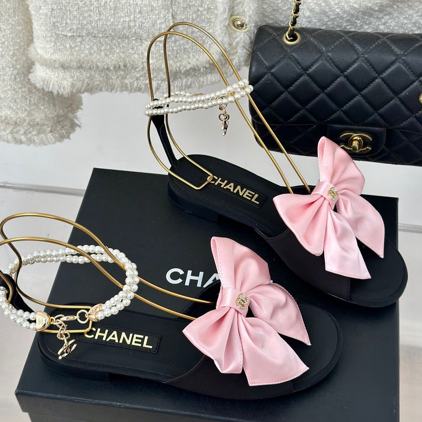 Double C Big Bow Pearl Chain Sandals Light Pink Black Lambskin