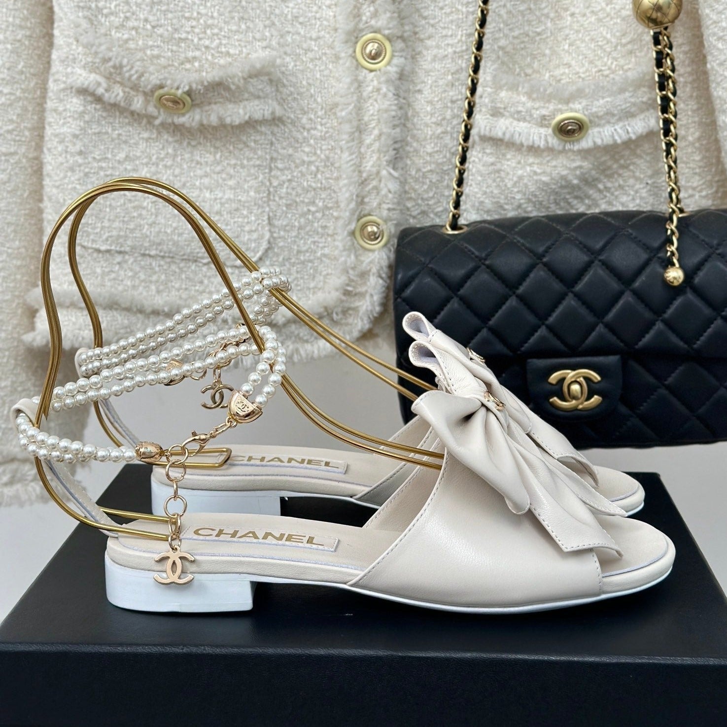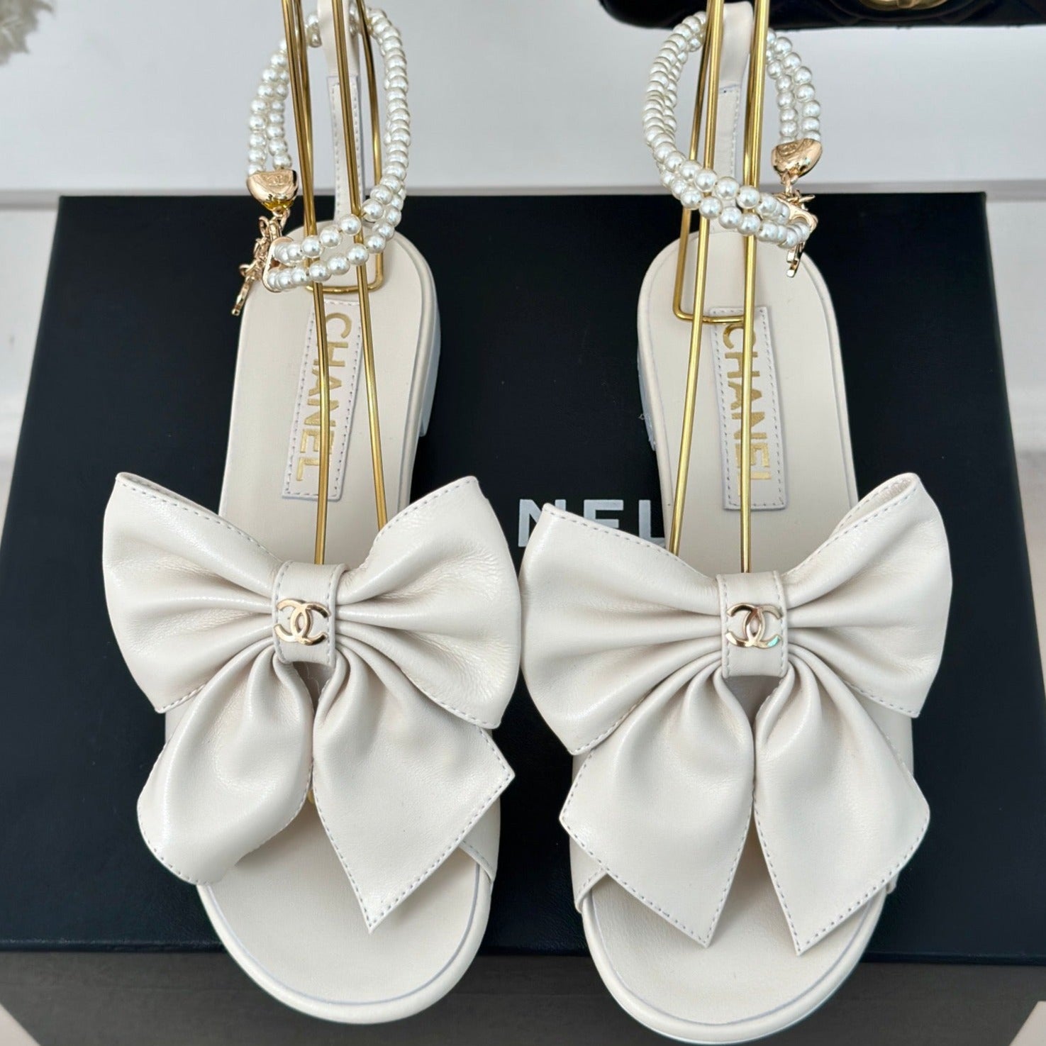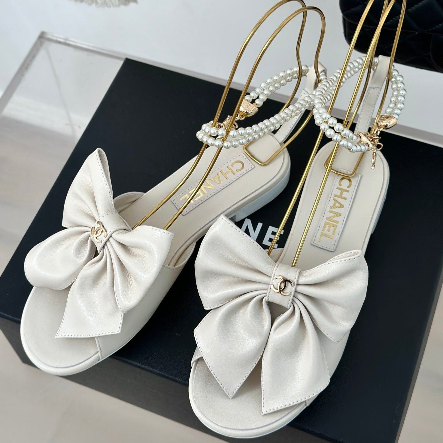 Double C Big Bow Pearl Chain Sandals White Lambskin