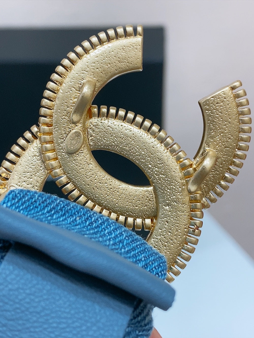 DOUBLE C ELASTIC BELT 30MM IN BLUE DENIM WITH GOLD BUCKLE EMBOSSED PEARL