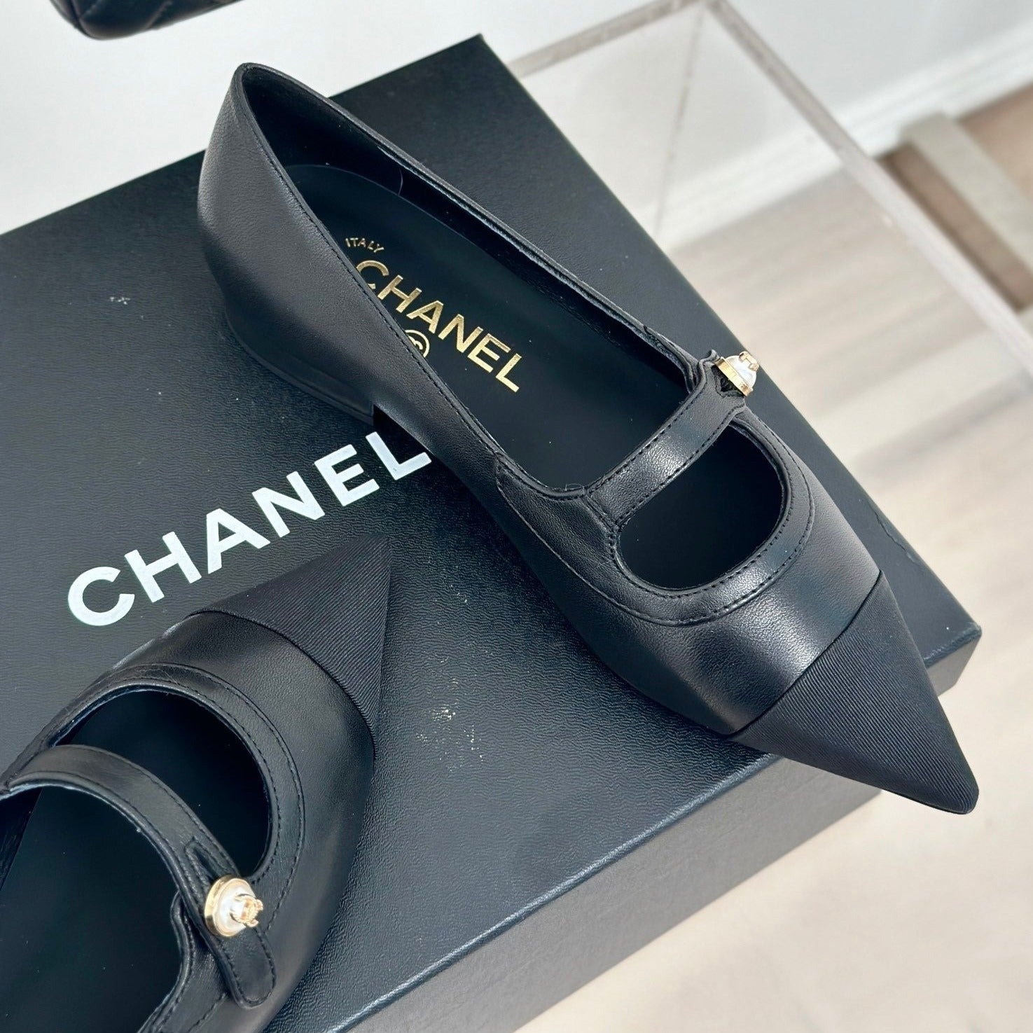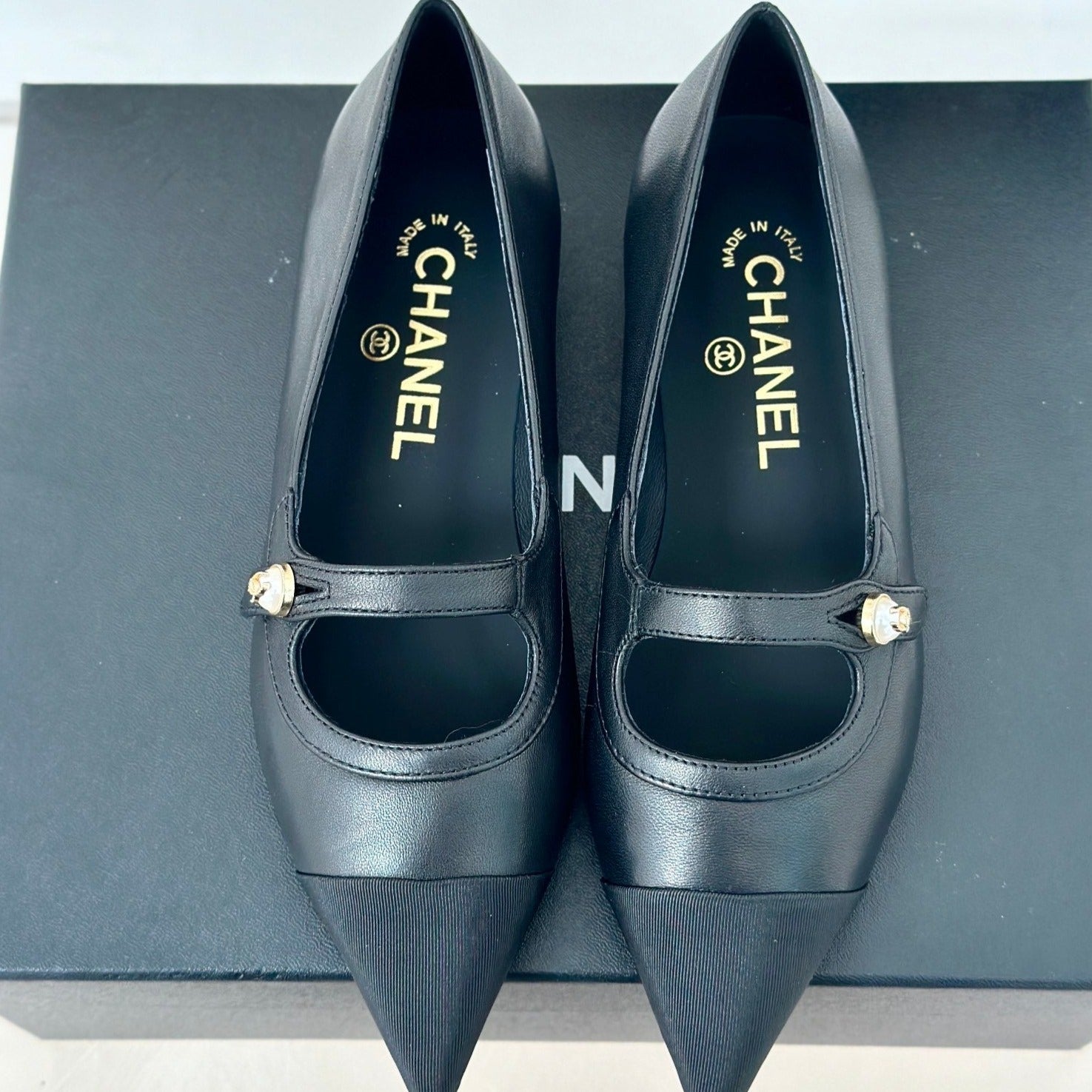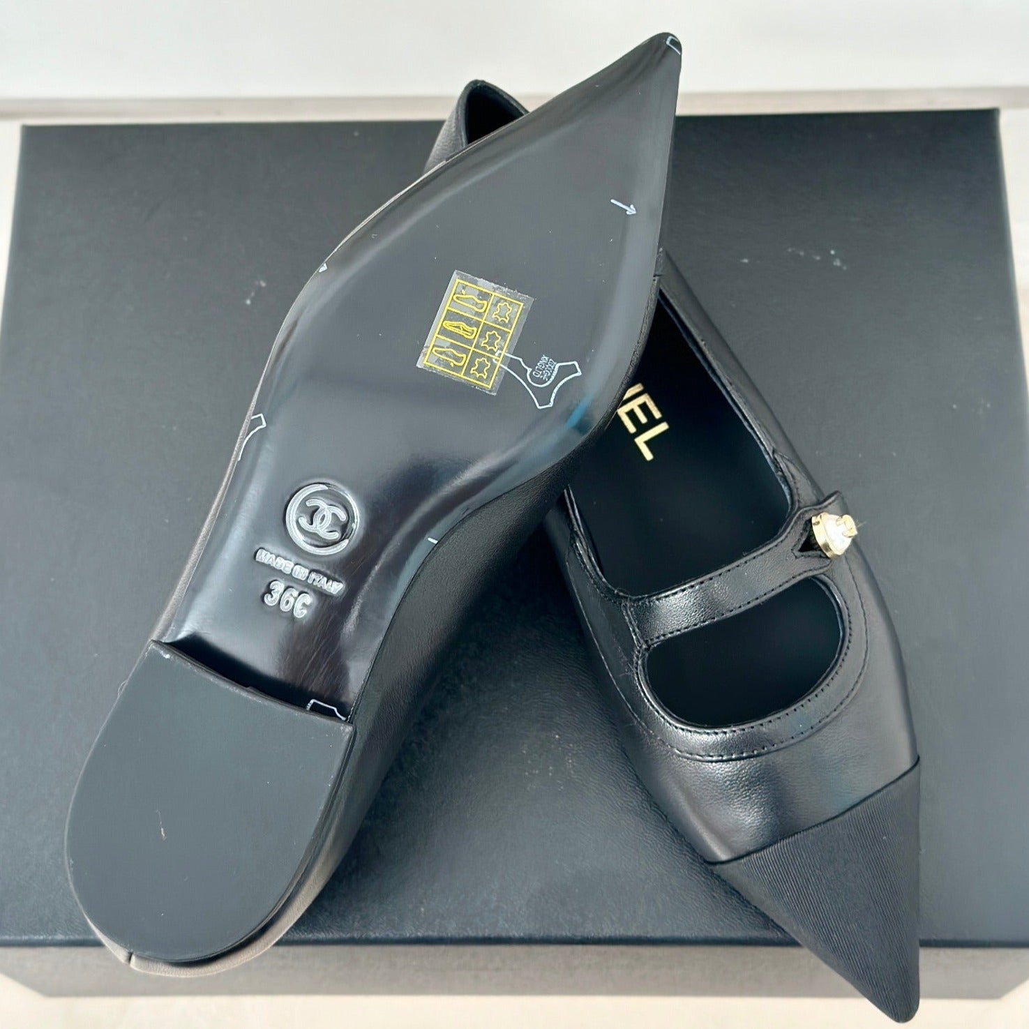 Double C Milan Runway Pointed Toe Mary Jane Shoes Black Lambskin