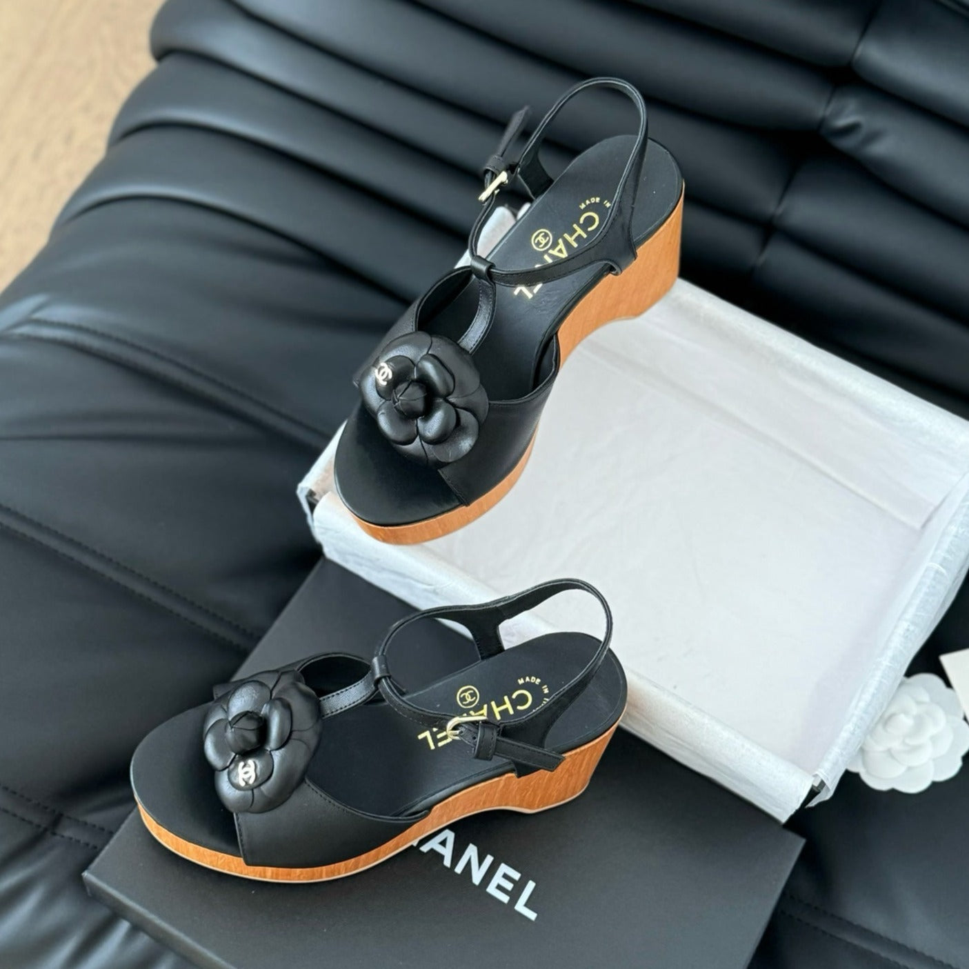 Double C New Wood Grain Platform Sandal Black Lambskin