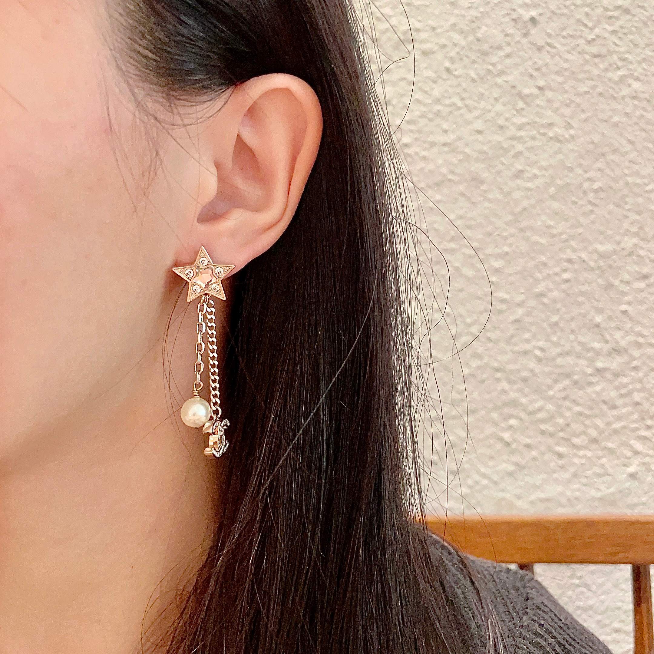 DOUBLE C STUD EARRINGS IN GOLD METAL STAR STONE DOUBLE CHAINS ONE WITH LOGO AND ONE WITH PEARL