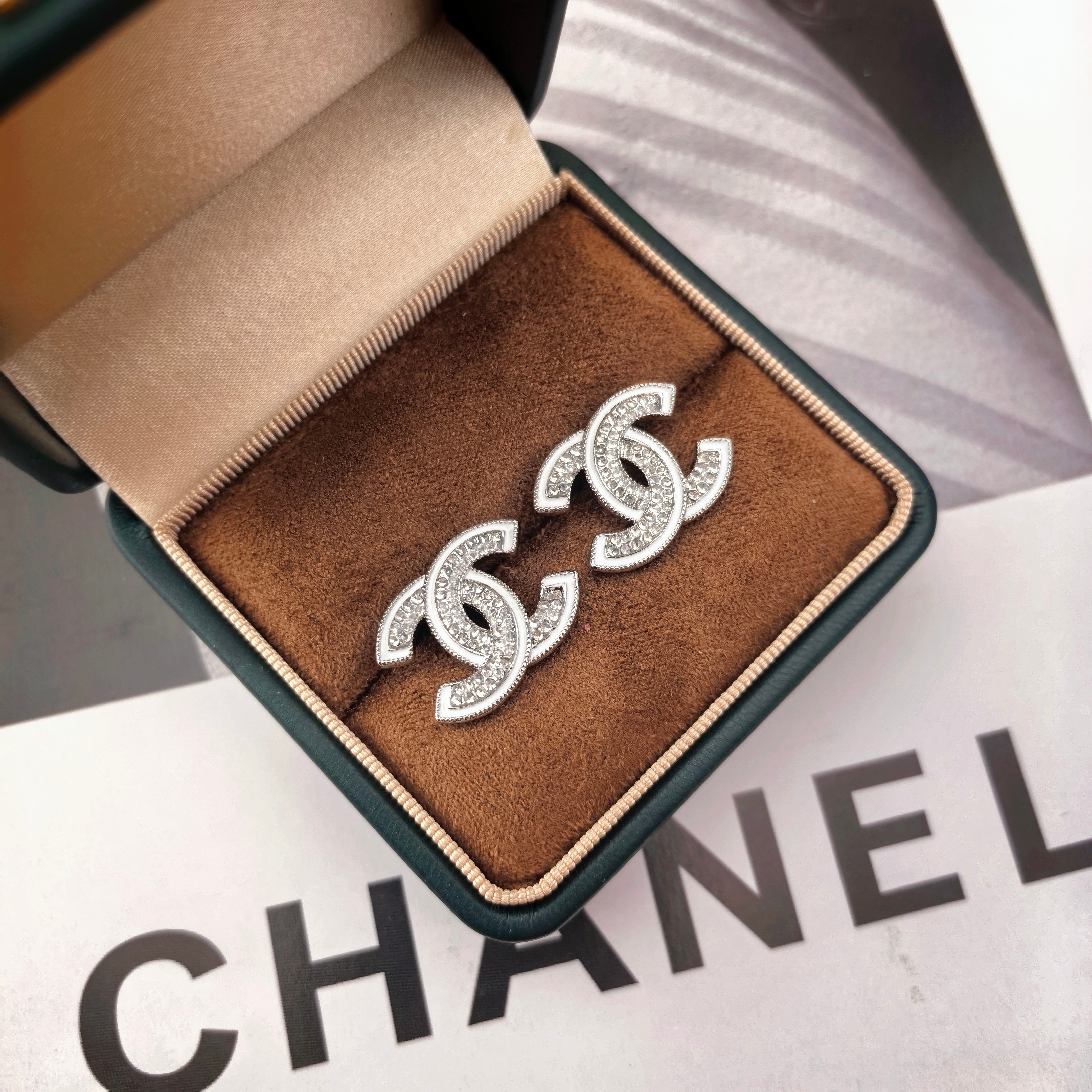 DOUBLE C STUD EARRINGS WITH WHITE TRIM AND CLEAR STONE LOGO
