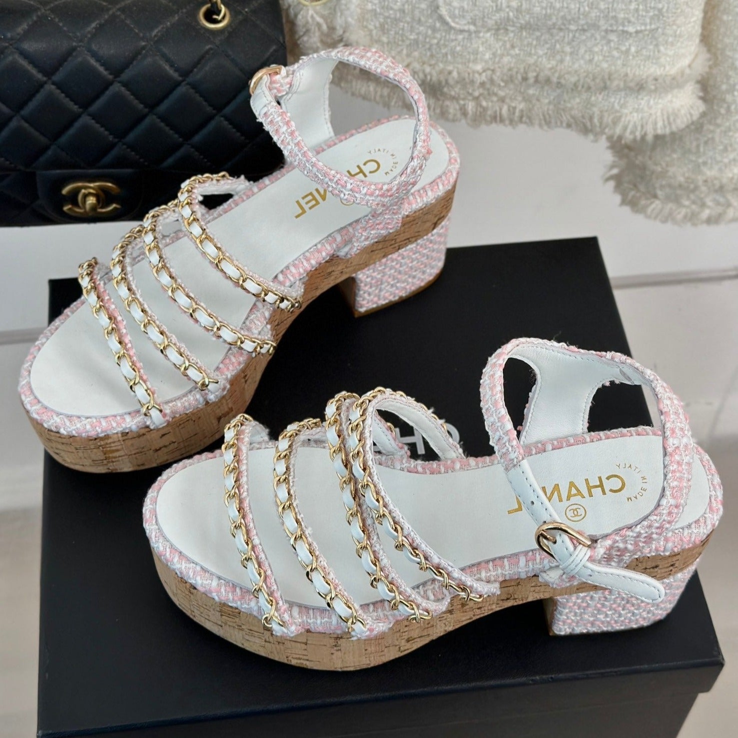 Double C Wooden Chain Platform Block Heel Sandals Blush Pink/ White