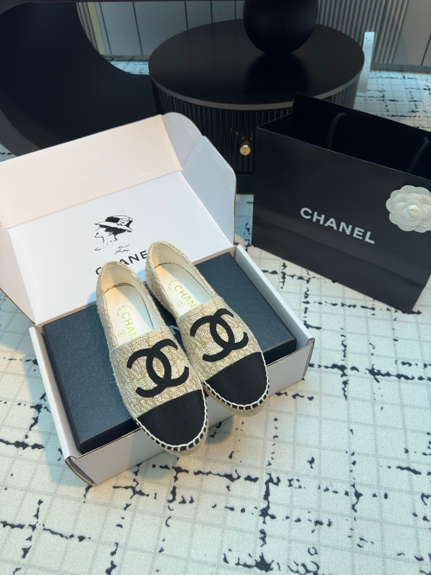 ESPADRILLES LOAFERS IN BEIGE TWEED AND BLACK SATIN