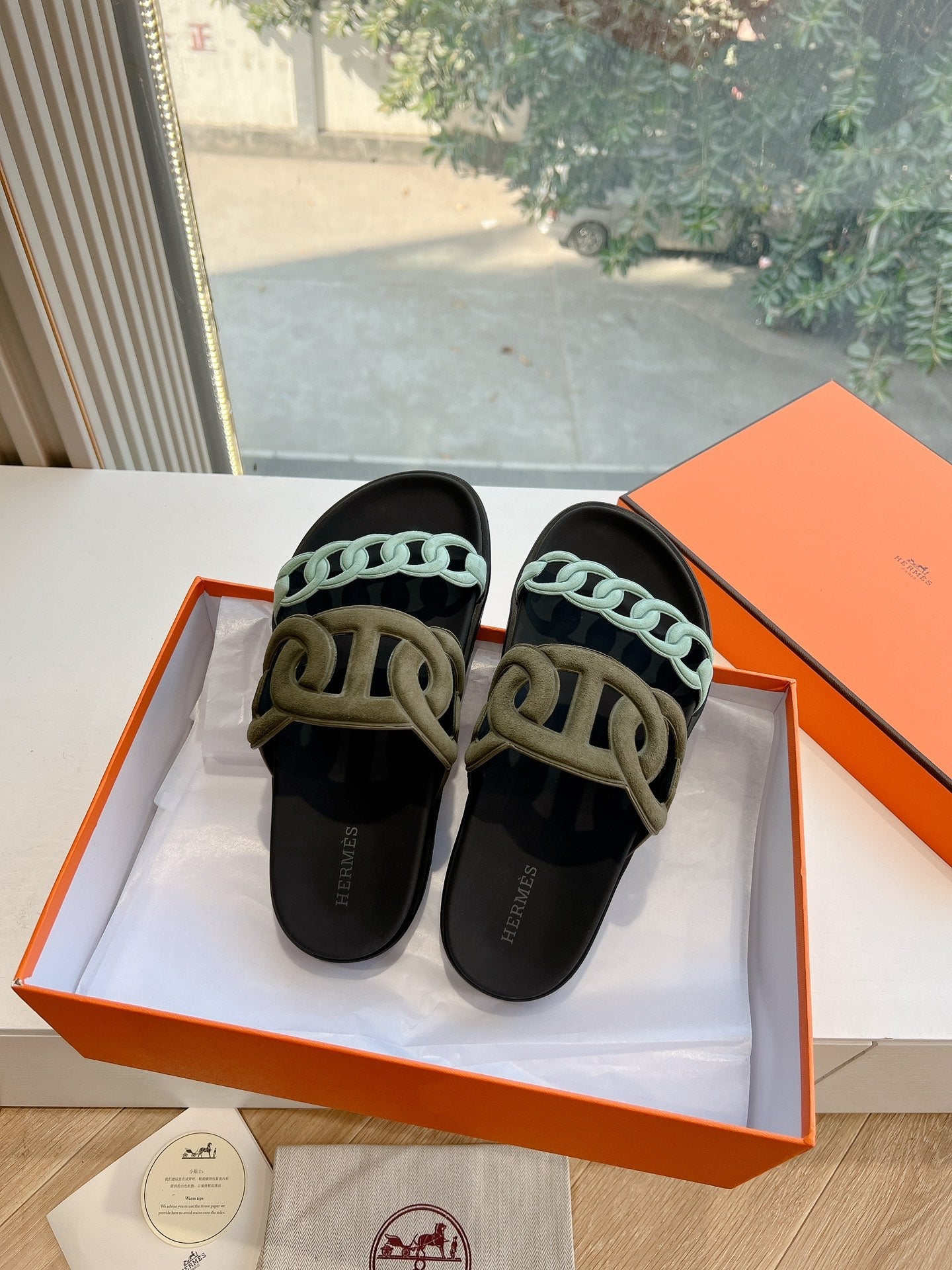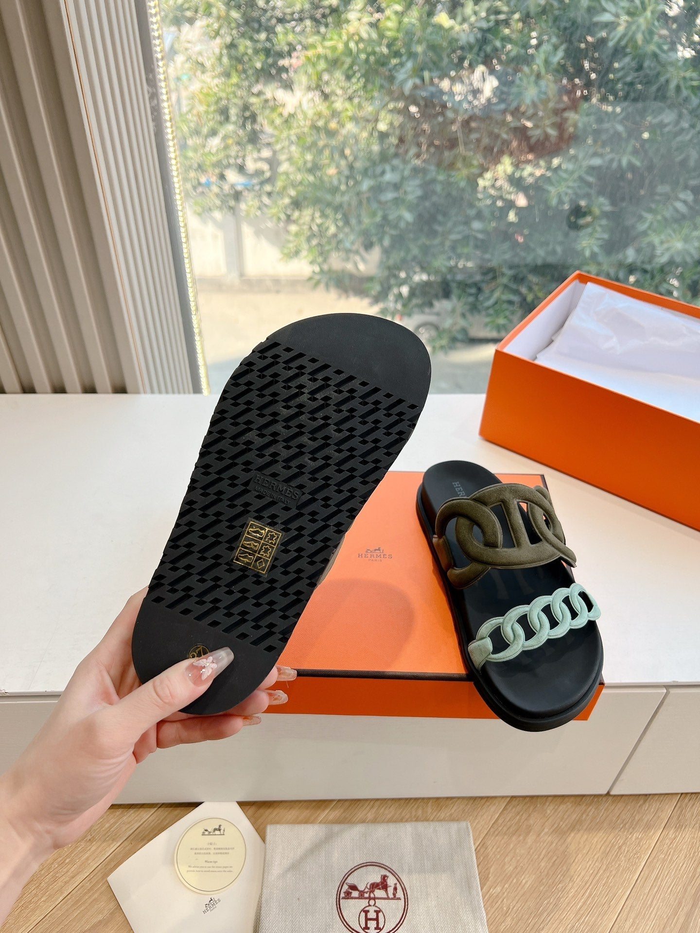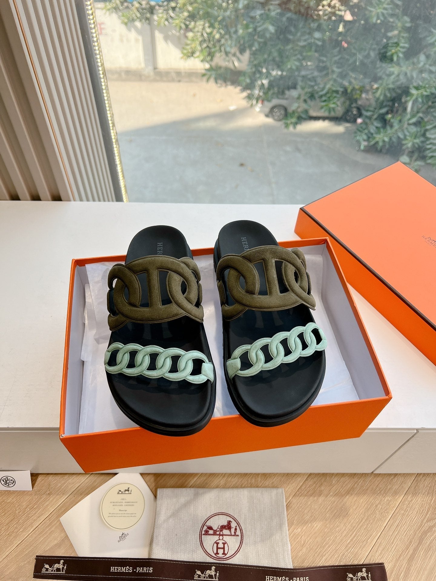 EXTRA SANDAL IN ARMY GREEN MIX ELECTRIC BLUE CALFSKIN