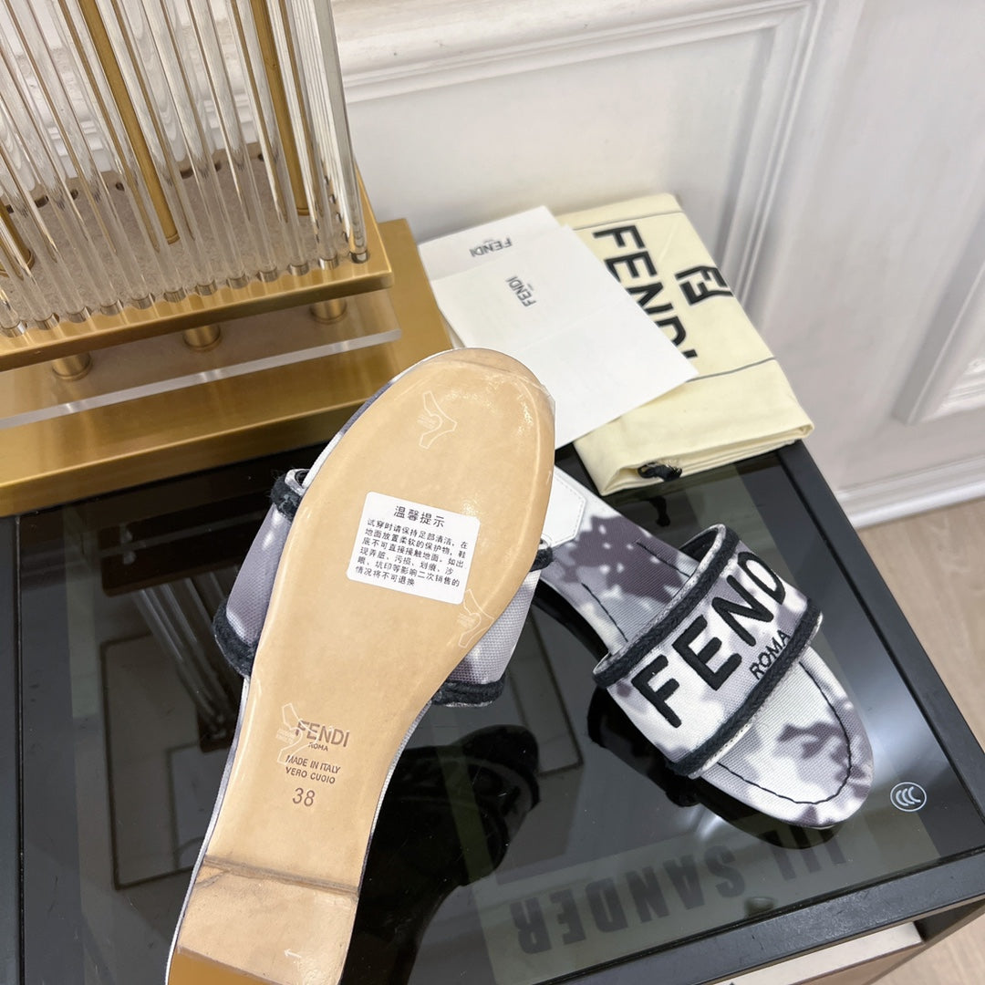 FENDI FLORAL SLIDES IN BLACK MIX WHITE FABRIC