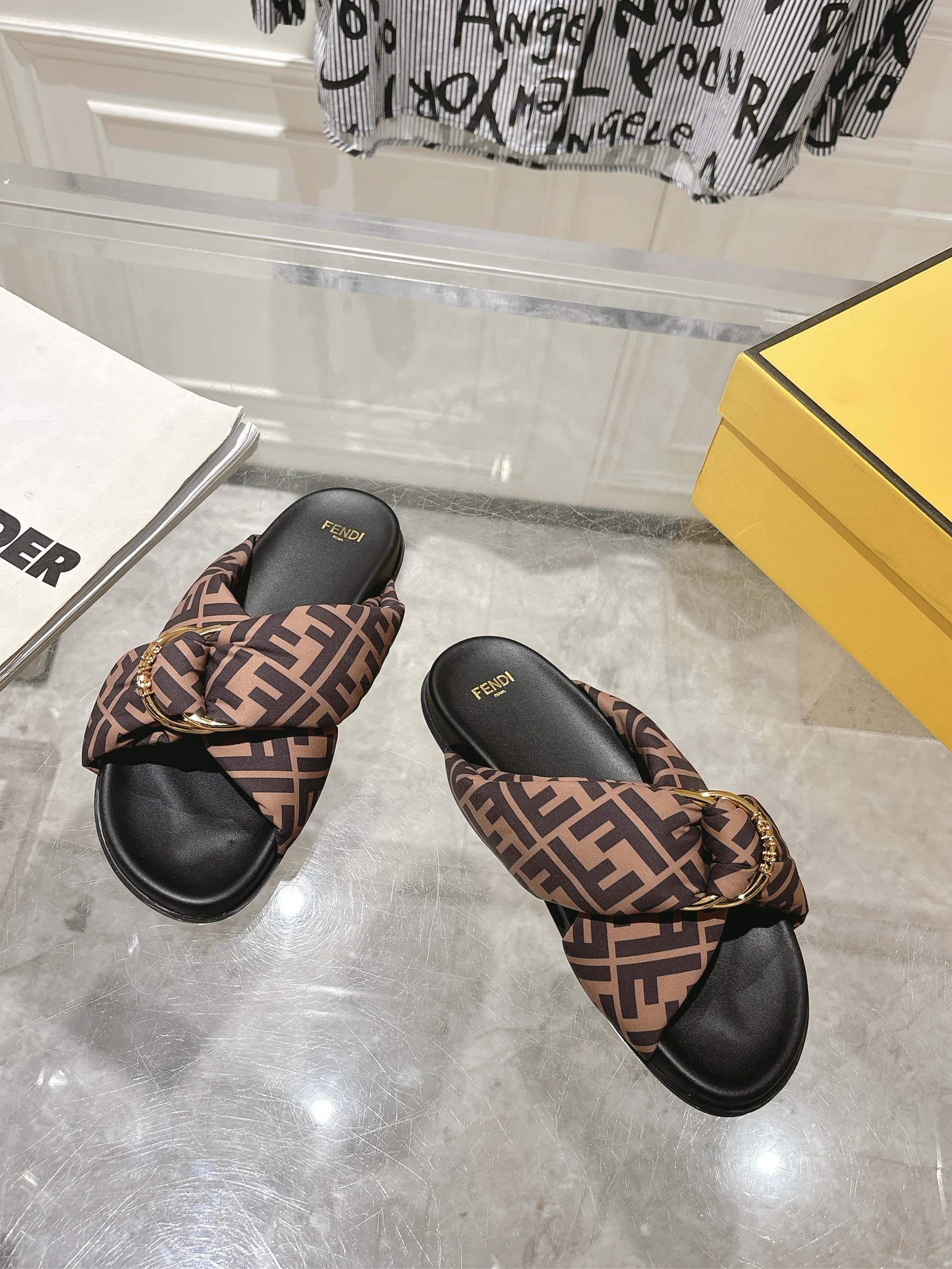 FF KNOT SLIDE SANDALS IN BROWN FABRIC