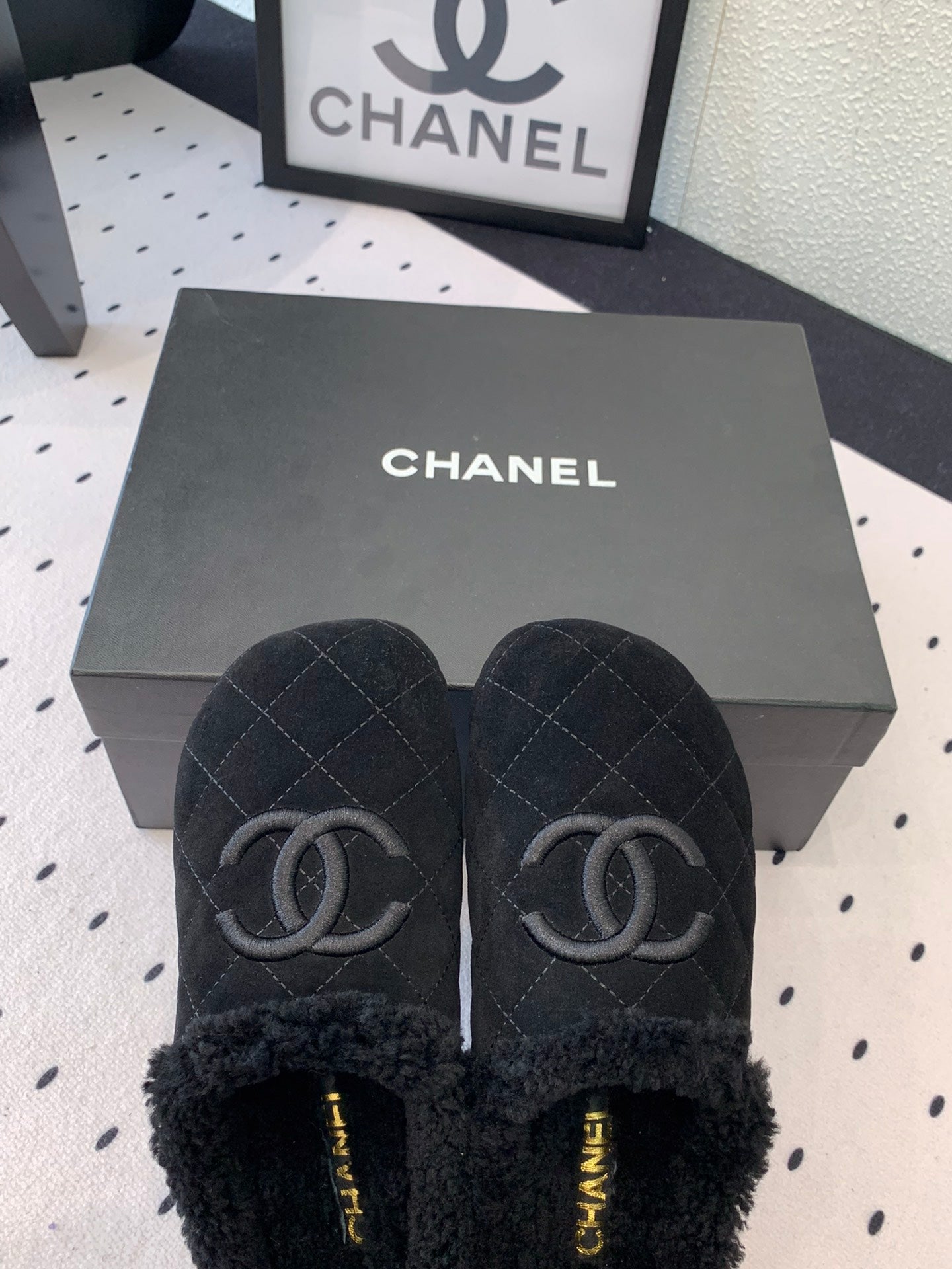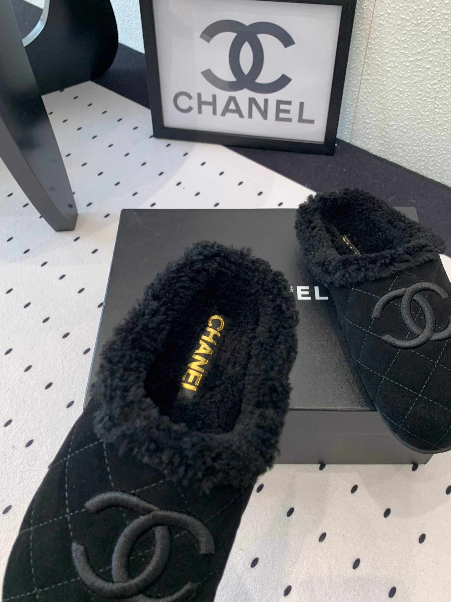 FLAT MULE IN BLACK SUEDE AND LAMB FUR LINING