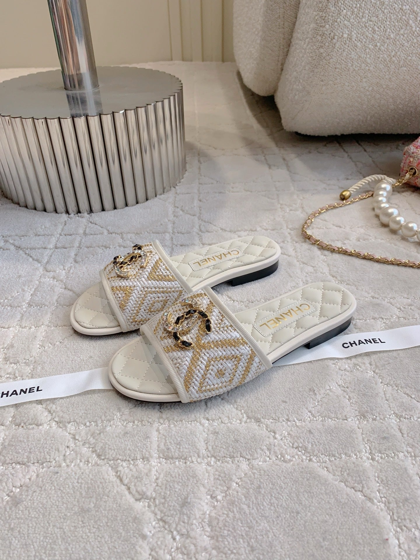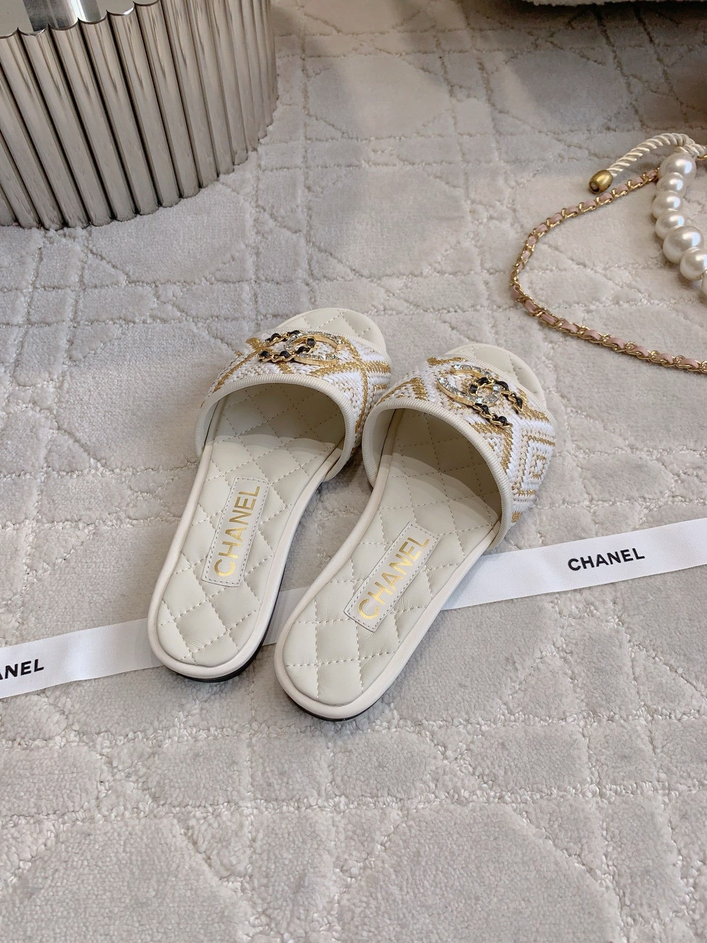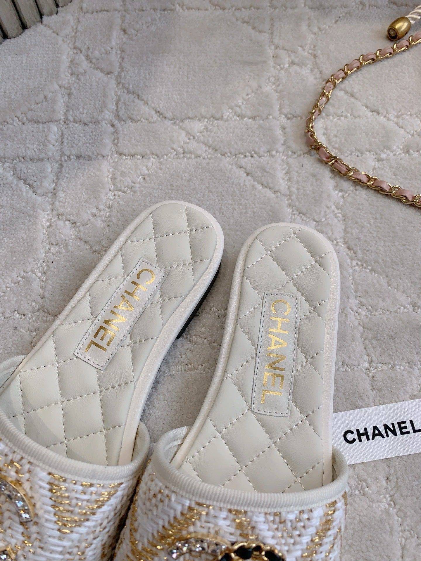 FLAT SANDALS LOGO STONE AND CHAIN IN WHITE LAMBSKIN WITH RAFFIA