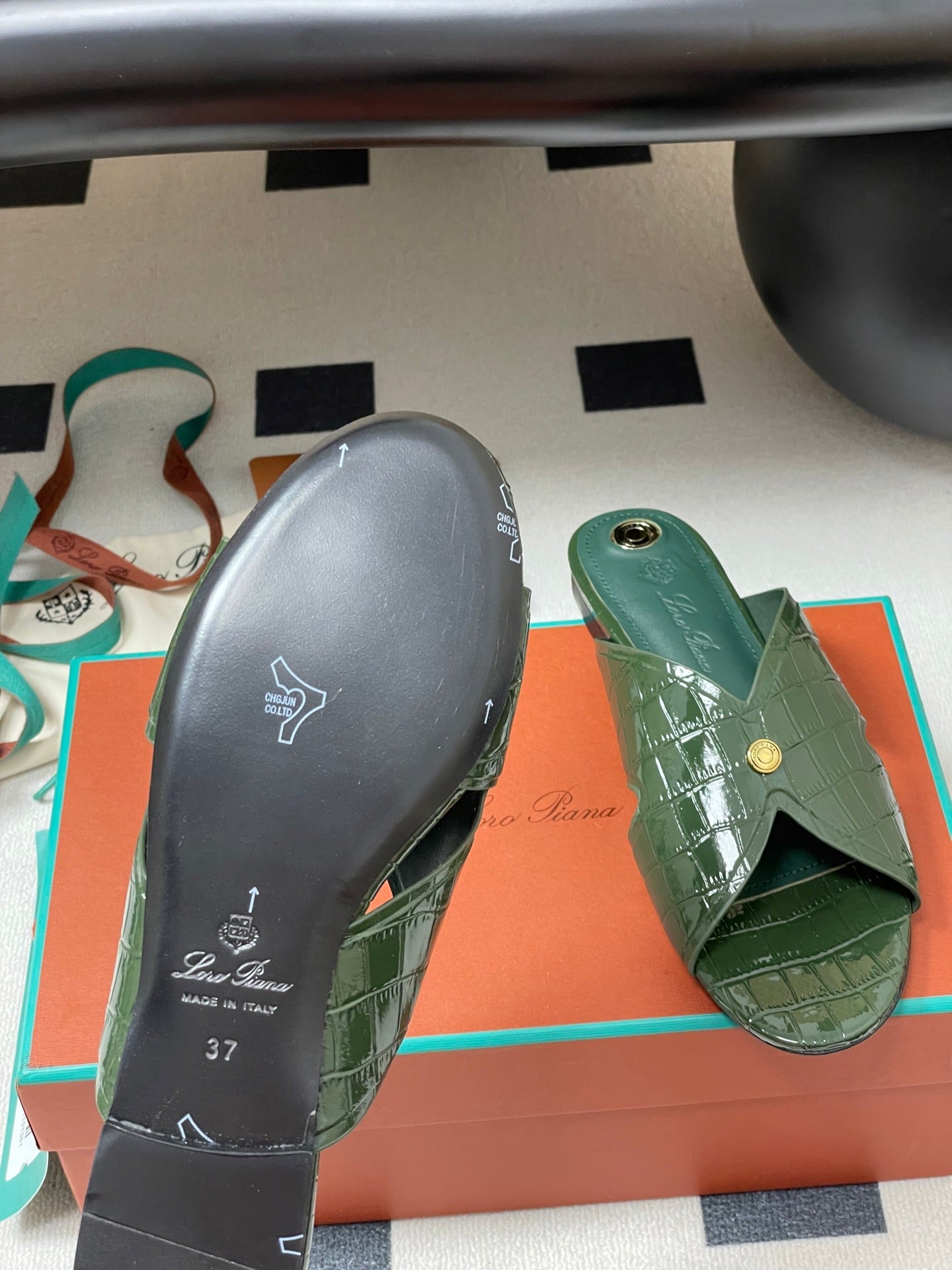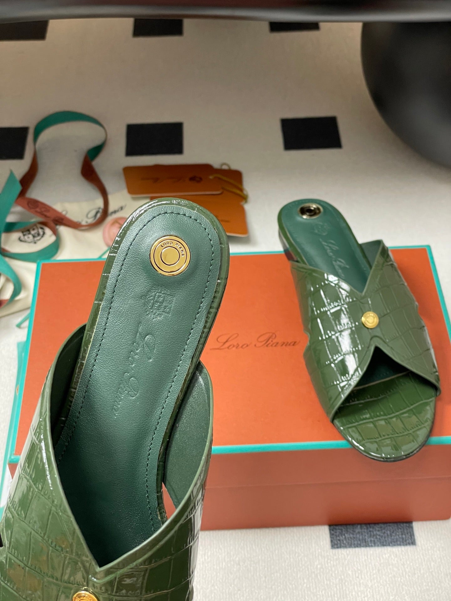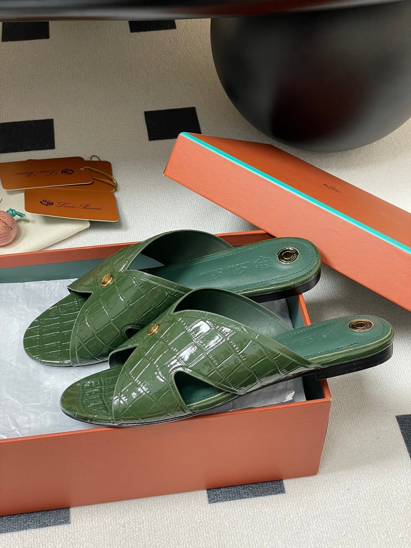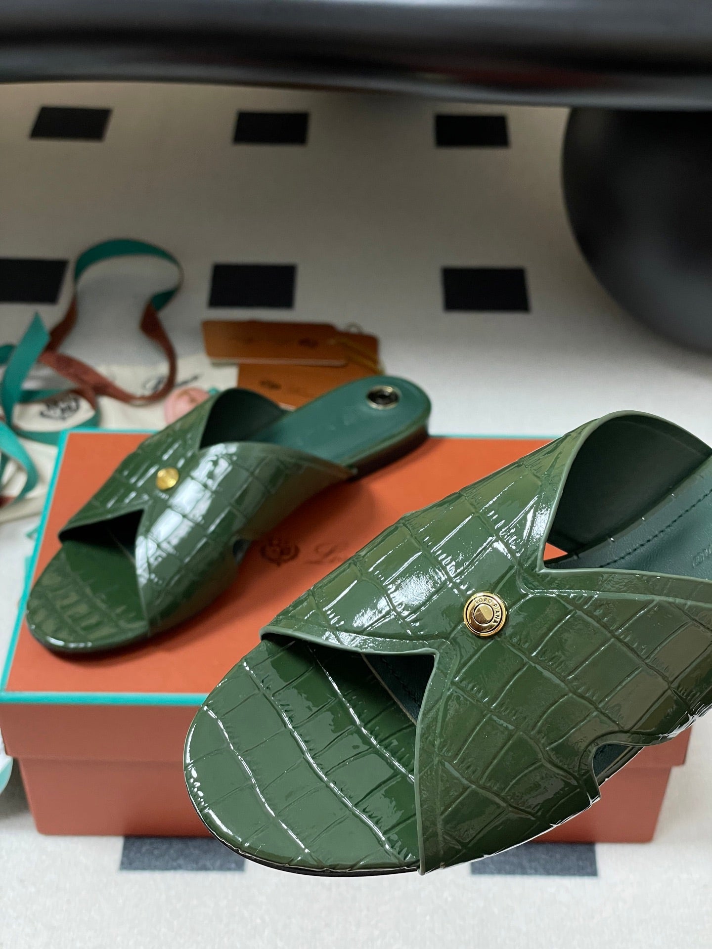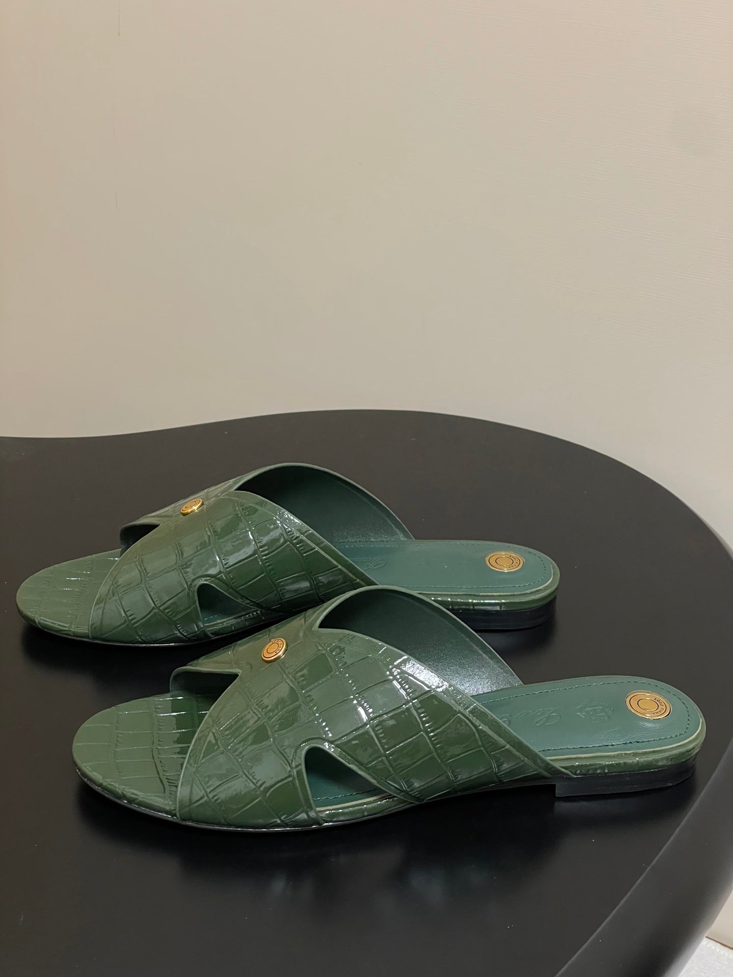 FLAT SLIPPERS IN MOSS GREEN CALFSKIN SNAKE EMBOSSING