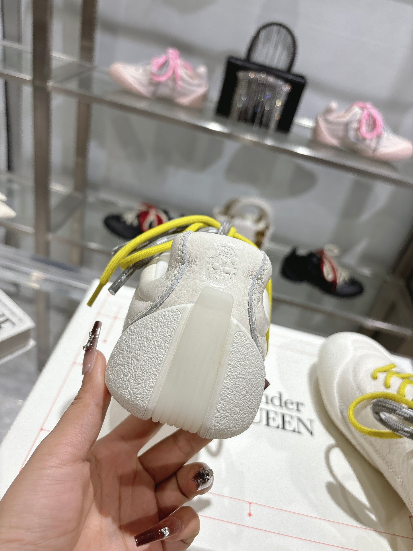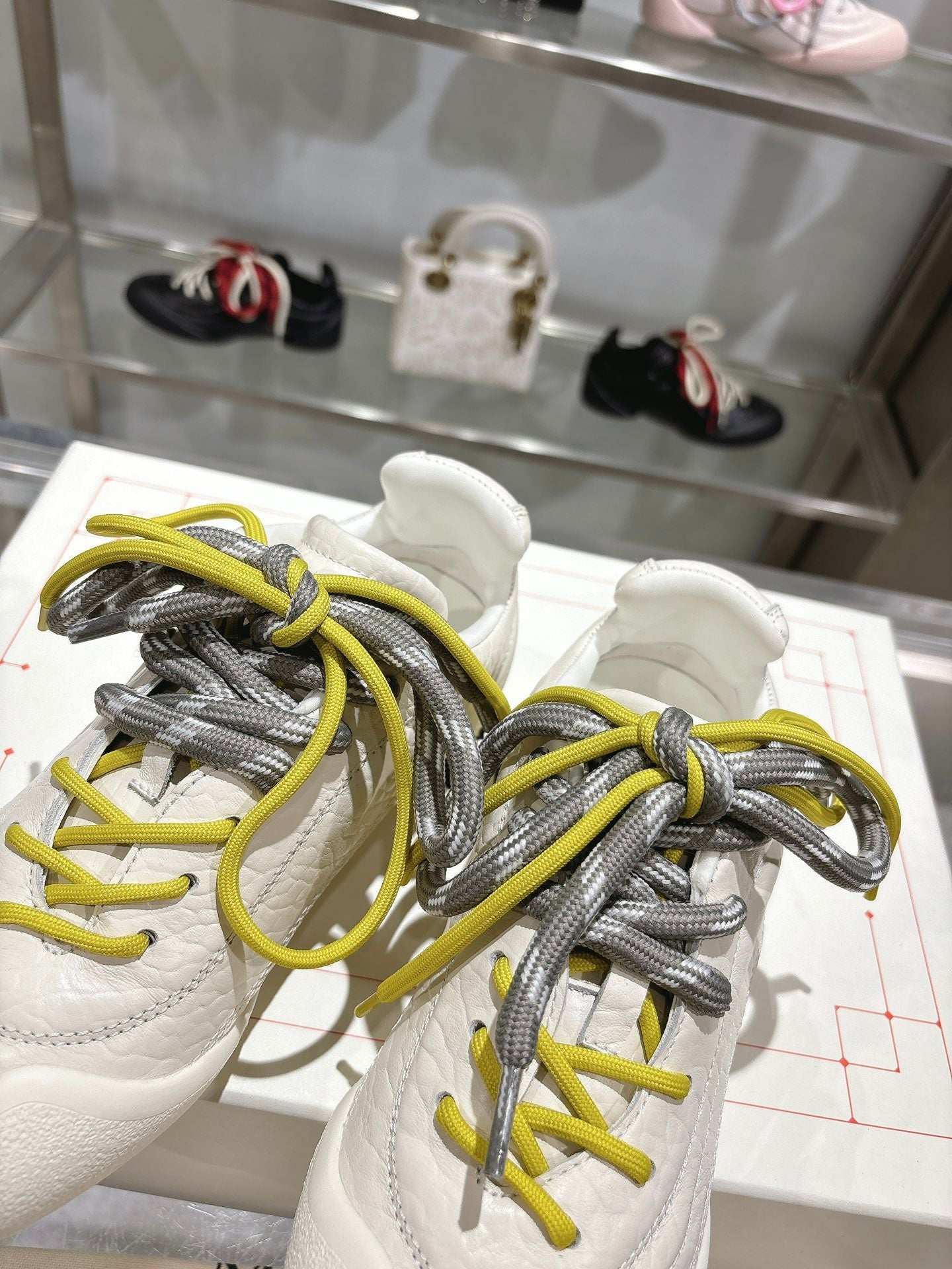 FLEXION SNEAKER IN OFF WHITE CALFSKIN WITH NEON YELLOW AND GREY LACES