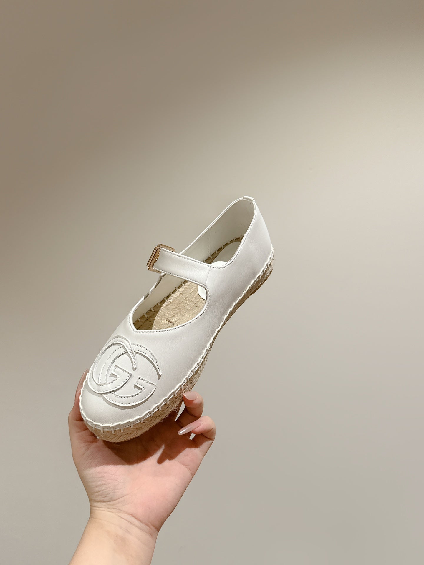 GG CROSS STRAP FLAT SHOES IN WHITE CALFSKIN WITH STRAW SOLE