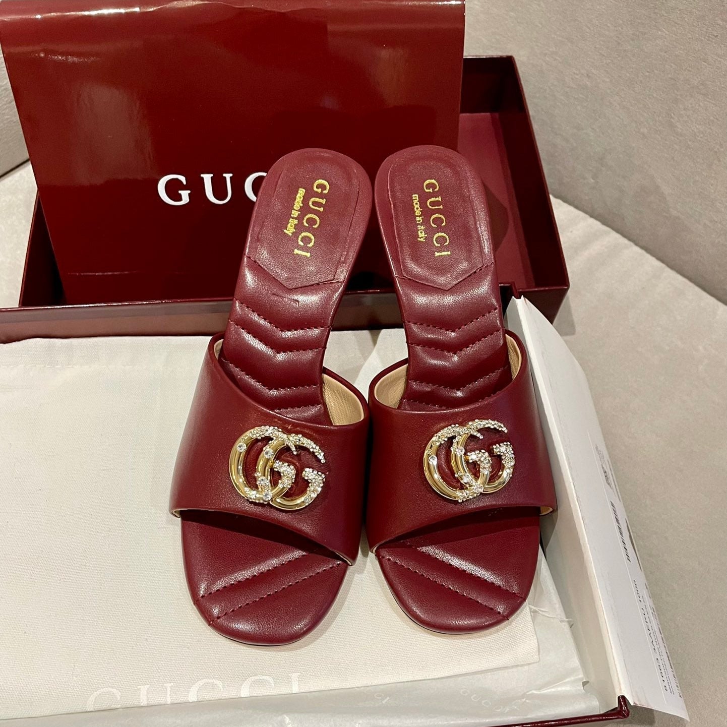 GG HIGH HEELS 70 IN RED LAMBSKIN GOLD HARDWARE WITH CRYSTALS