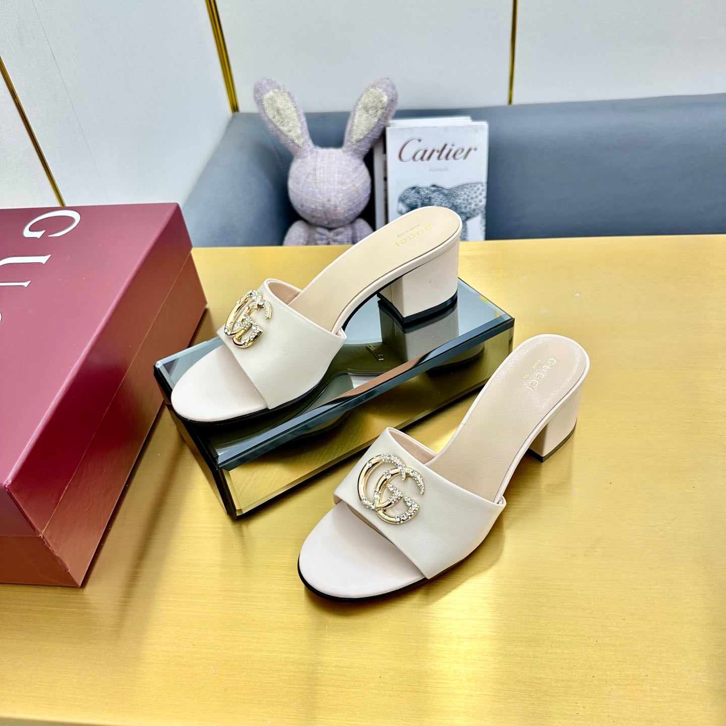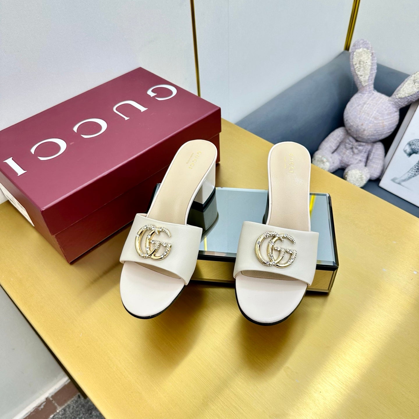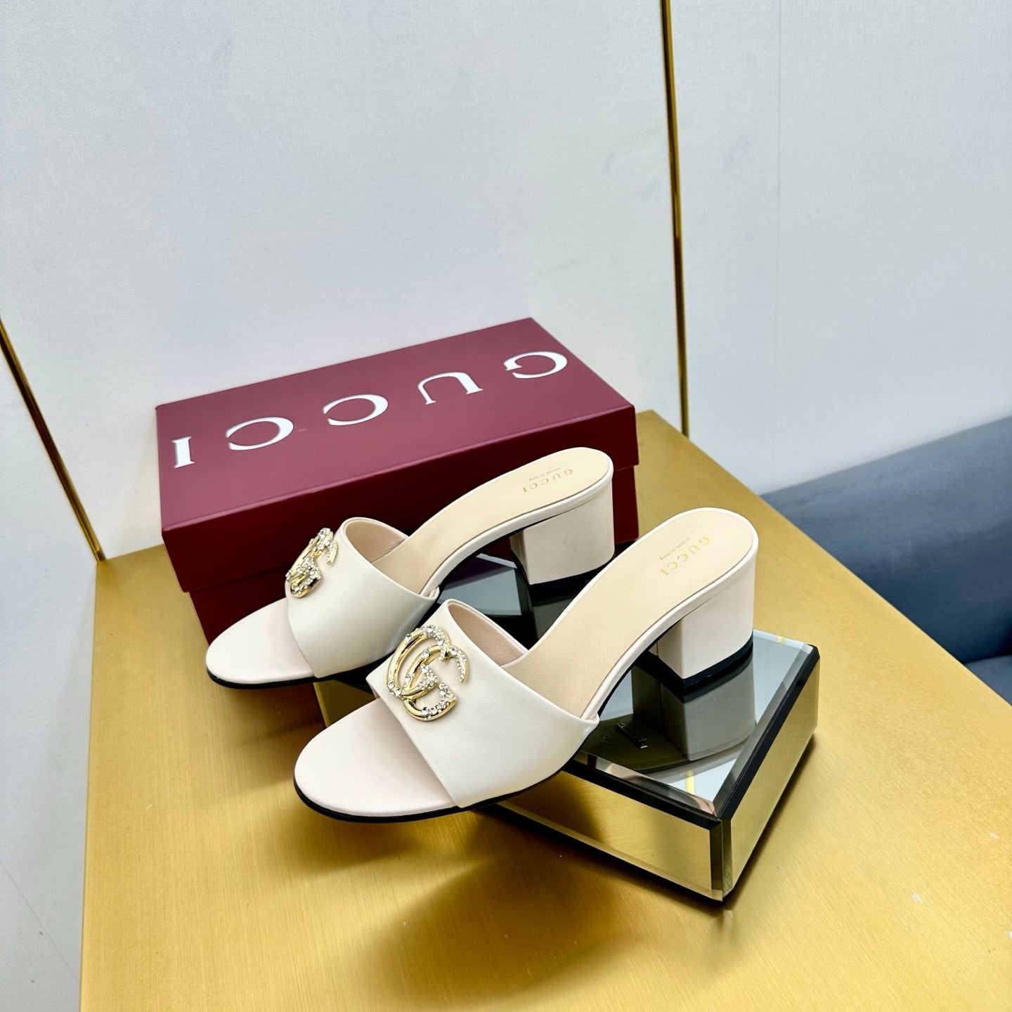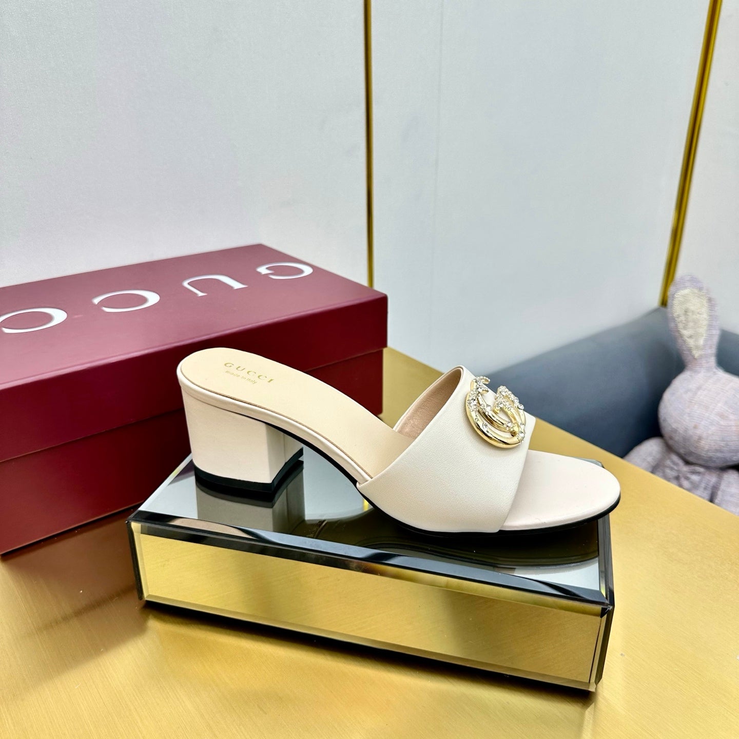 GG HIGH HEELS IN CREAM WHITE CALFSKIN GOLD-TONE HARDWARE WITH RHINESTONES
