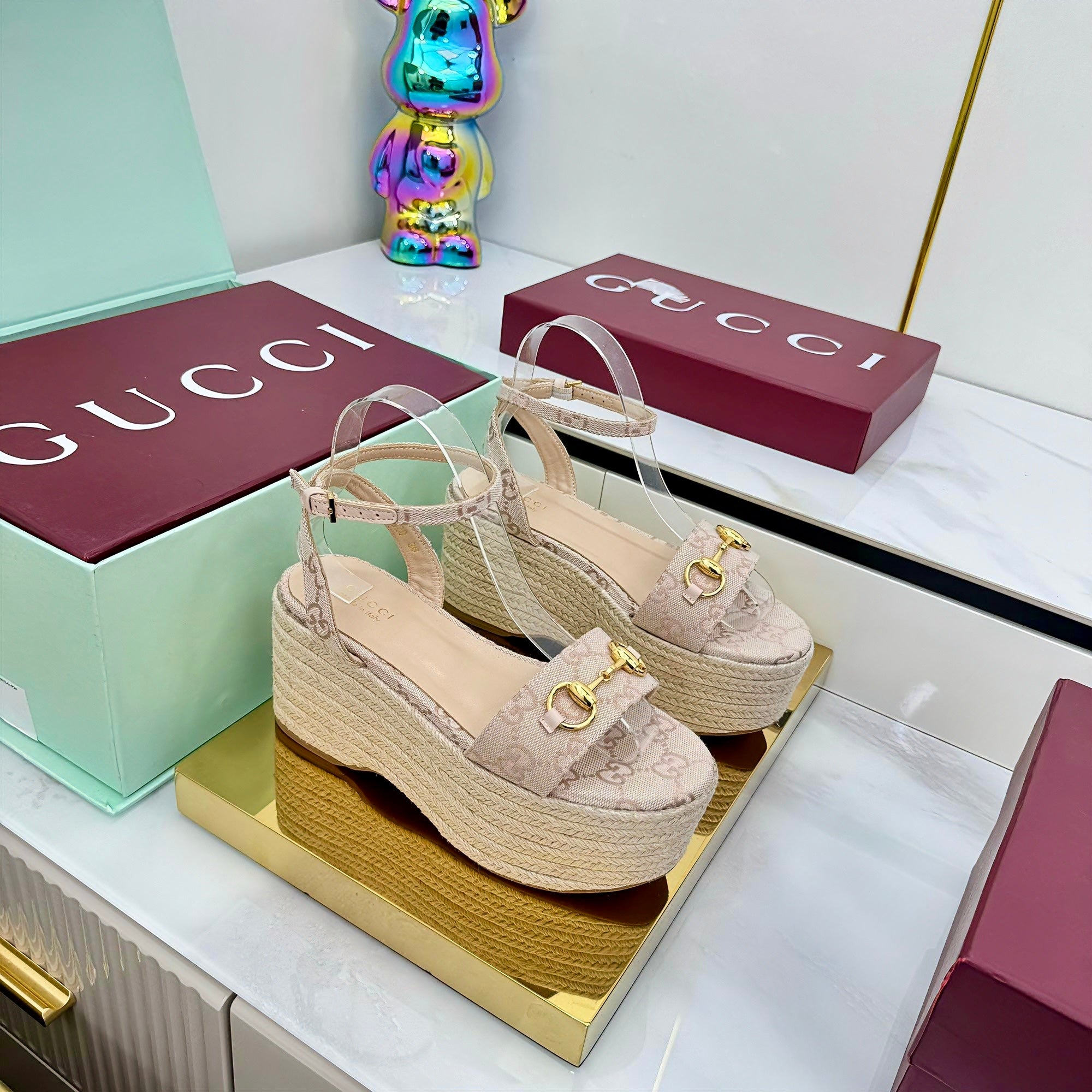 GG HIGH WEDGE SANDALS IN NUDE BEIGE FABRIC AND RAFFIA WITH GOLD HARDWARE