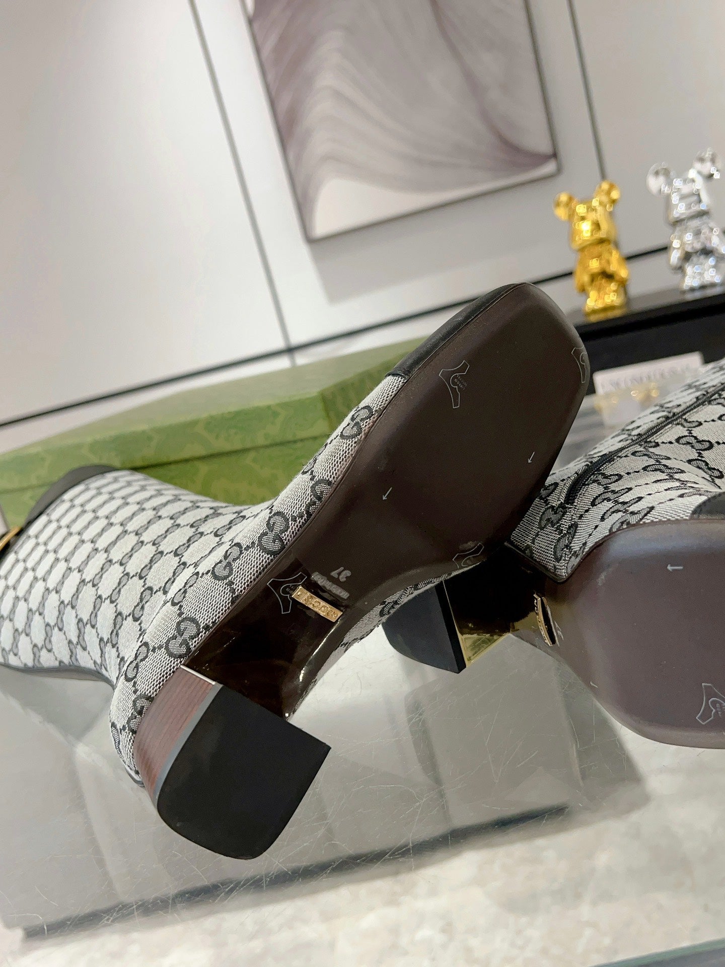 GG KNEE BOOTS IN LIGHT GRAY MONOGRAM CANVAS AND BLACK GLOSSY SHEEPSKIN