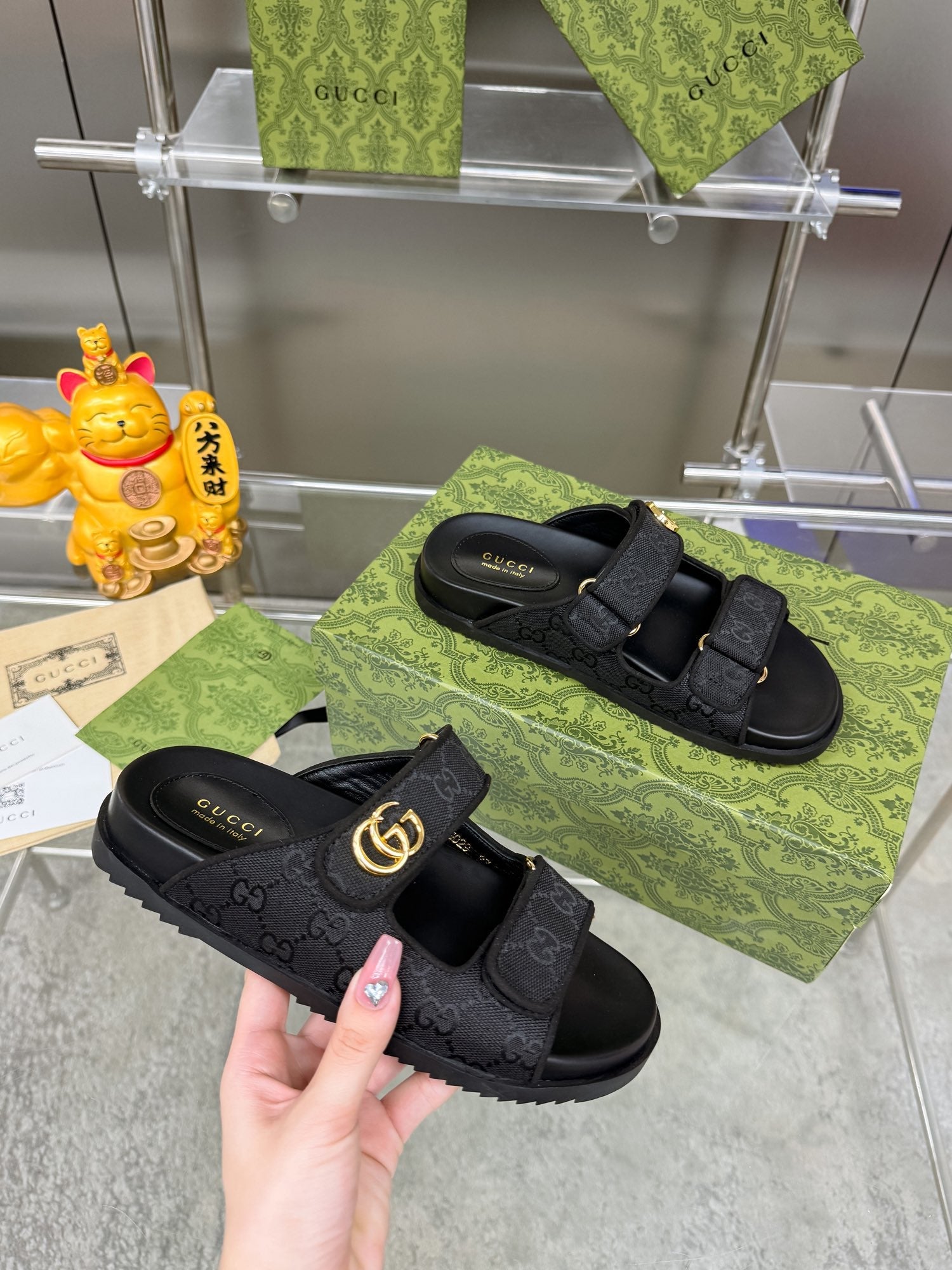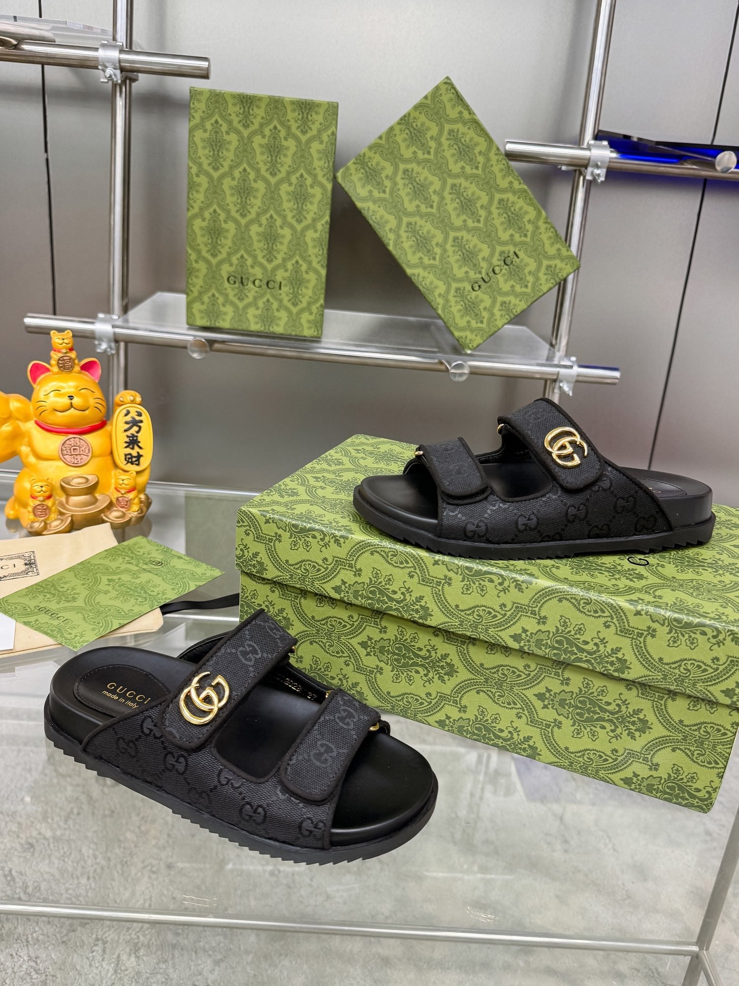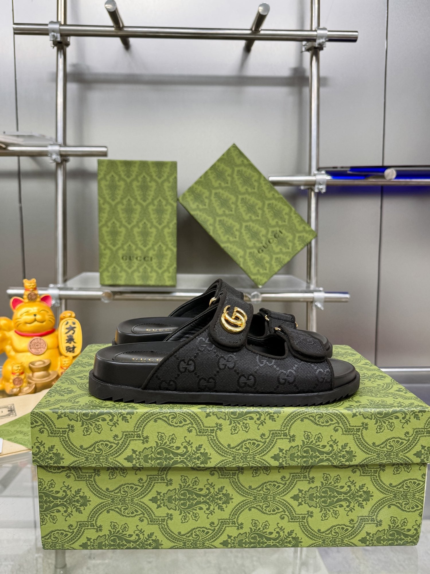 GG SANDALS IN BLACK FABRIC AND CALFSKIN WITH GOLD HARDWARE