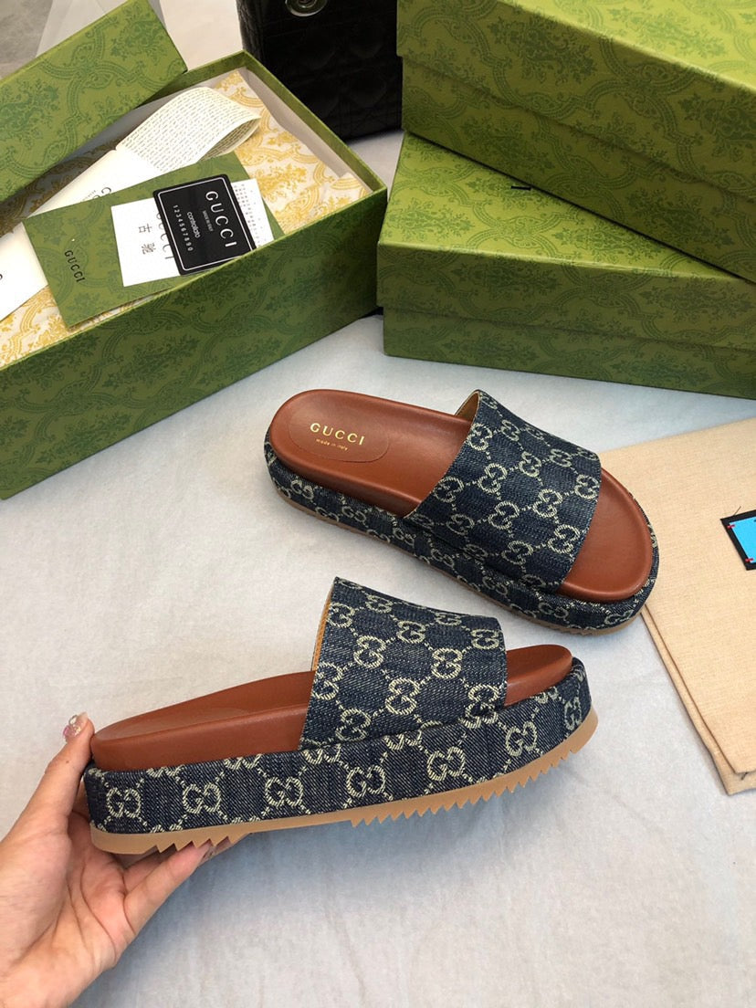 GG THICK PLATFORM SLIDES IN BLUE MONOGRAM EMBOSSED FABRIC