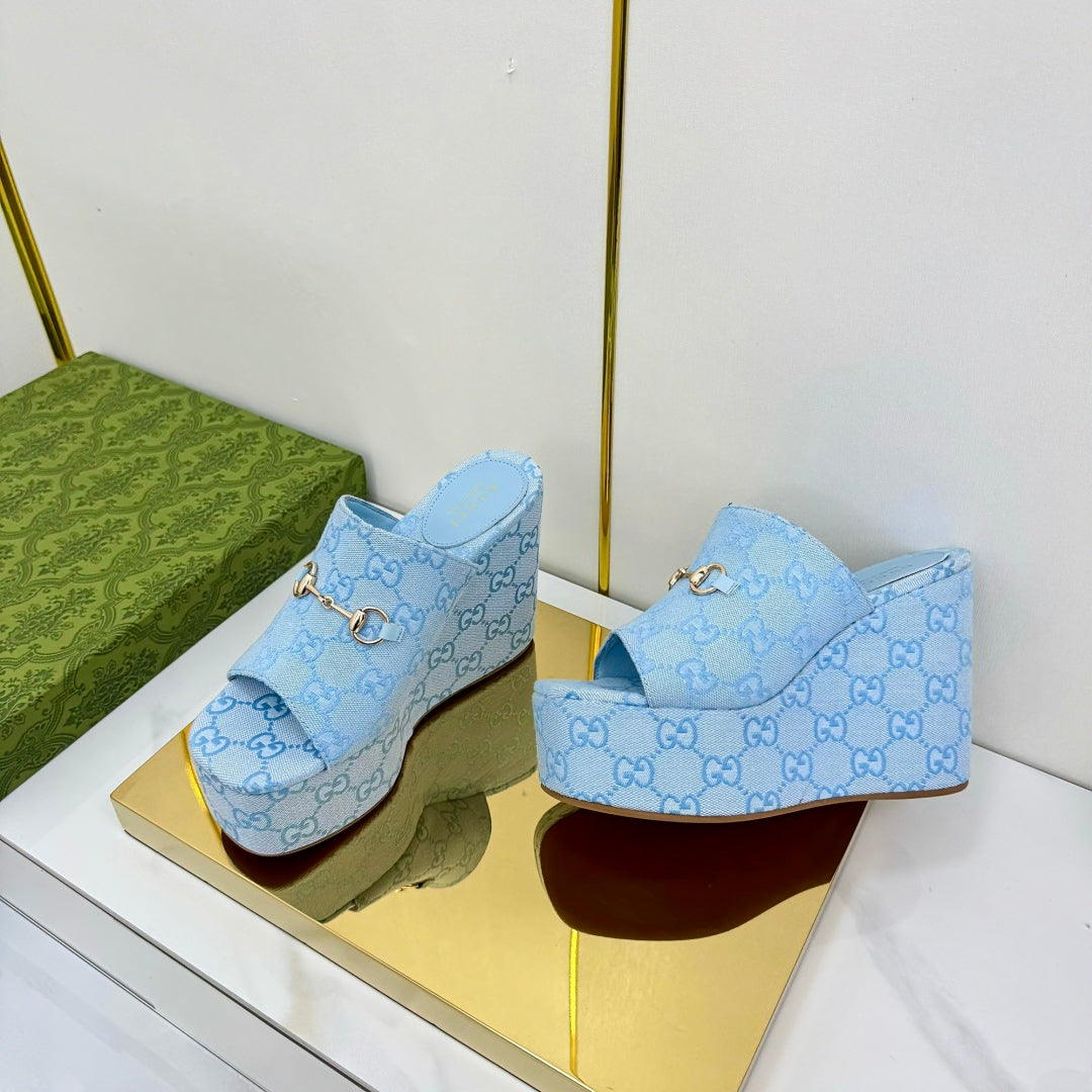 GG WEDGE SLIDES 110 IN SKY BLUE FABRIC WITH GOLD HARDWARE
