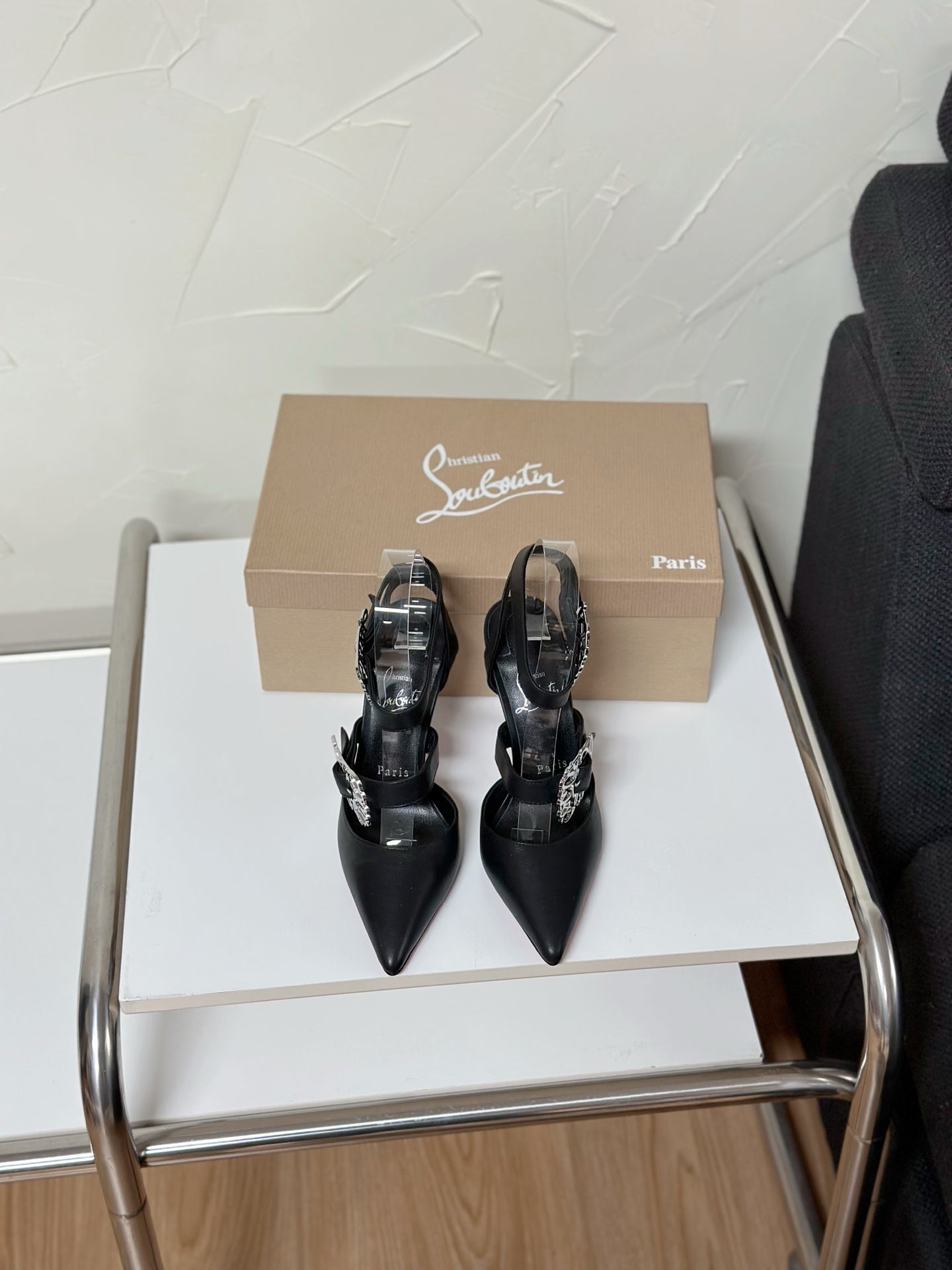 GIDDYLINA LARGE METAL BUCKLES STRAP PUMPS IN BLACK CALFSKIN