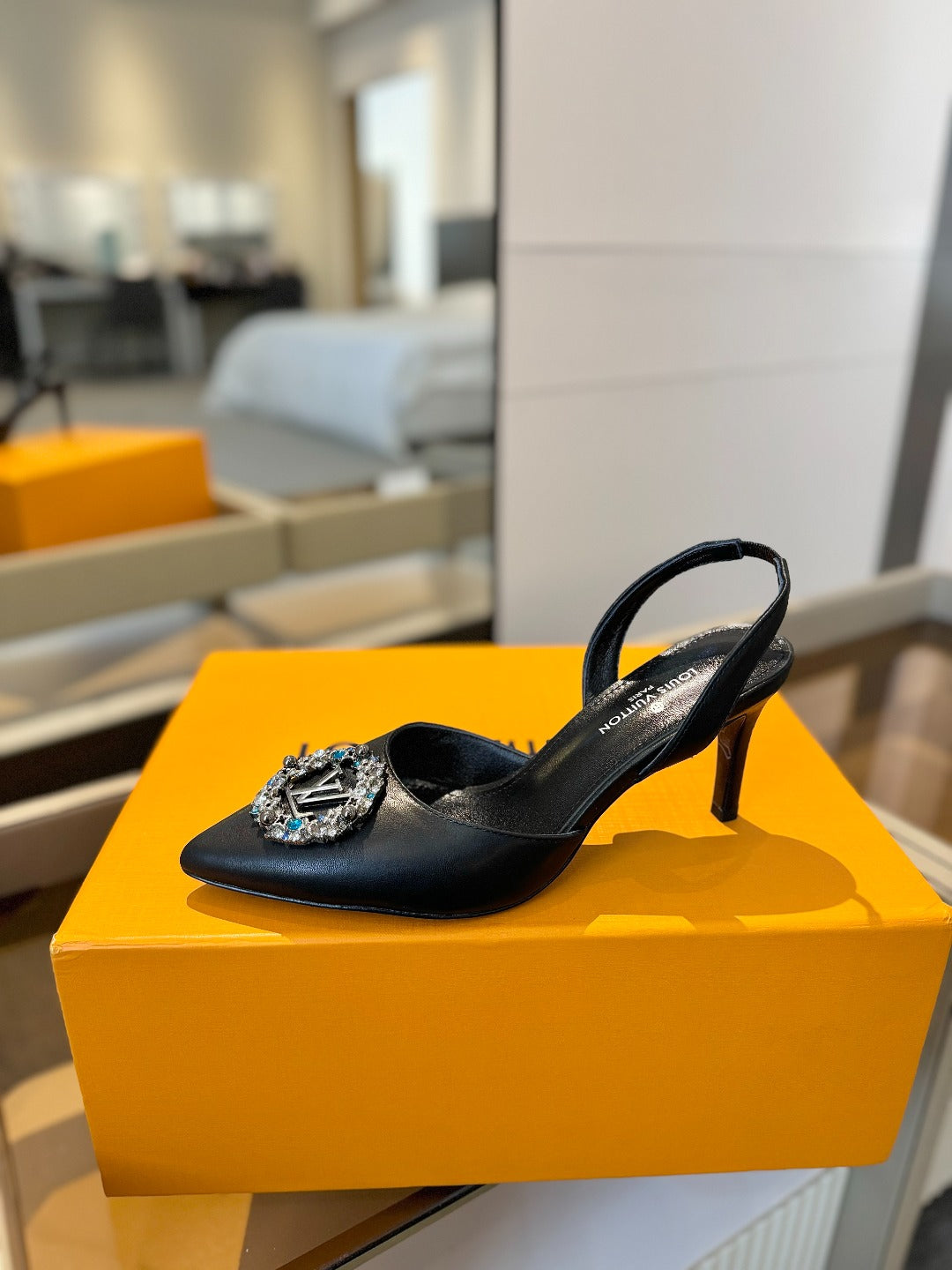 HIGH HEEL 75 MM SLINGBACK IN BLACK CALFSKIN WITH CRYSTAL