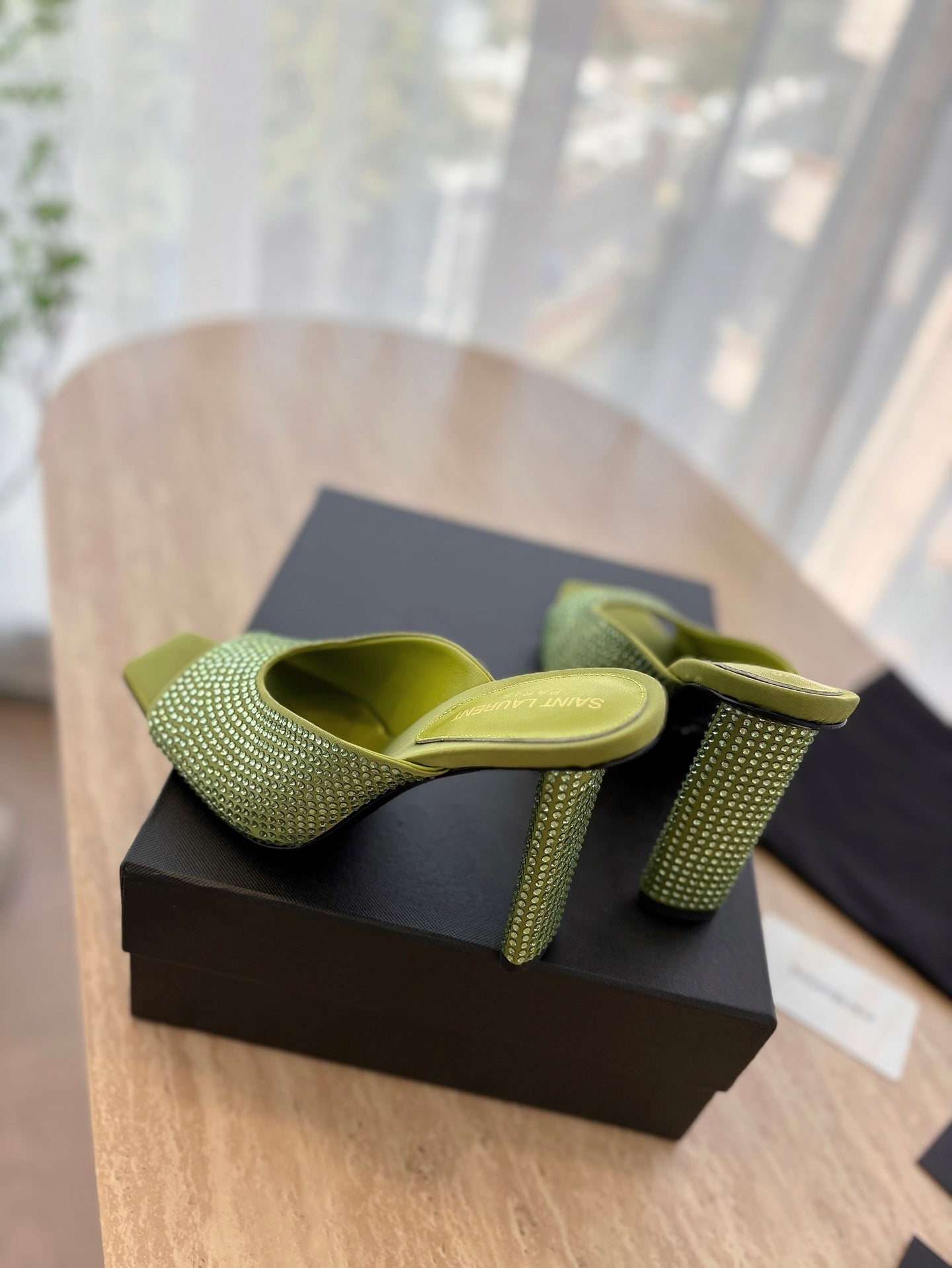 HIGH HEEL BLONDE MULE 10 CM IN OLIVE GREEN SATIN WITH RHINESTONES