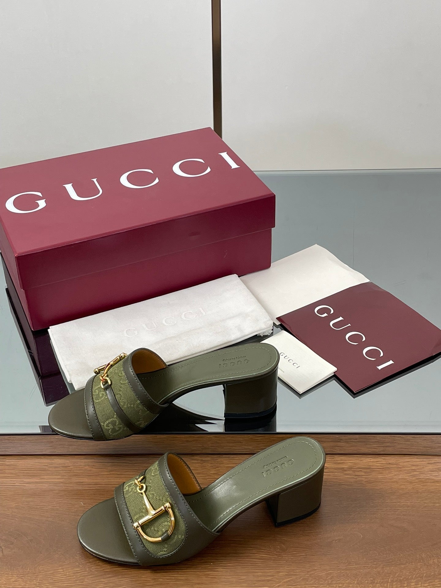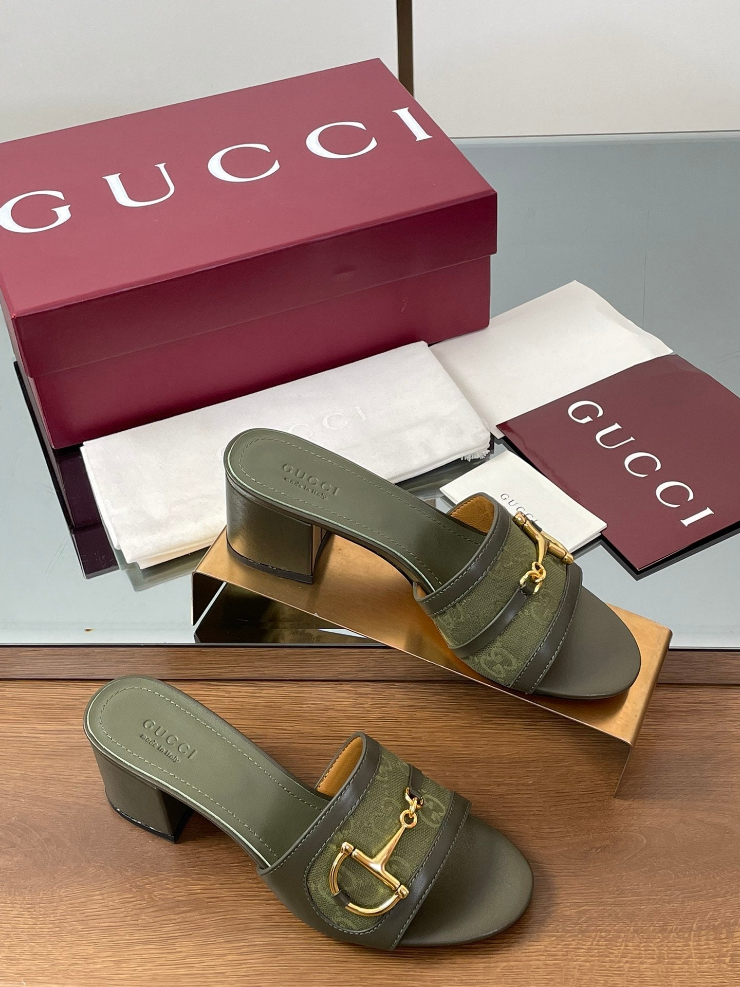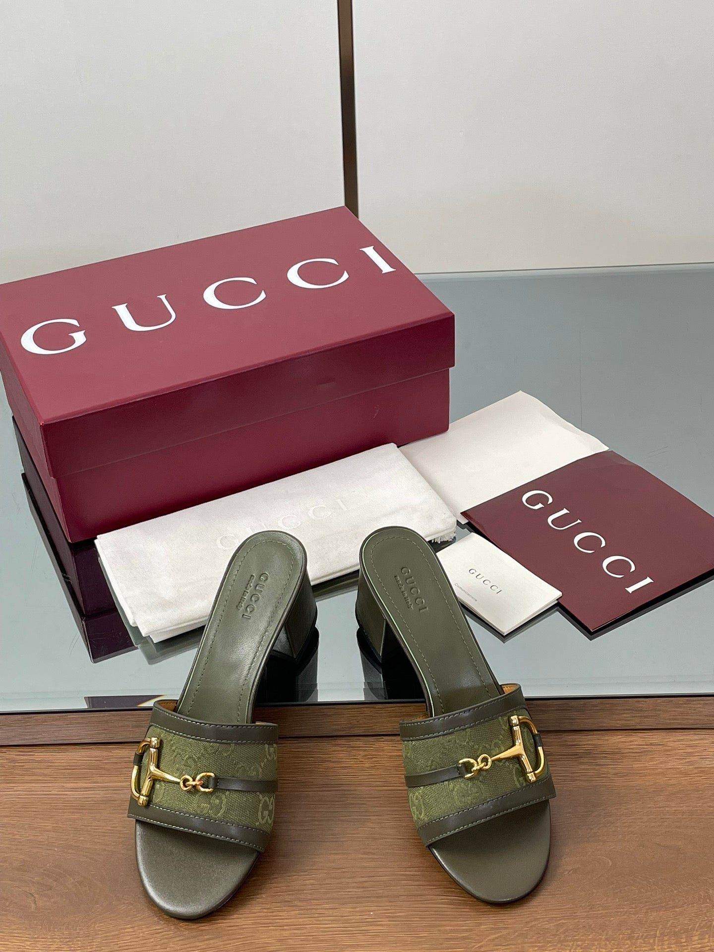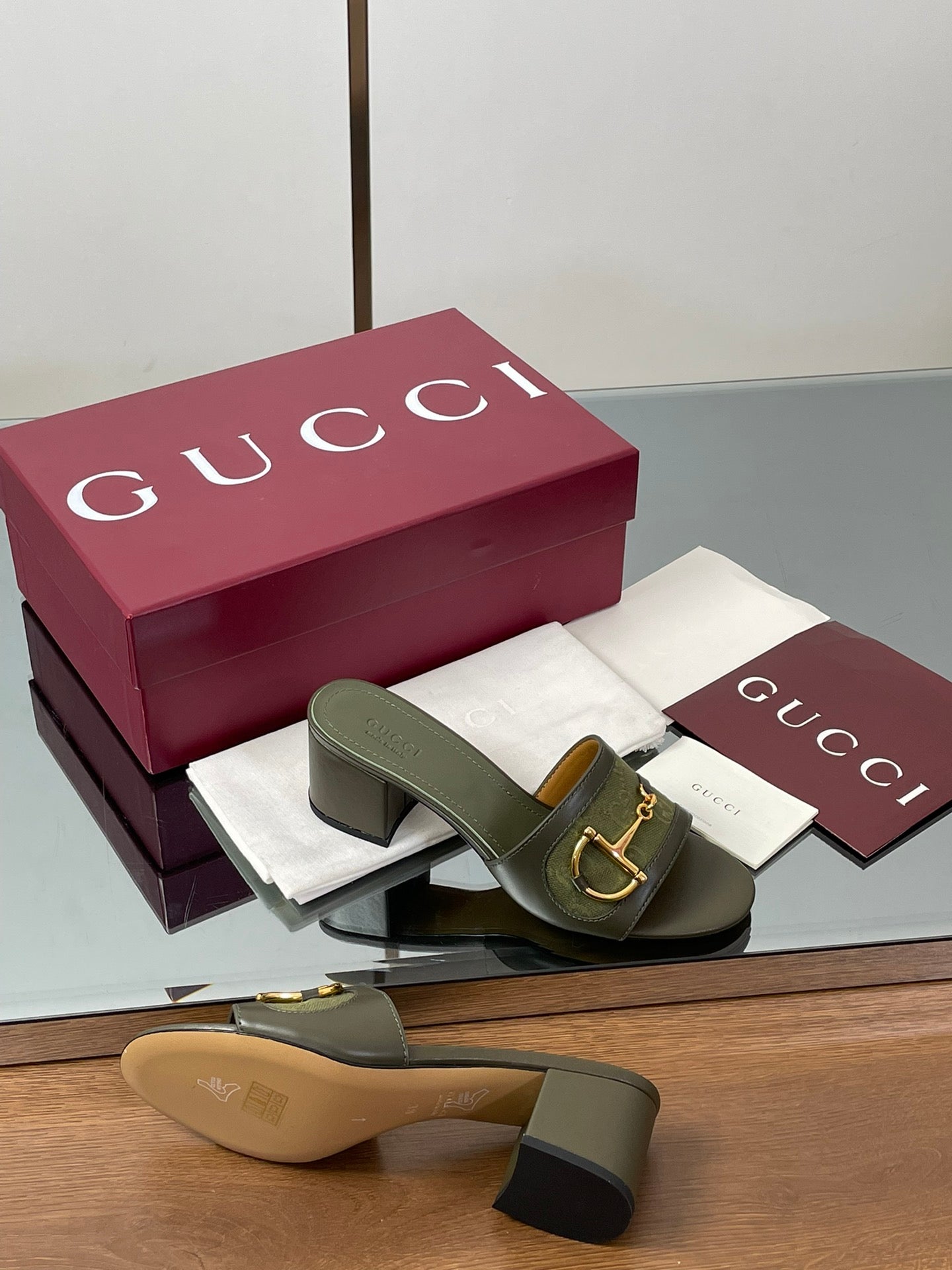 HIGH HEEL MULE 5.5 CM IN MOSS GREEN CALFSKIN MIX FABRIC AND GOLD HARDWARE