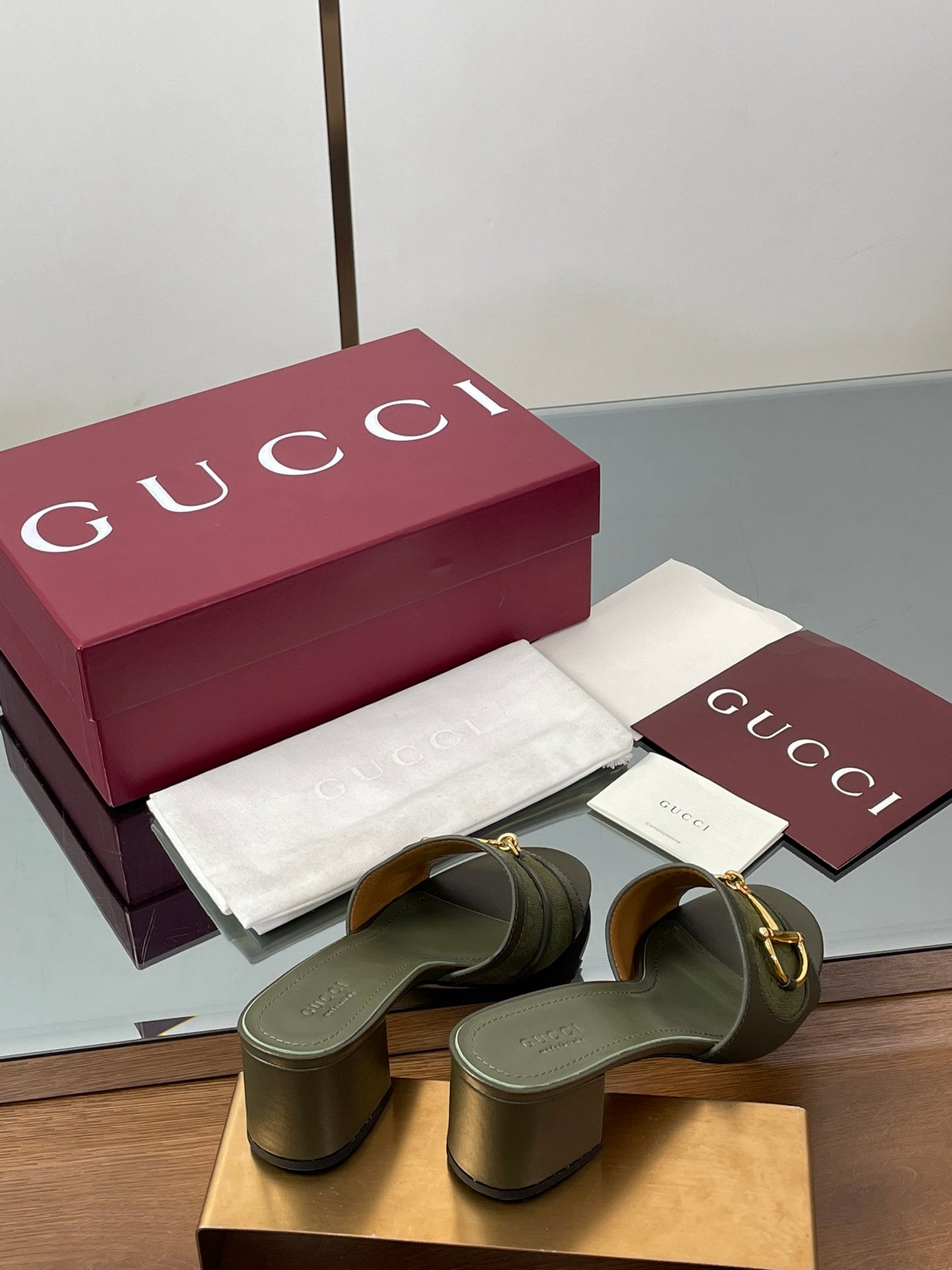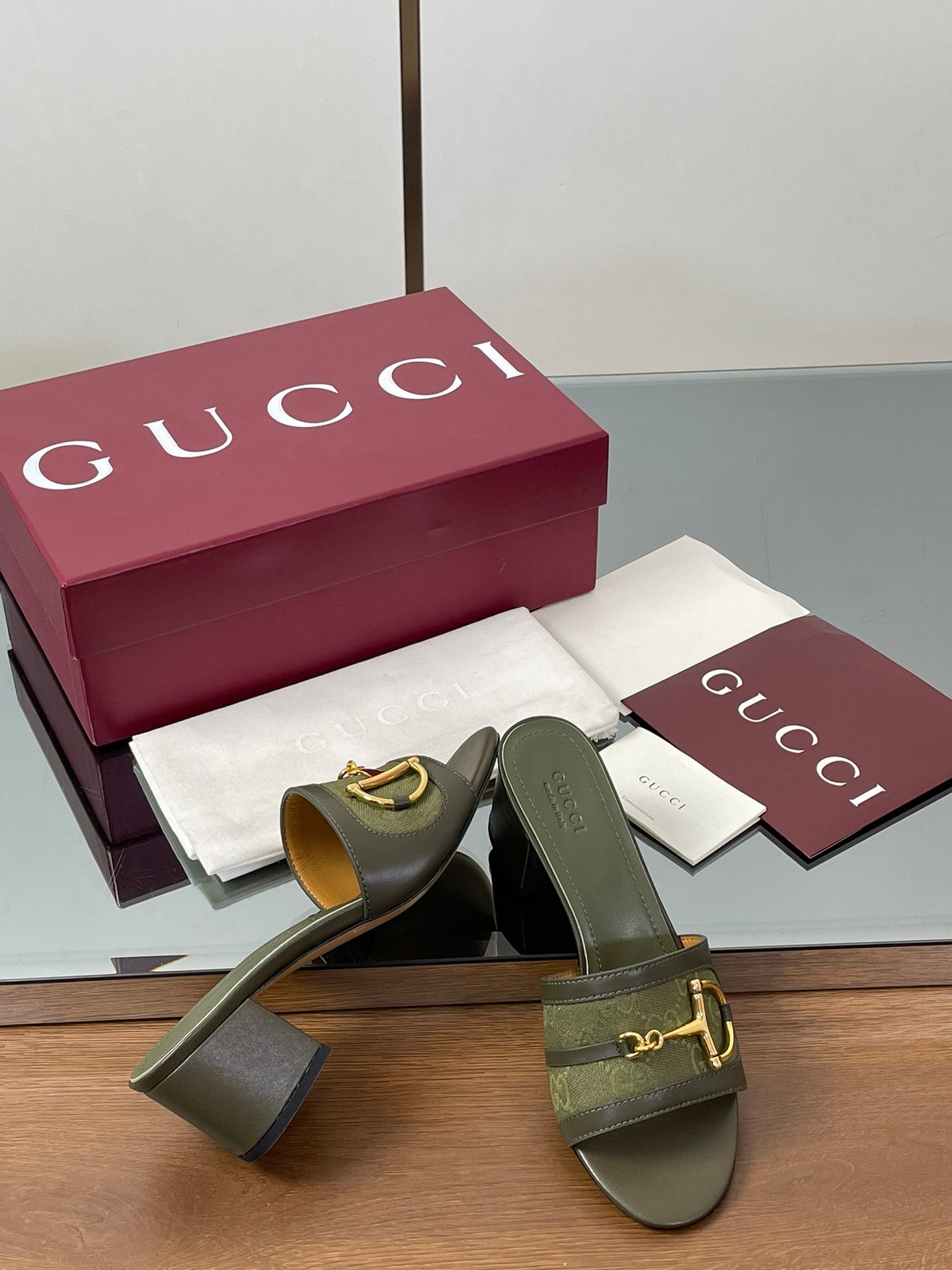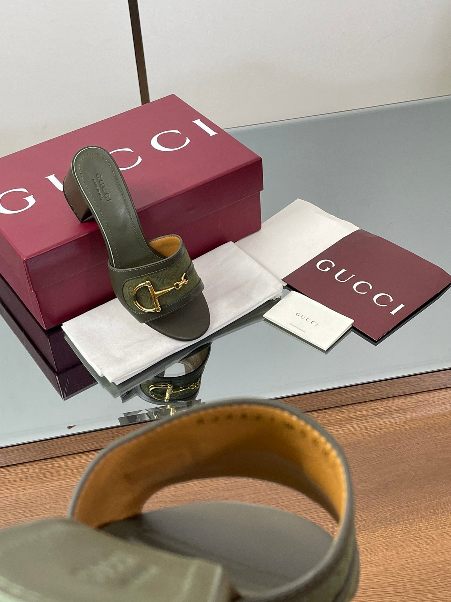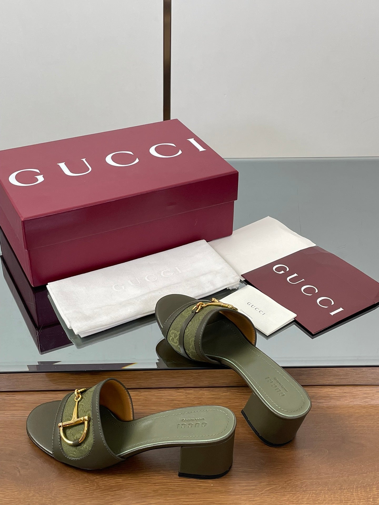 HIGH HEEL MULE 5.5 CM IN MOSS GREEN CALFSKIN MIX FABRIC AND GOLD HARDWARE