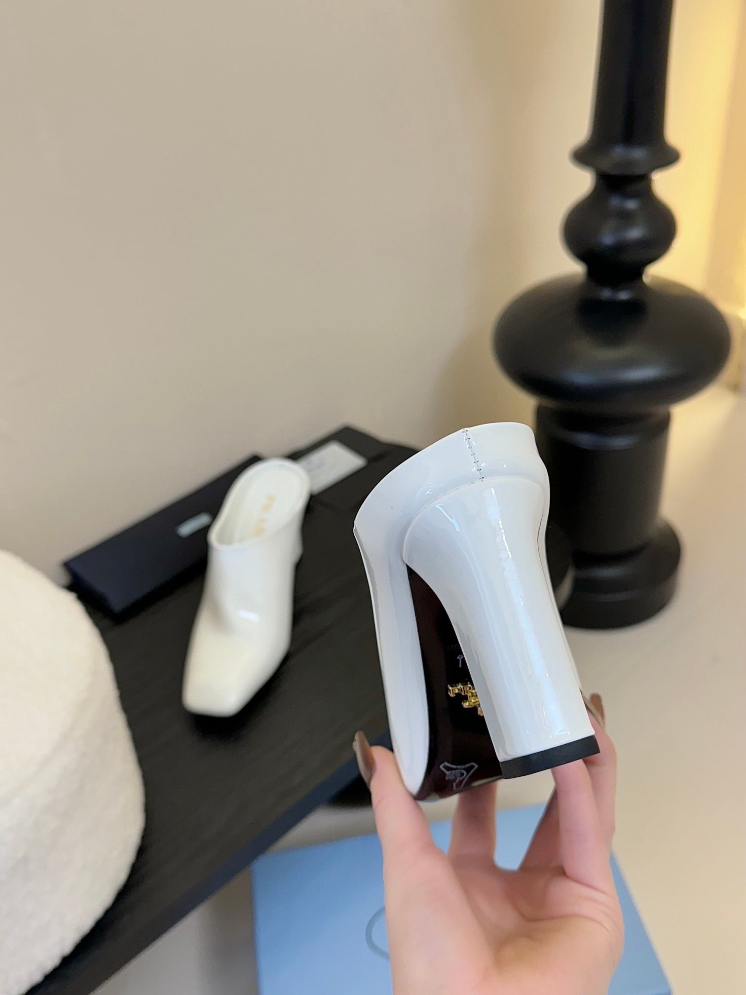 HIGH HEEL MULES WITH GOLD LETTERING LOGO IN WHITE GLOSSY CALFSKIN